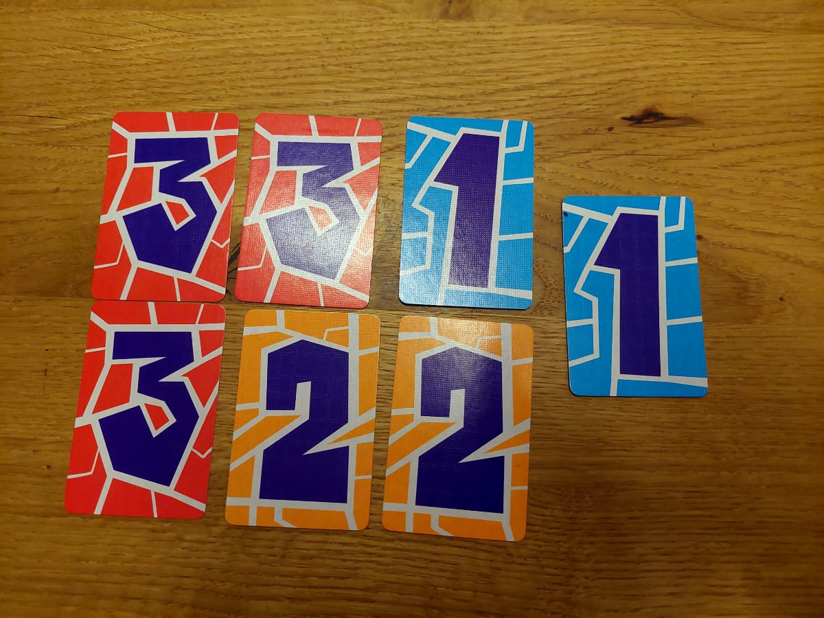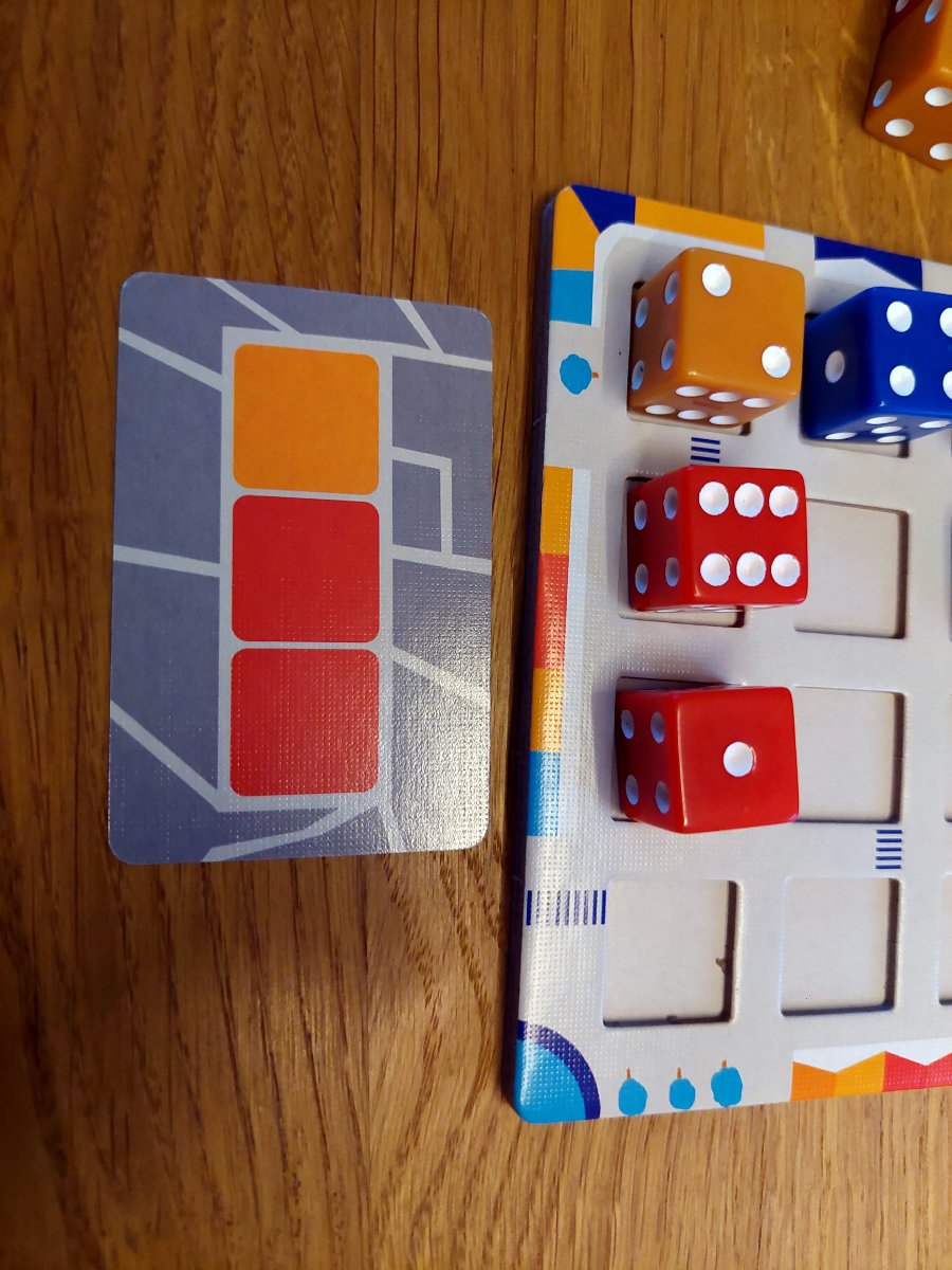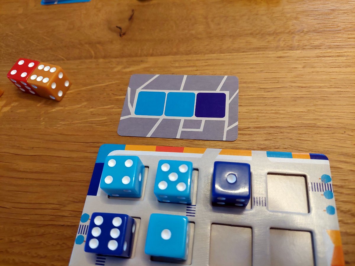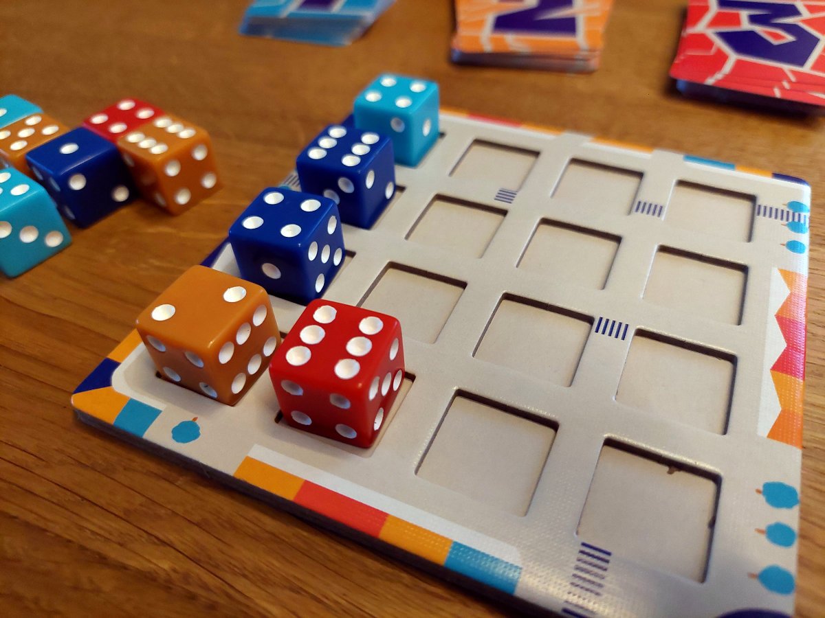 Der Startspieler wirft einmal alle 12 Würfel und legt sie dann für alle griffbereit – die Ergebnisse dürfen nicht mehr verändert werden! Einmal dürfte erneut geworfen werden, dann muss das Ergebnis akzeptiert werden. Nun wählt er einen Würfel und legt diesen auf ein beliebiges Feld des 4×4-Rasters (2×2 bei 2 Spielern). Danach folgen die Mitspieler, welche ebenfalls immer nur einen Würfel wählen und platzieren. Jeder versucht dabei die Würfel so abzulegen, dass eine (oder vielleicht sogar mehrere) seiner Aufgabenkarten erfüllt werden (können). Gelegentlich kommt es vor, dass Mitspieler die Würfel so arrangieren, dass man selbst eine Aufgabe ohne weiteres Zutun lösen kann^^. Wurden Aufgaben erledigt, zieht man Karten nach, bis man wieder 4 auf der Hand hat, wobei es erneut egal ist, von welchem Schwierigkeitsgrad man sie wählt. Die Aufgaben sind dabei entsprechend ihres Levels Punkte wert (1, 2, 3) und am Ende gewinnt, wer die meisten hat.