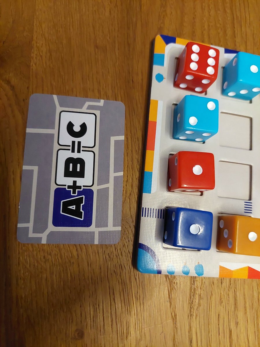 In der bunten Punktestadt müssen die Spieler Aufgabenkarten erledigen, indem sie Würfel in der richtigen Kombination auslegen. Die Aufgaben sind dabei in drei Schwierigkeitsstufen vorhanden, von denen man zu Anfang je eine Karte plus eine beliebige Karte ziehen muss. Die einfachen Aufgaben verlangen nur bestimmte Farben, die Würfelaugen sind egal – gelegt werden alle Würfel immer orthogonal. Die mittlere Schwierigkeit erwartet eine Summe und ein Würfel muss einer vorgegebenen Farbe entsprechen. Die dritte und schwierigste Aufgabenart gibt eine Summenrechnung vor, die per Würfelaugen stimmen muss und eine Farbreihenfolge vor (Bsp.: A – B = C, A muss ein blauer Würfel sein -> blaue 6, eine 2, eine 4).