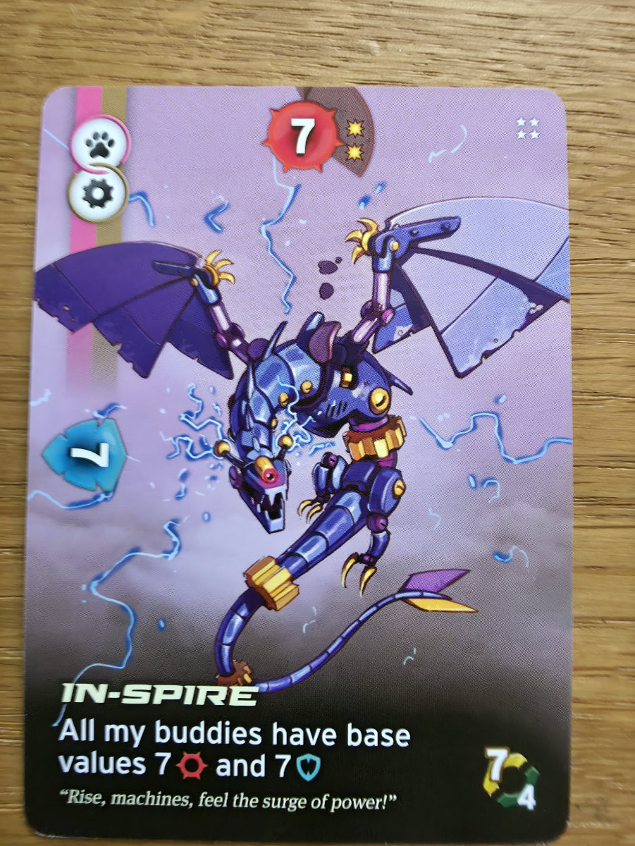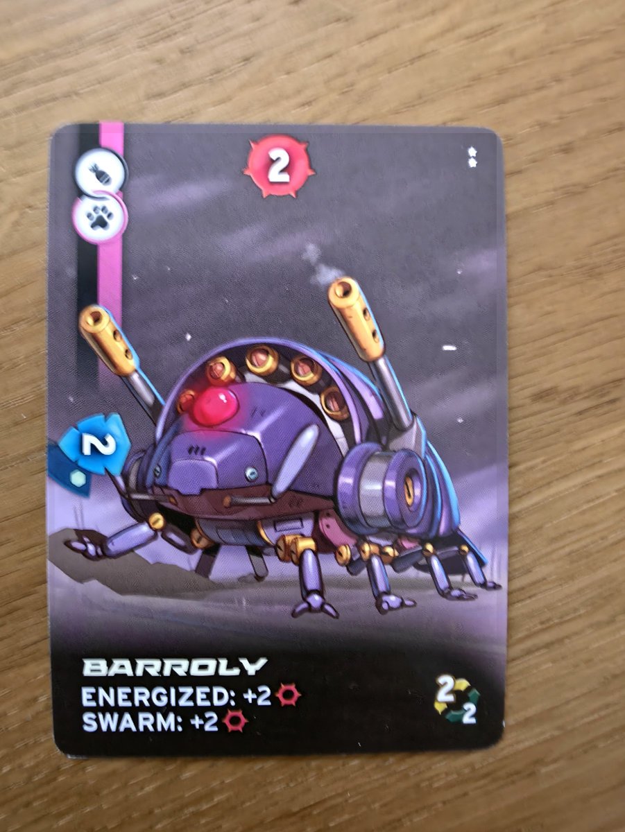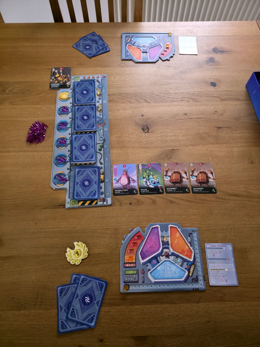 Gekämpft wird in der 2. Phase und zwar rundenweise abwechselnd im oder gegen den Uhrzeigersinn. Dazu nimmt jeder seine Bot-Karten, mischt sie und legt sie als verdeckten Nachziehstapel vor sich ab. Der Startspieler deckt dann die erste Karte auf und entscheidet sich die Karte für einen Angriff (roter Wert) oder zur Verteidigung (blauer Wert) zu nutzen.