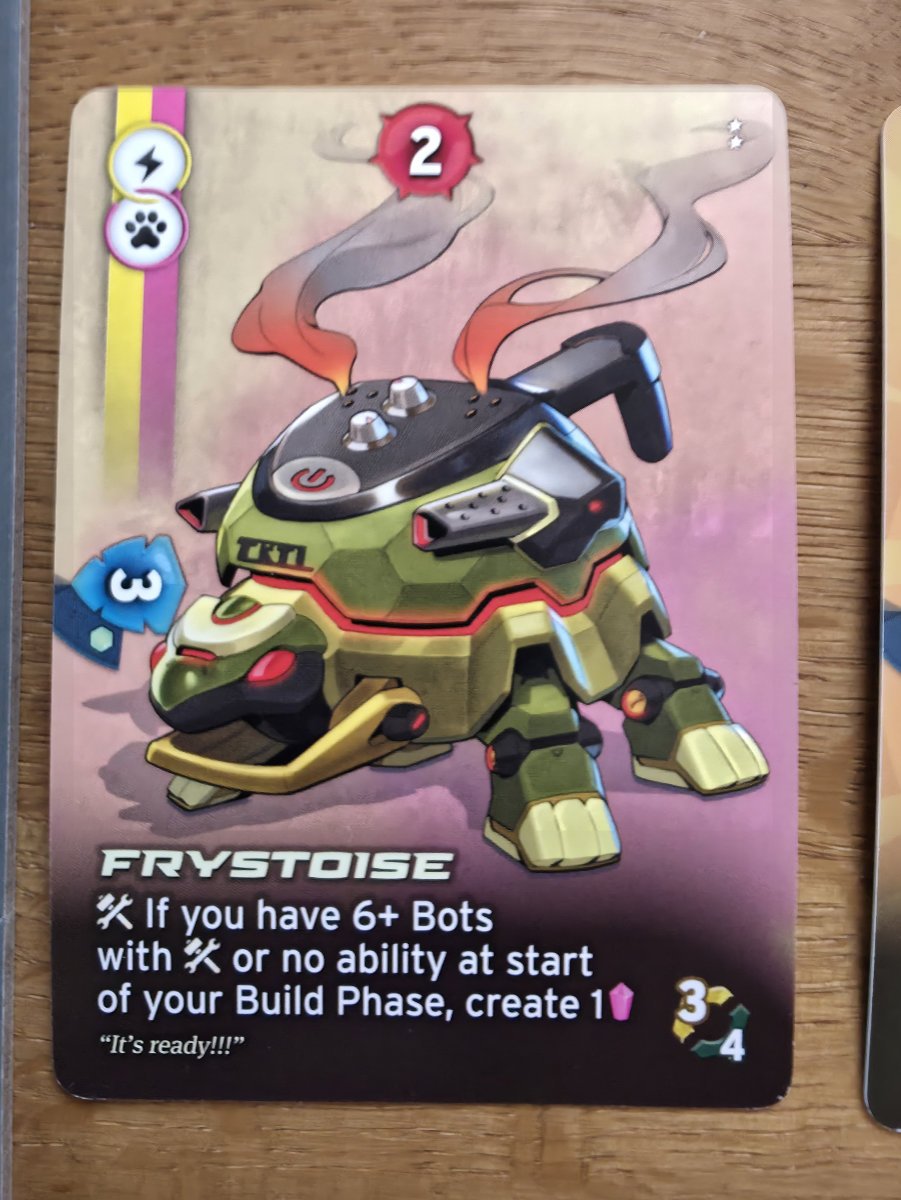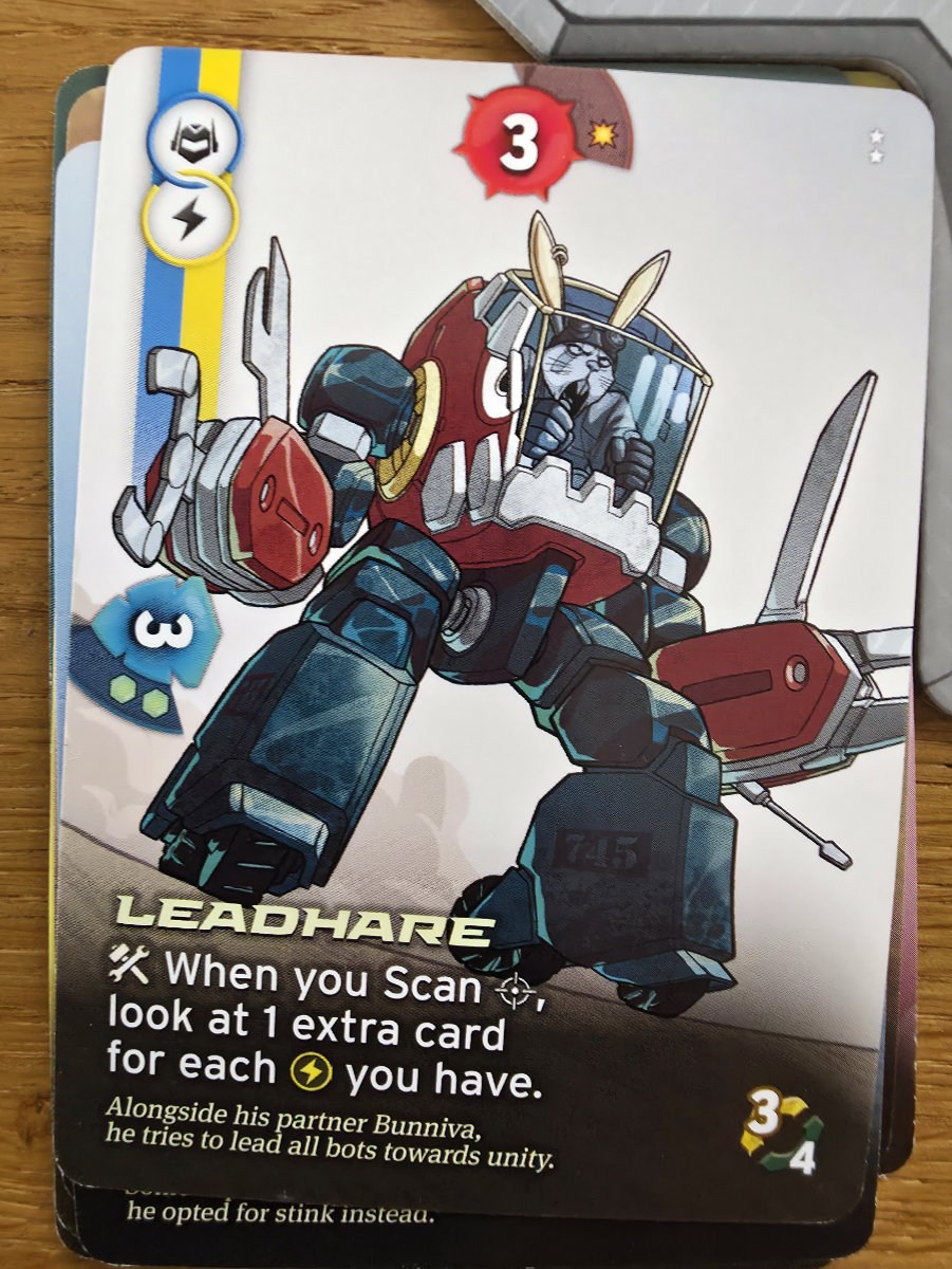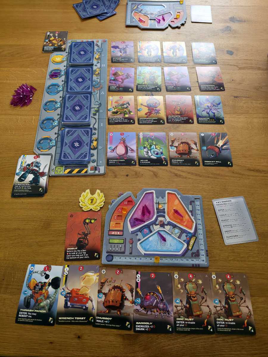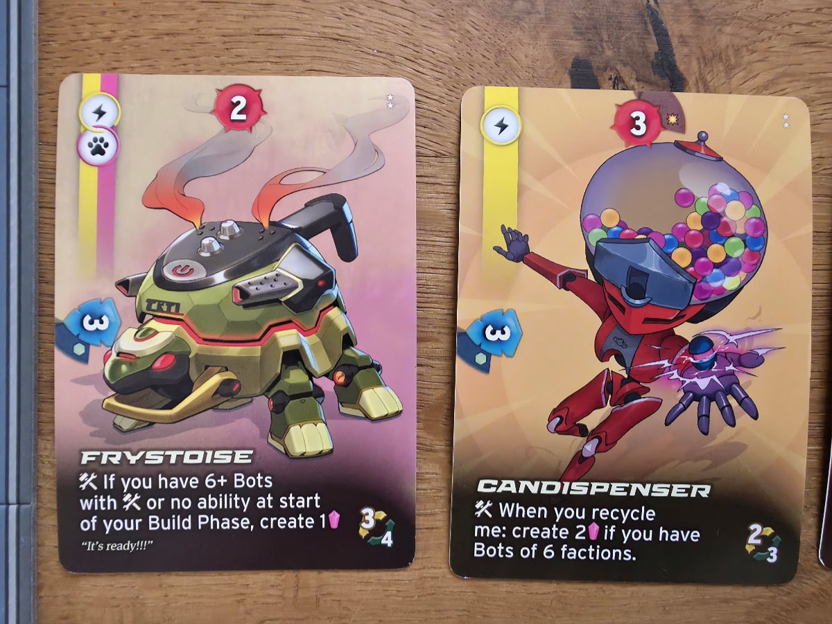 Eine Runde verläuft so, dass jeder erstmal Schrott gemäß der Rundenzahl erhält, also in der ersten Runde 1 Schrott – man kann auch vorhandene Karten für Schrott verkaufen. Mit dem Schrott kann man dann in der Bauphase neue Bot-Karten aus der Auslage (Labor) kaufen. Höherwertige Karten werden erst ausgelegt, wenn jemand seine Werkstatt entsprechend einem Upgrade unterzogen hat (per 3 Schrott gibt es ein Upgrade, 4 Level insgesamt). Diese können dann zwar alle sehen, aber kaufen darf diese nur, wer über den passenden Werkstatt-Level verfügt. Schrott verfällt übrigens nach jeder Runde, man kann diesen also nicht aufsparen.