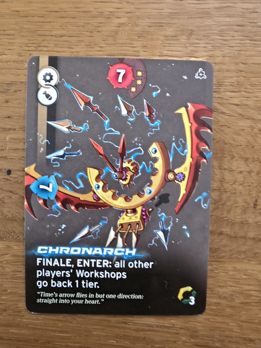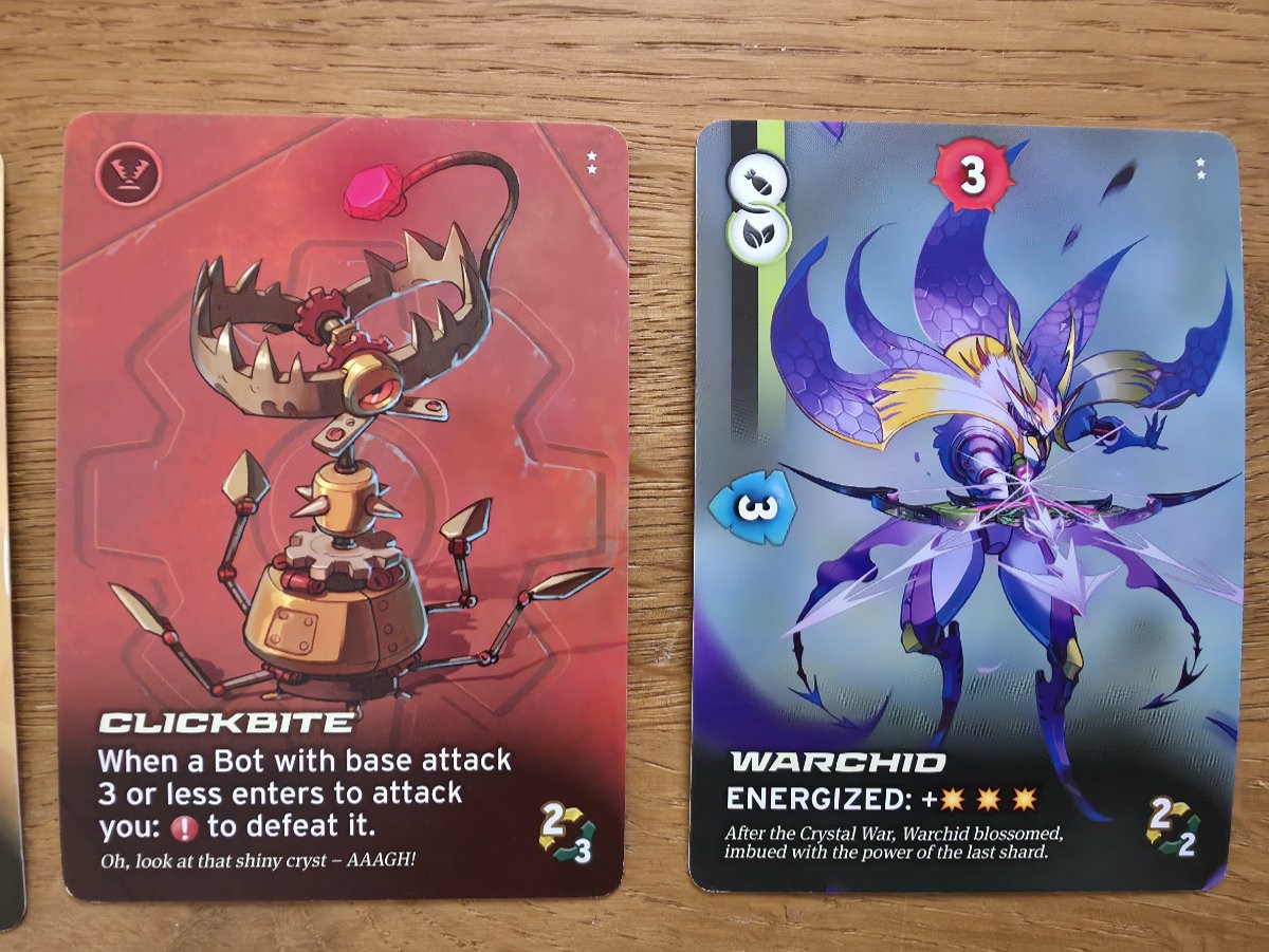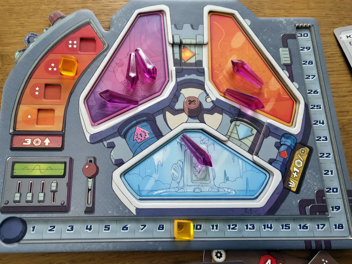 Die Werkstatt bietet zudem noch drei Lagerbereiche für die zu erobernden Kristalle. Ein normales Lager, hier werden die Kristalle erstmal abgelegt, dann einen Reaktor in den Kristalle verschoben werden können, um so pro Kristall einen Schrott zu produzieren und/oder per Abgabe eines Schrotts kann der aktuell zugängliche Kartennachziehstapel gescannt werden, d.h. man nimmt sich die obersten 2 Karten und schaut sie sich heimlich an. Und einen Cryo-Bereich, in den die Kristalle aus dem Reaktor heraus geschoben werden. Nach einem Kampf darf der Sieger hier heraus Kristalle ins Lager verschieben.