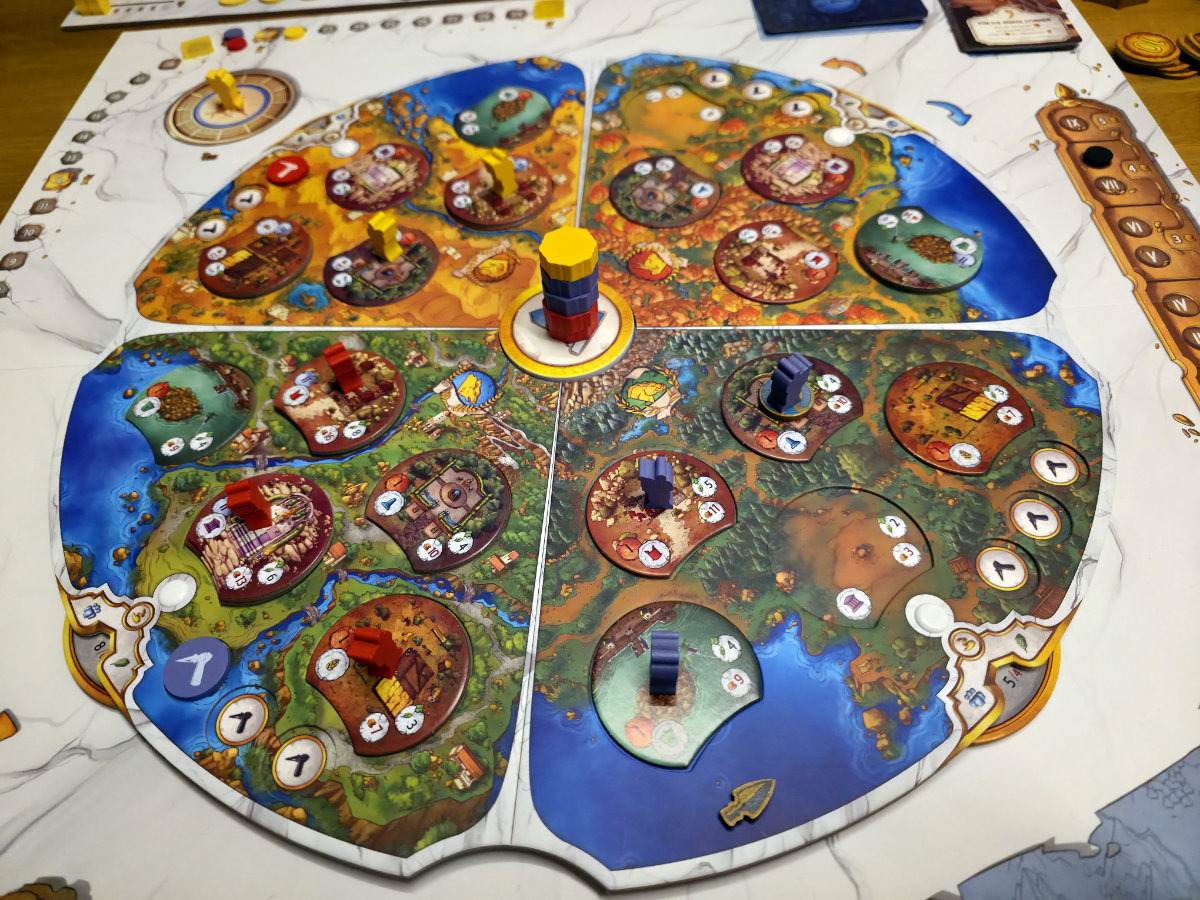 Der drehbare Spielplan hat natürlich was und die damit einhergehende Ungewissheit, wo man wann welche Aktionen durchführen kann ist spannend. Optisch tut sich auch einiges und die Spielkomponenten sind allesamt wertig. Die Anleitung ist ein wenig holprig, aber es genügt um ins Spiel zu kommen und nach ein, zwei Runden passt es dann auch.
