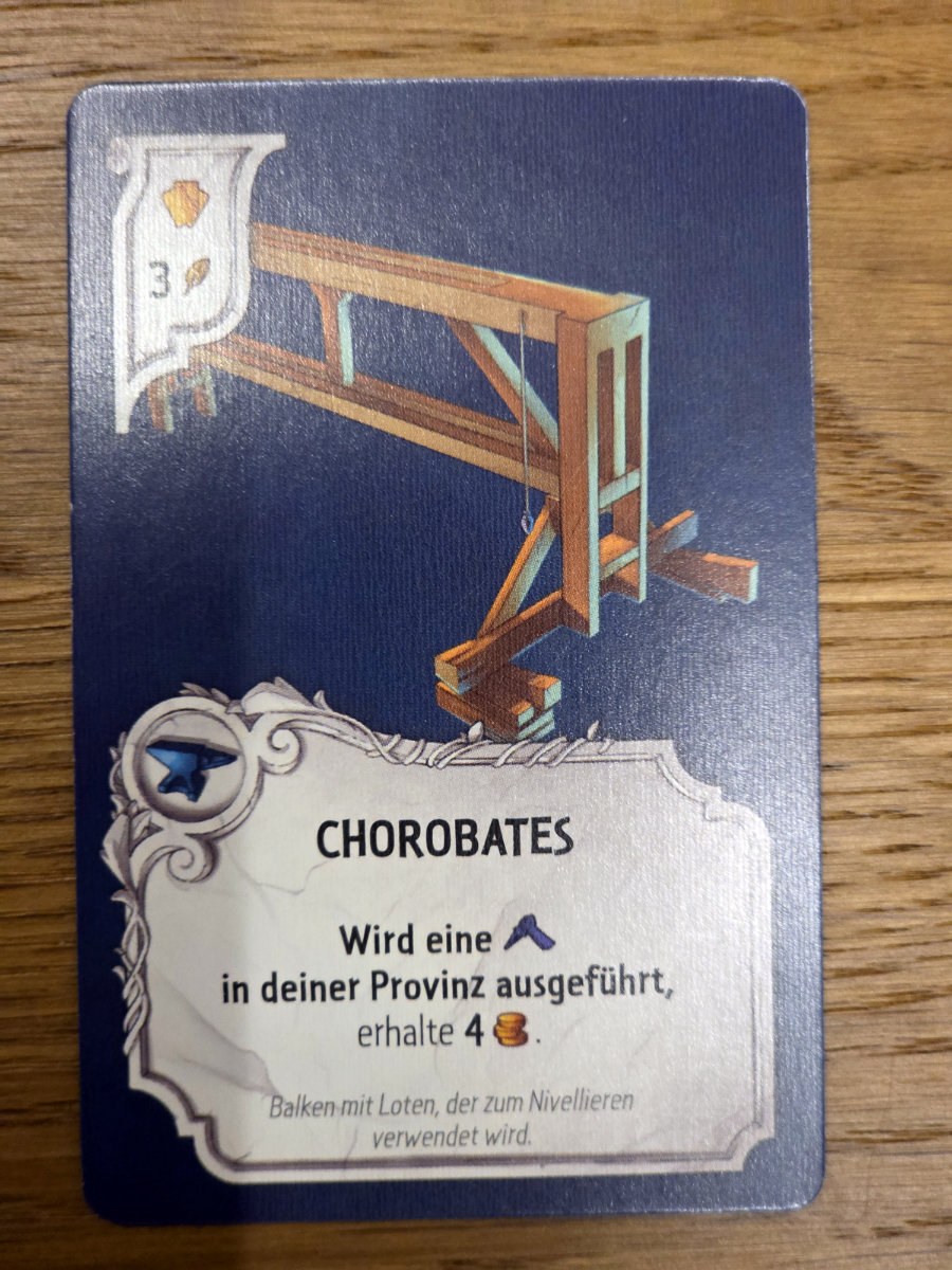 In der zweiten, der Bauphase, werden in der vor einem liegenden Provinz Gebäude (je 5 Baufelder) platziert, so denn gewollt und gekonnt^^. Für den Bau erhält man direkt Punkte. Man legt hiermit auch fest, welche Aktionen demnächst hier auszuführen sind, was für den potentiellen nächsten Spieler, der diese Provinz besucht interessant sein dürfte – wobei der Plan sich nicht immer brav in Reihenfolge dreht, durch die Intrigen erfährt man erst, wie der Plan wandern wird (links, rechts, einmal, mehrmals).
