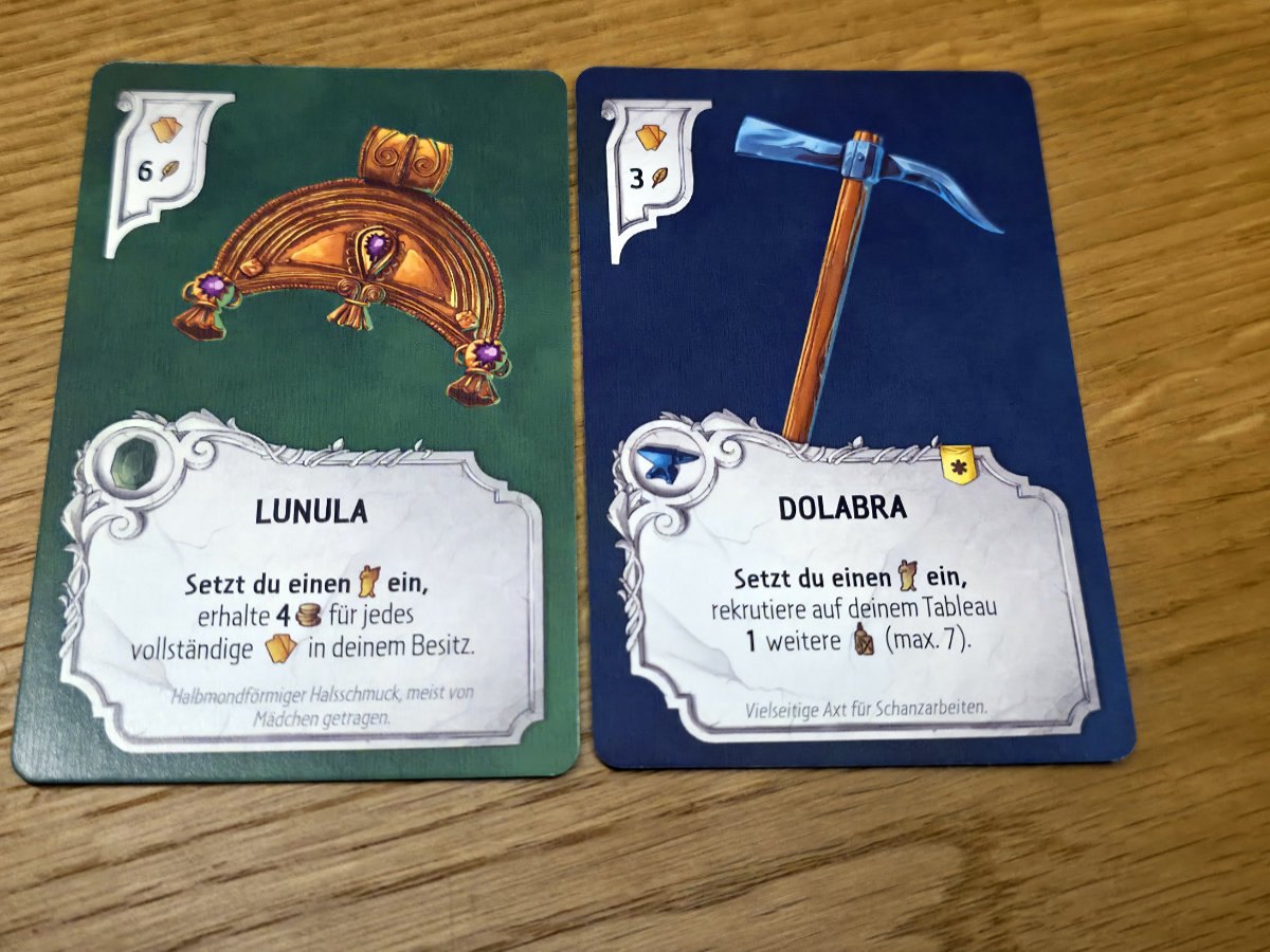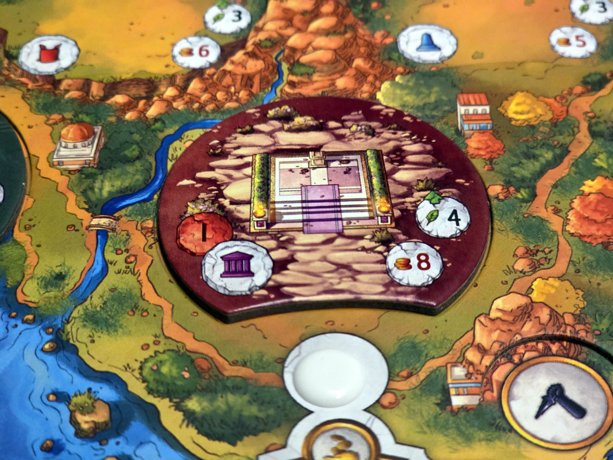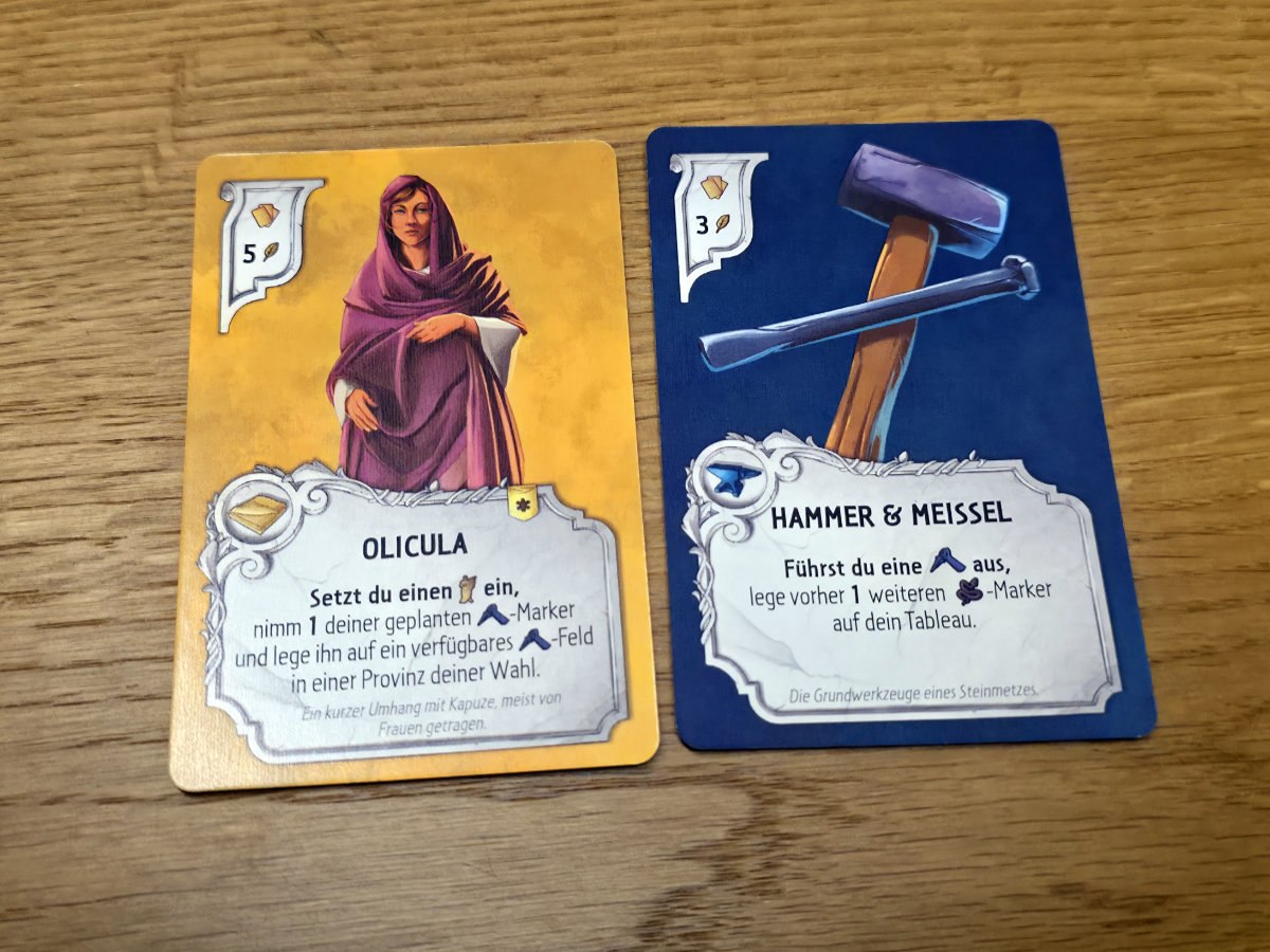 Alles immer im Hinblick auf Mehrheiten (Senat, Legionen) bzw. im Wettlauf (Pantheon), muss man seine Pläne immer gut anpassen, da ja nie wirklich bekannt ist, welche Provinz als nächstes zu begutachten ist. Im Laufe des Spiels natürlich, lässt sich in jeder Provinz etwas tun, da diese dann nach und nach ausgebaut sind – Gebäude übrigens in drei Stufen, so können sie dann mehrfach genutzt werden und bieten u.U. auch Sondereffekte. Dieser Kern des Spiels entscheidet dann auch über Wohl und Wehen der Partie und bietet entsprechend viel Platz für taktisches Vorausschauen, um eben dem Zufall entgegen zu wirken.