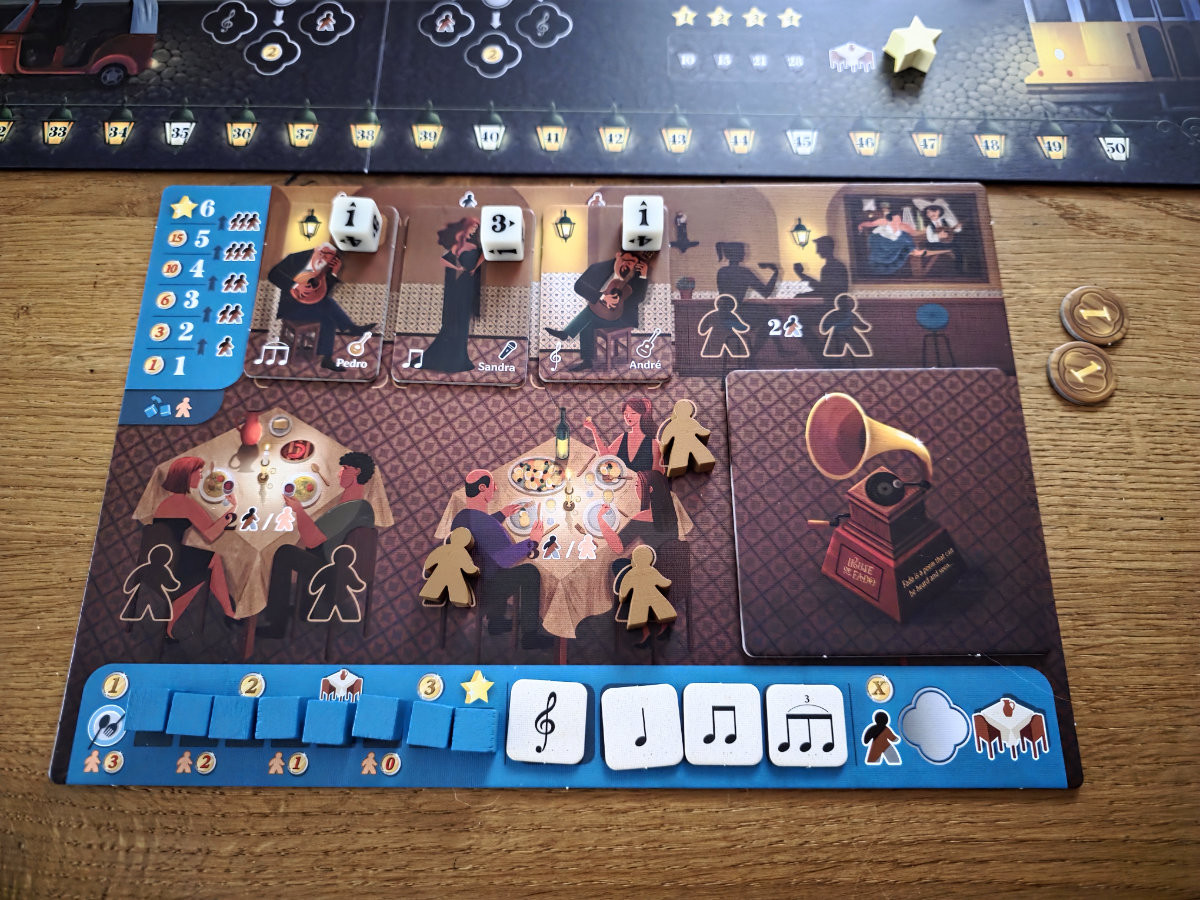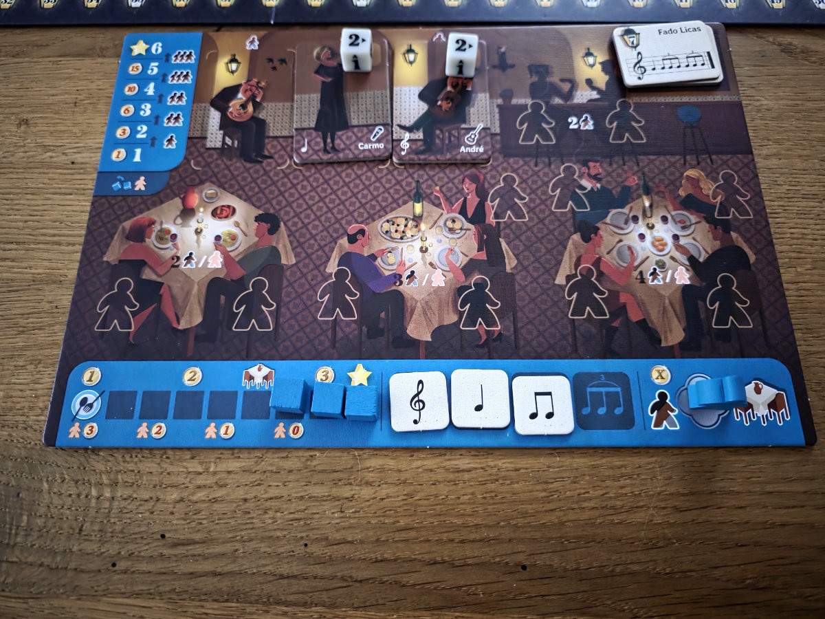 Ein jeder hat eine Restaurant-Tafel vor sich liegen, auf der die drei Musiker Platz finden und Notenplättchen abgelegt werden können (mit diesen komponiert man neue Fado-Lieder für Siegpunkte). Zudem werden hier die Gäste an die beiden zur Verfügung stehenden Tische gelegt (ein dritter Tisch muss erst noch freigeschaltet werden) – alle Tische bieten unterschiedlich Platz für Gäste – sowie möglicherweise an die Bar. Außerdem finden sich hier die 8 Rufwürfelchen (Renommé), welche nach und nach entfernt werden können und damit Boni freilegen. Für die Feierabend-Aktion ist hier auch ein Platz für einen Arbeiter-Meeple, welche den Tag für den Spieler beendet und u.a. Einnahmen bringt.