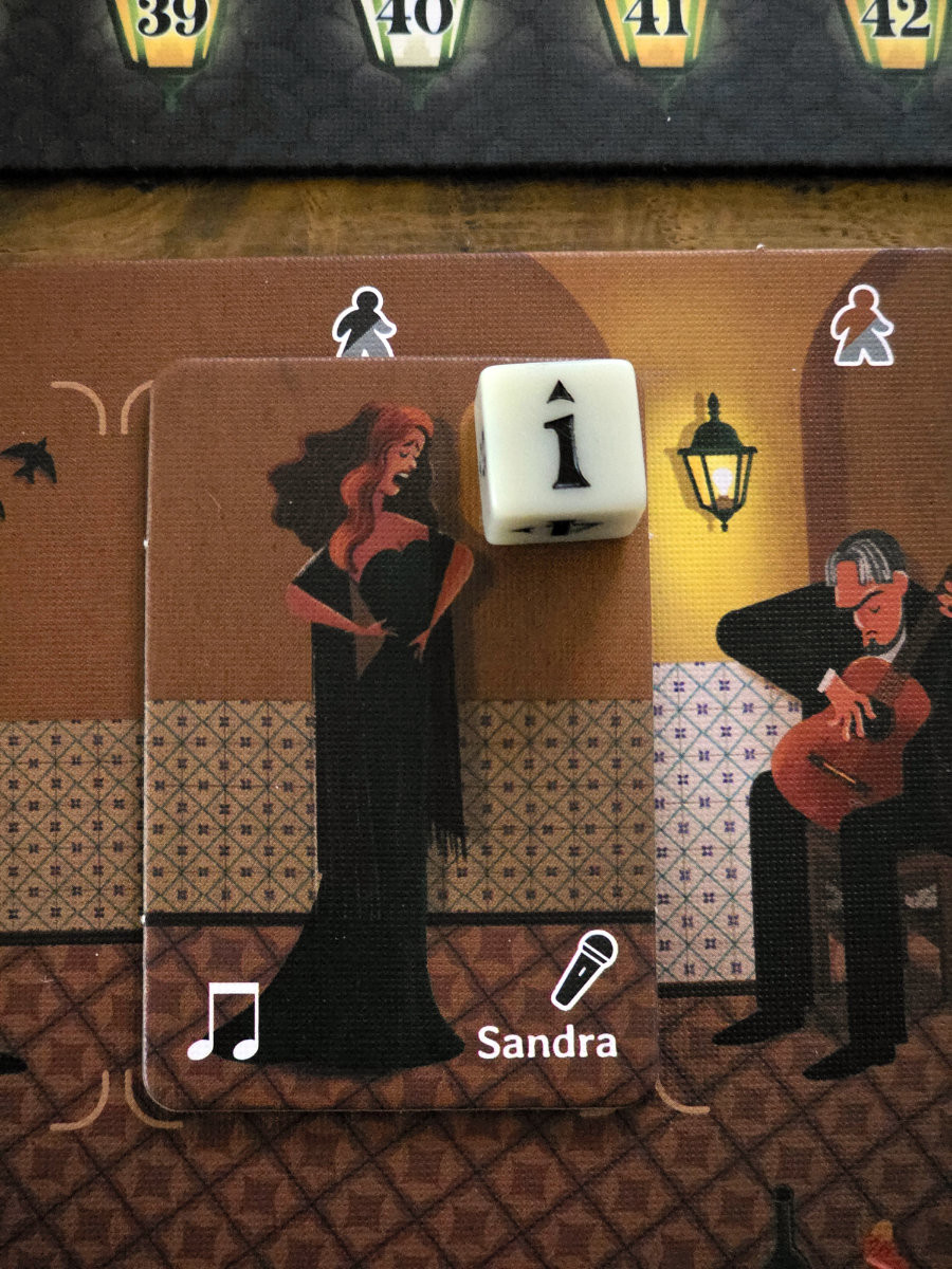 – per Plakatwand Werbung für das Lokal machen – wobei hier eher der Ruf der aushängenden Musiker gemeint ist. Dazu legt man einen Musiker ab Stufe 2 dort ab und legt eines der Rufwürfelchen anbei. Am Ende des Spiels gibt es Punkte für Mehrheiten dort.
