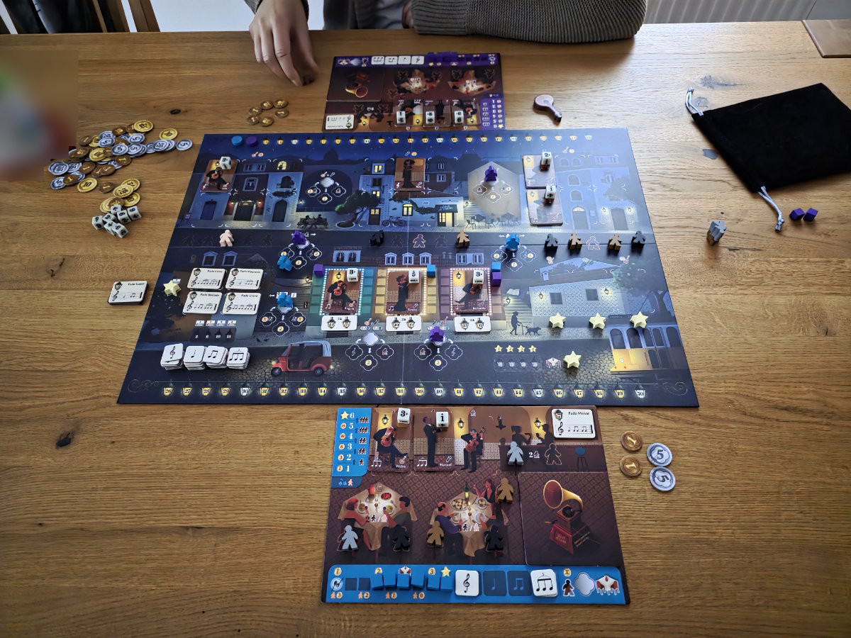 Auf einem Aktionsfeld (2 für den Musikermarkt, 2 für den Gäste“markt“, 1 für den Notenmarkt, 2 für den Plakatbereich) darf immer nur ein Meeple stehen. Stellt sich hier ein anderer Spieler hin, wird der vorherige Meeple auf sogenannte Ausweichfelder gestellt. Diese bieten sofortige extra Boni und i.d.R. versucht man zu verhindern, dass jemand diese erhält. Aber je nach Spielerzahl und/oder Vorgehensweise/Pläne muss hier in den sauren Apfel gebissen werden^^. Hier darf aber auch so lange nicht mit einem eigenen Meeple erneut hingegangen werden, bis auch auf dem Ausweichplatz kein eigener Meeple mehr steht – ein Aktionsbereich ist also derweil komplett gesperrt. So muss häufig um drei Ecken vorausgeplant werden, um an die gewünschten Aktionen zu gelangen, gerade wenn man z.B. häufig schnell mehrere Gäste haben will.