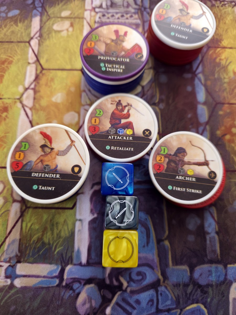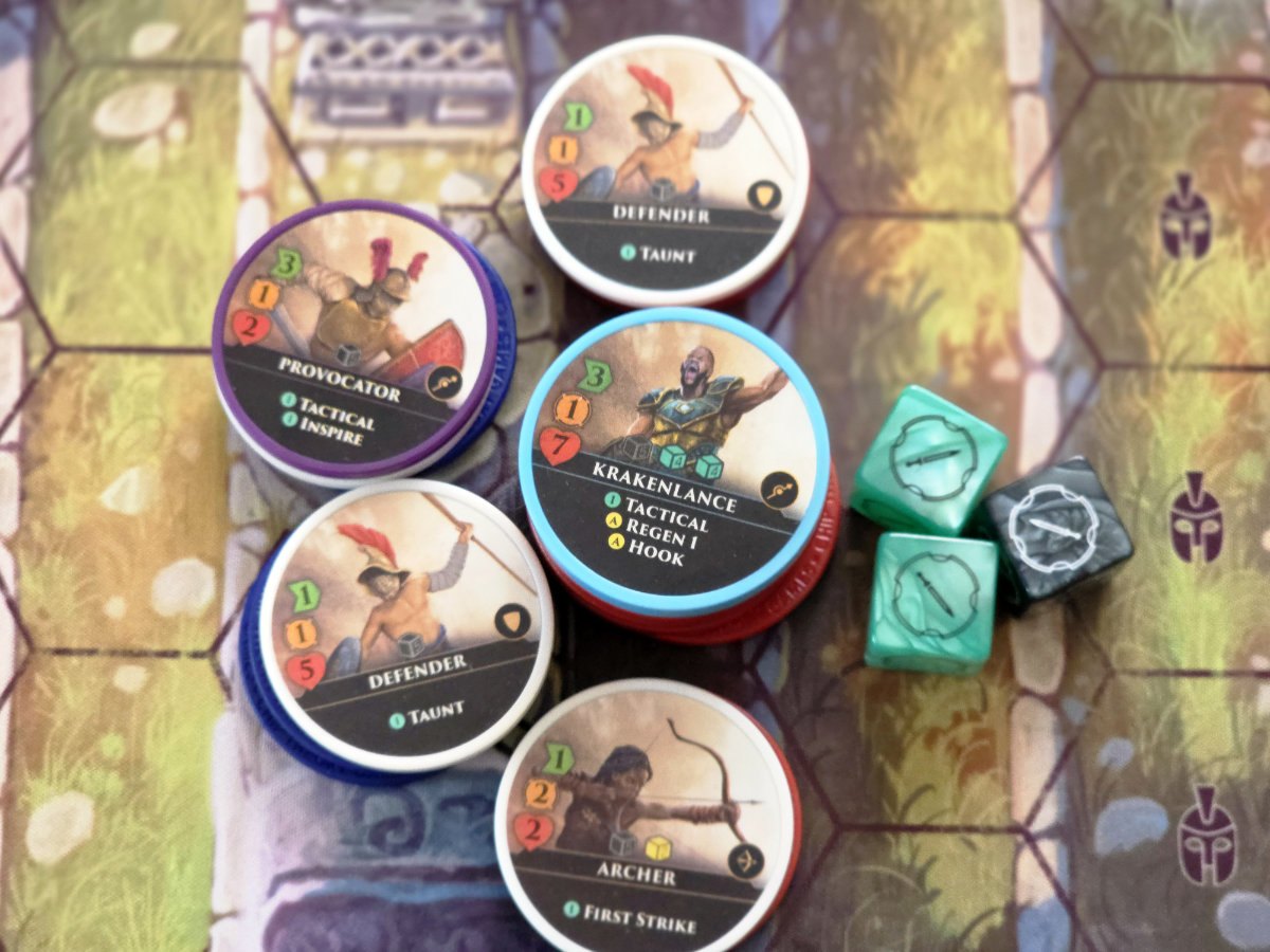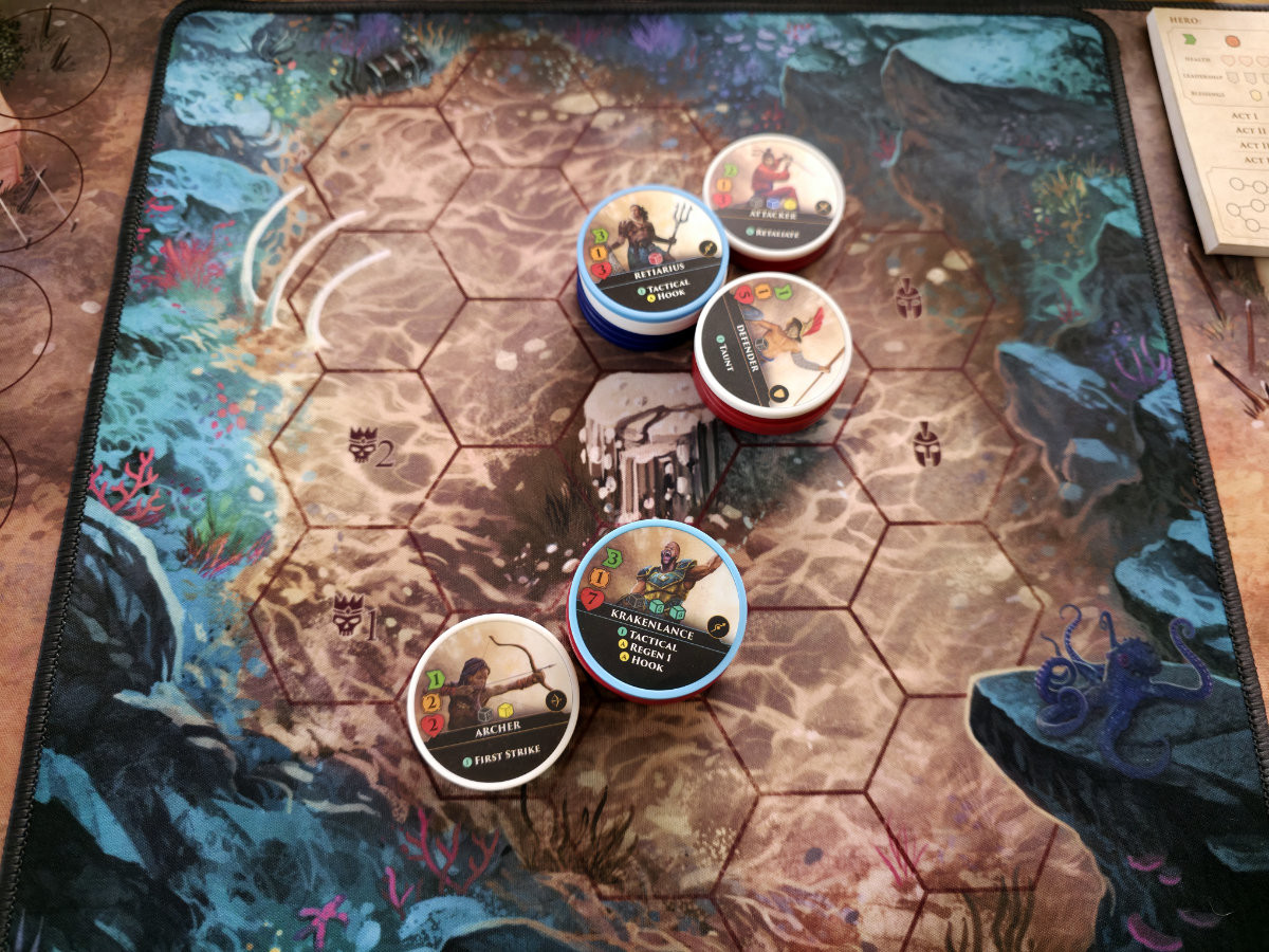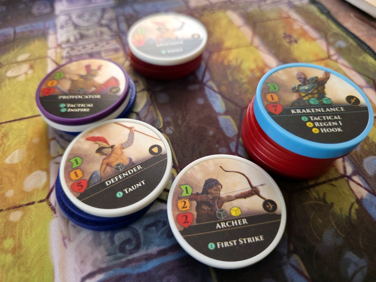 Da der jeweilige Endgegner und dessen Residenz bekannt ist, weiss man auch, wo man hin zu reisen hat und folgt entsprechend den Pfaden (gestrichelte Linien, die manchmal etwas schwer auszumachen sind) auf der Karte. An den jeweiligen Orten werden dann unterschiedliche Arenen und Begebenheiten offenbart. Je nach vorgegebenen Regeln wird entsprechend gekämpft und hoffentlich die erfolgreichen Taktiken gewählt. Sollte der Held doch einmal das Zeitliche segnen, stehen diesem 8 Segen zur Verfügung, durch die er wieder wundersam geheilt parat steht. Wie in Hoplomachus kommt es hier auch auf die geschickte Positionierung der eigenen Einheiten an, das richtige Quentchen Glück zu haben und die jeweils möglichen Spezialfähigkeiten bzw. -effekte von Einheiten oder eines Szenariokampfes zu beachten.