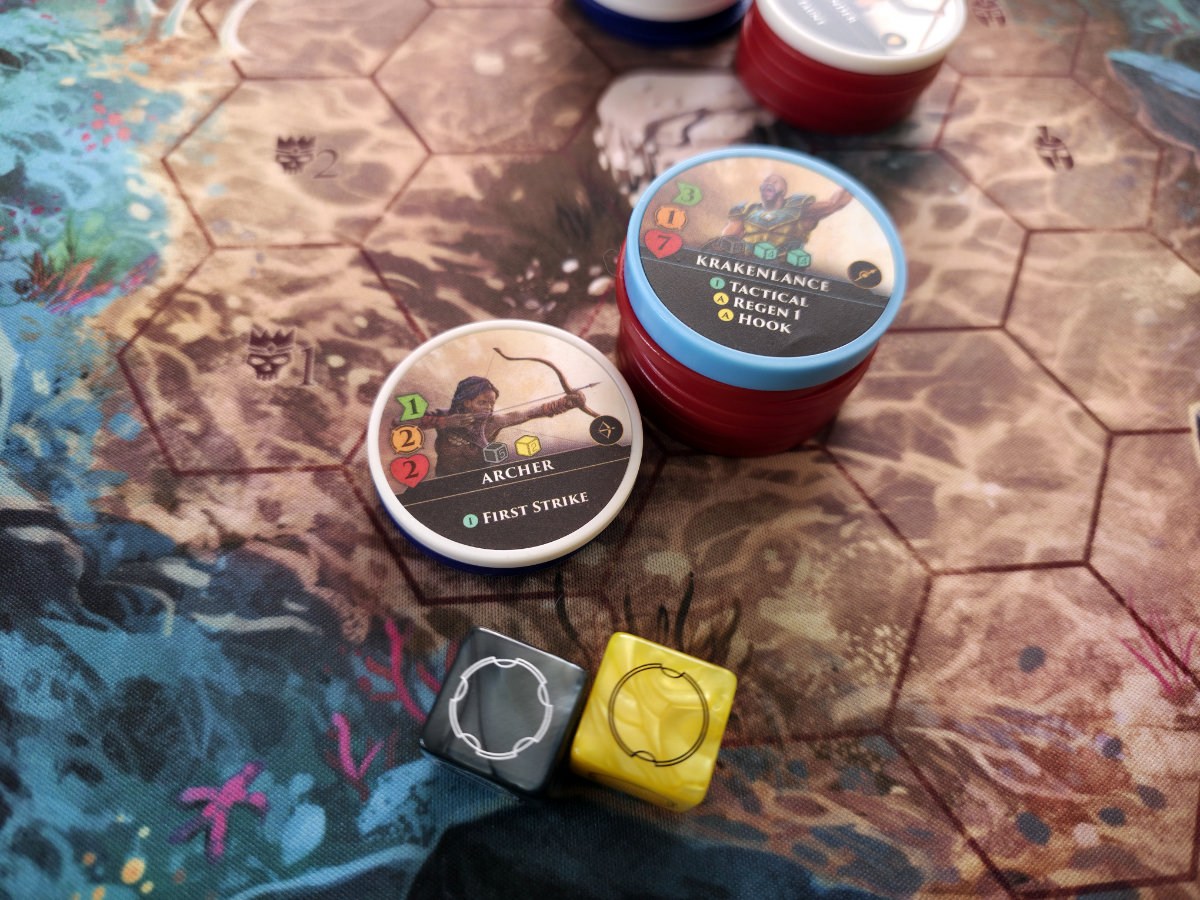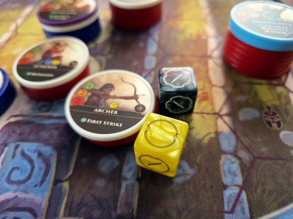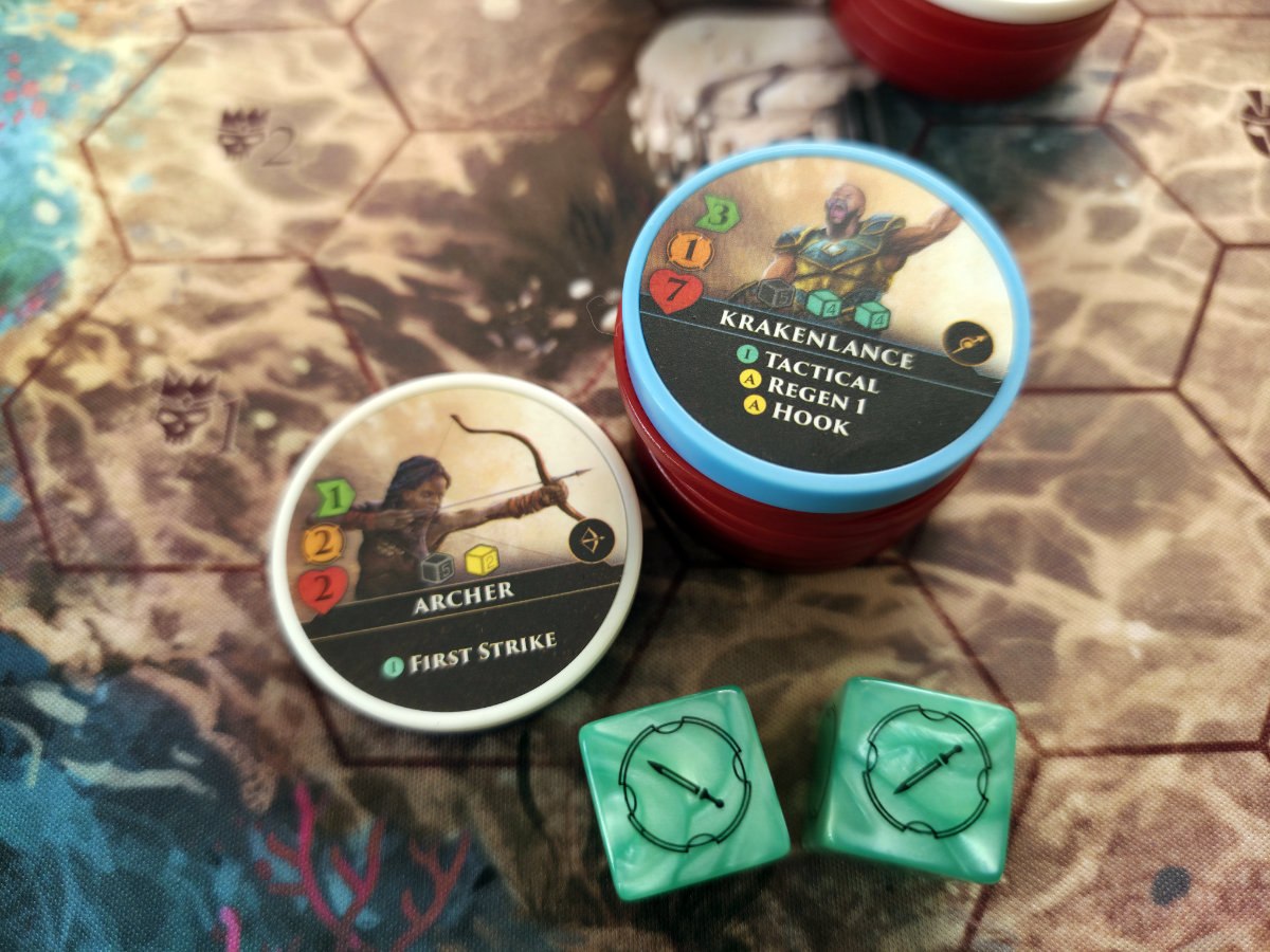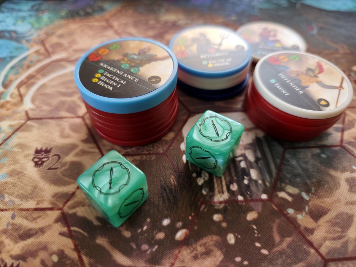 Da der jeweilige Endgegner und dessen Residenz bekannt ist, weiss man auch, wo man hin zu reisen hat und folgt entsprechend den Pfaden (gestrichelte Linien, die manchmal etwas schwer auszumachen sind) auf der Karte. An den jeweiligen Orten werden dann unterschiedliche Arenen und Begebenheiten offenbart. Je nach vorgegebenen Regeln wird entsprechend gekämpft und hoffentlich die erfolgreichen Taktiken gewählt. Sollte der Held doch einmal das Zeitliche segnen, stehen diesem 8 Segen zur Verfügung, durch die er wieder wundersam geheilt parat steht. Wie in Hoplomachus kommt es hier auch auf die geschickte Positionierung der eigenen Einheiten an, das richtige Quentchen Glück zu haben und die jeweils möglichen Spezialfähigkeiten bzw. -effekte von Einheiten oder eines Szenariokampfes zu beachten.