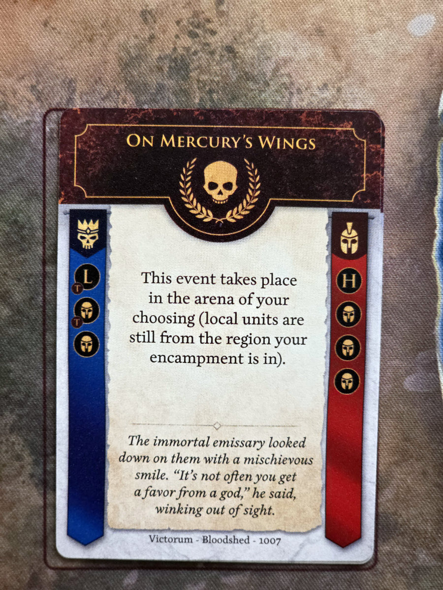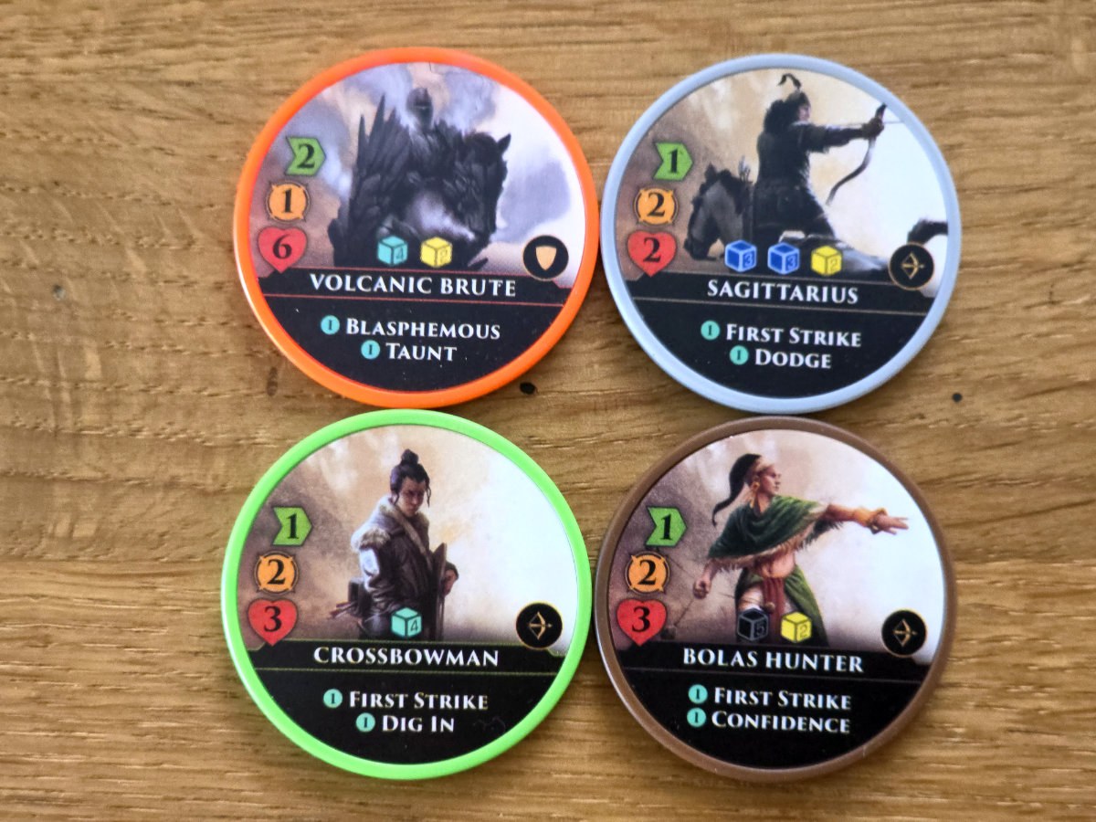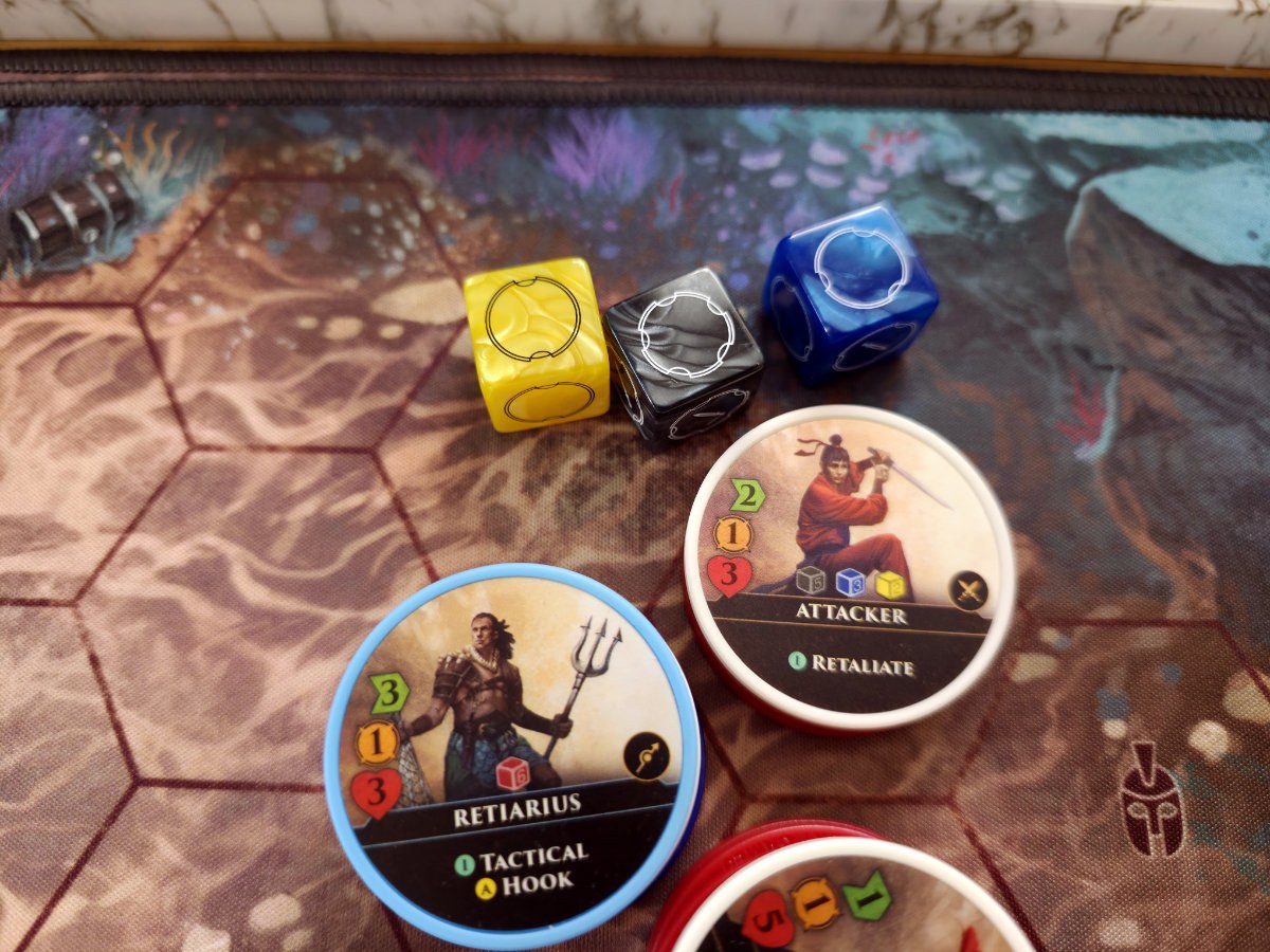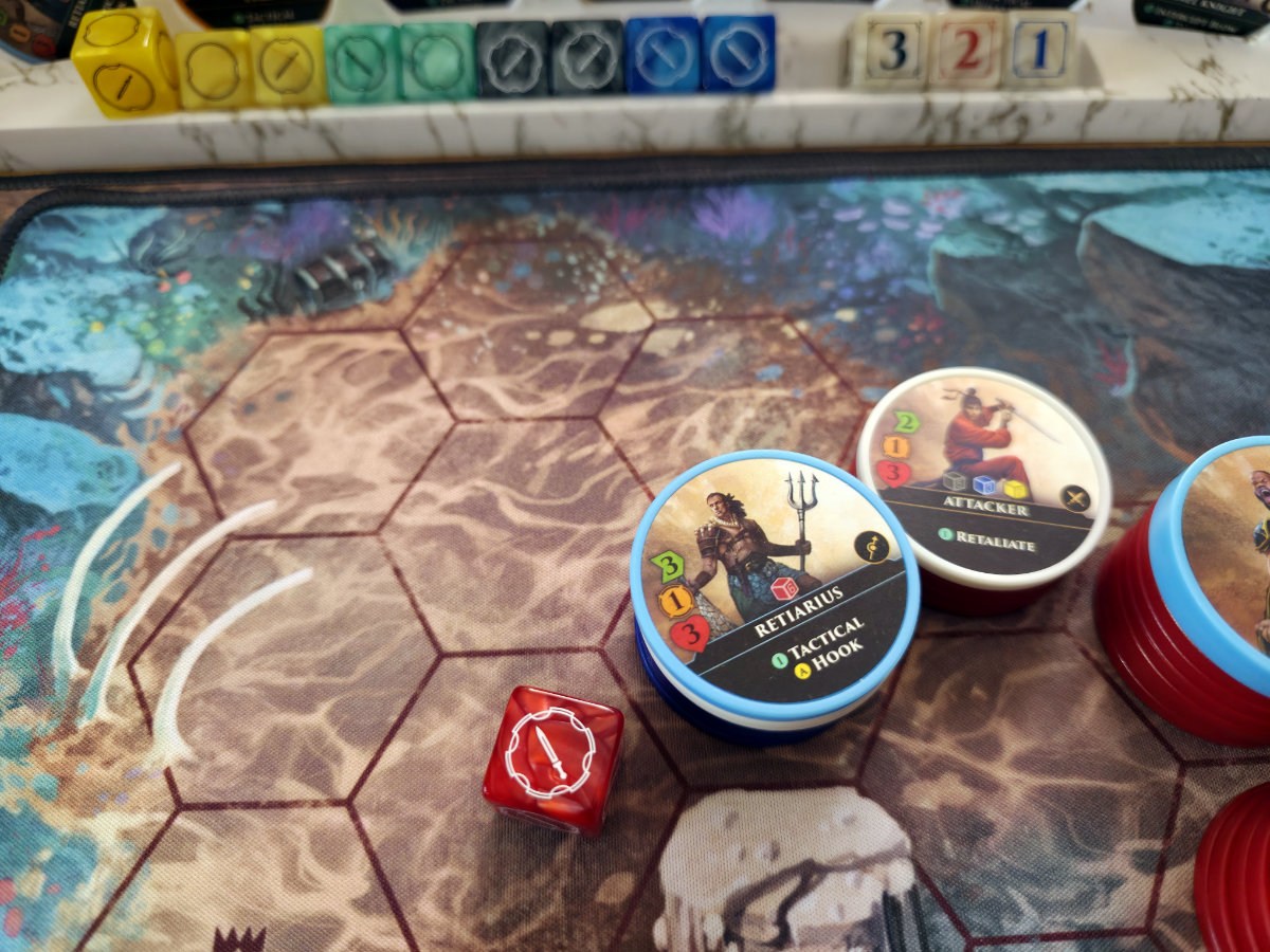 Da der jeweilige Endgegner und dessen Residenz bekannt ist, weiss man auch, wo man hin zu reisen hat und folgt entsprechend den Pfaden (gestrichelte Linien, die manchmal etwas schwer auszumachen sind) auf der Karte. An den jeweiligen Orten werden dann unterschiedliche Arenen und Begebenheiten offenbart. Je nach vorgegebenen Regeln wird entsprechend gekämpft und hoffentlich die erfolgreichen Taktiken gewählt. Sollte der Held doch einmal das Zeitliche segnen, stehen diesem 8 Segen zur Verfügung, durch die er wieder wundersam geheilt parat steht. Wie in Hoplomachus kommt es hier auch auf die geschickte Positionierung der eigenen Einheiten an, das richtige Quentchen Glück zu haben und die jeweils möglichen Spezialfähigkeiten bzw. -effekte von Einheiten oder eines Szenariokampfes zu beachten.