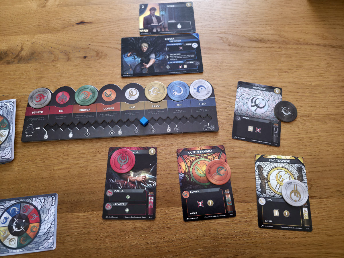 In erster Linie wird hier das erste Buch bespielt, aber natürlich sind alle Bezüge, Begrifflichkeiten und viele Charaktere aus der gesamten Fantasy-Roman-Reihe dabei. Und so agieren die Spieler als einer der Hauptakteure (Kelsier, Vin, Shan, Marsh) und schmelzen Metalle, zaubern und erfüllen Missionen mit Hilfe von Karten. In der von Brandon Sanderson erschaffenen Welt besitzen einige Auserwählte die Fähigkeit bestimmte Metalle zu nutzen („schmelzen“), um Gegnern Schaden zuzufügen, Alliierte zu unterstützen und Missionspunkte zu generieren. Hier nutzen die Spieler dazu Karten und deren Effekte, nebst Einsatz von Metall-Markern, um im Spiel voran zu schreiten und letztendlich zu gewinnen.