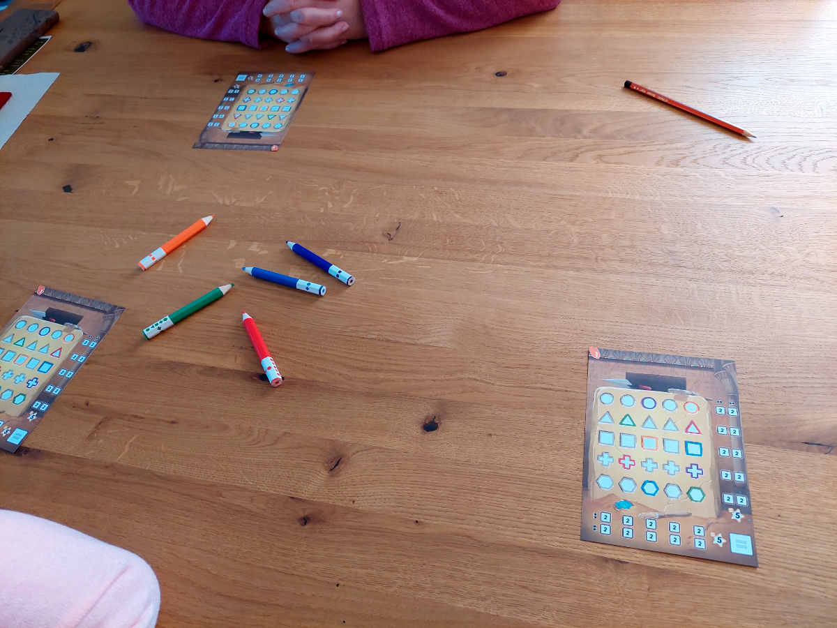 Der Ablauf ist denkbar einfach, aber durchaus knifflig. Zu Beginn jeder Runde werden die fünf Buntstifte wie Würfel geworfen. Jeder Spieler wählt reihum einen Stift aus und malt damit Symbole auf seinem Spielblatt aus – und zwar in der zur Farbe passenden Zone. Die Zahl auf dem Stift bestimmt dabei die maximale Anzahl der ausmalbaren Felder. So entsteht Stück für Stück ein buntes Bild, das nicht nur die Schatzkammer lebendig werden lässt, sondern auch das strategische Denken fördert.