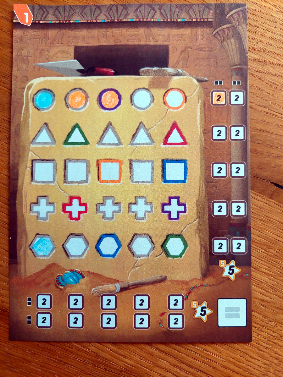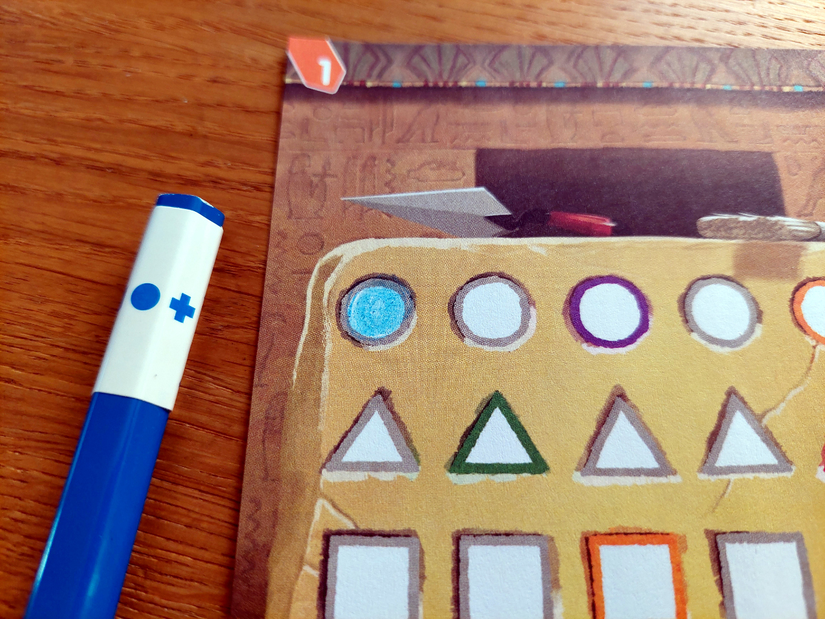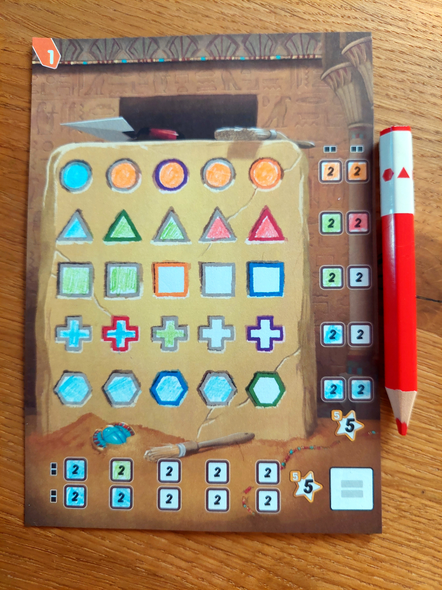 Spielerisch begeben sich die Spieler auf die Suche nach antiken Inschriften, die es zu entschlüsseln gilt. Das Spielblatt zeigt ein Raster voller geheimnisvoller Symbole, das in drei verschiedenen Leveln erkundet werden kann. In jedem Level gilt es, durch geschicktes Ausmalen möglichst viele vollständige Reihen und Spalten zu erzeugen, denn diese bringen wertvolle Punkte. Dabei entscheidet taktisches Geschick über den Erfolg. Welchen Stift wähle ich, welche Farbe benötige ich, wie viele Felder kann ich damit füllen – und wo lohnt es sich am meisten?
