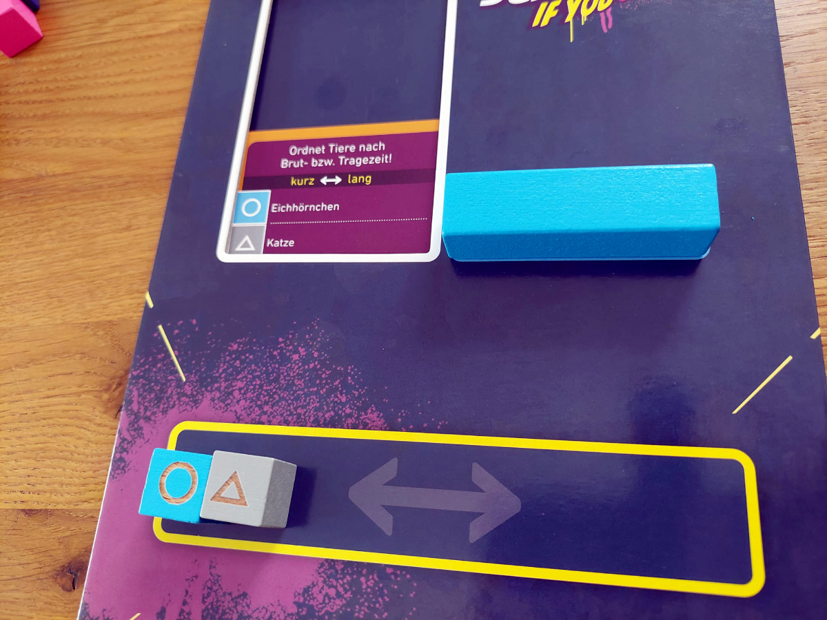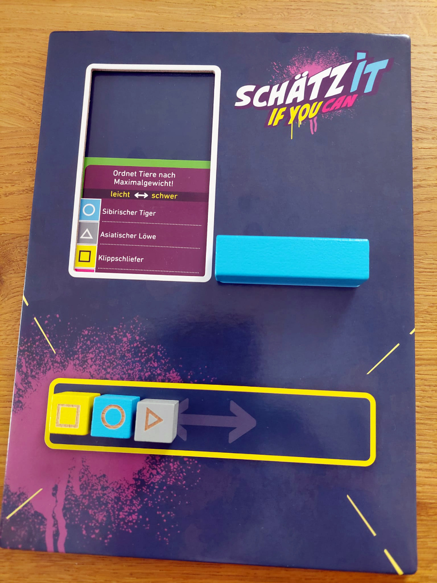 Im Zentrum stehen 75 Fragekarten, die jeweils mit zwei Begriffen starten. Diese werden in eine vermutete Reihenfolge gebracht, zum Beispiel: Ist ein Tiger schwerer als ein Löwe? Und wo kommt das Walross ins Spiel? Mithilfe farbiger Holzklötzchen wird die vermutete Reihenfolge auf dem Kartenhalter visualisiert. Die nächste Person muss dann entscheiden, ob sie die Reihenfolge „durchwinkt“ oder „anzweifelt“. Wird angezweifelt, wird das sogenannte Kontrollfenster geöffnet und die tatsächliche Reihenfolge enthüllt – mit entsprechenden Plus- oder Minuspunkten, je nach Ausgang.