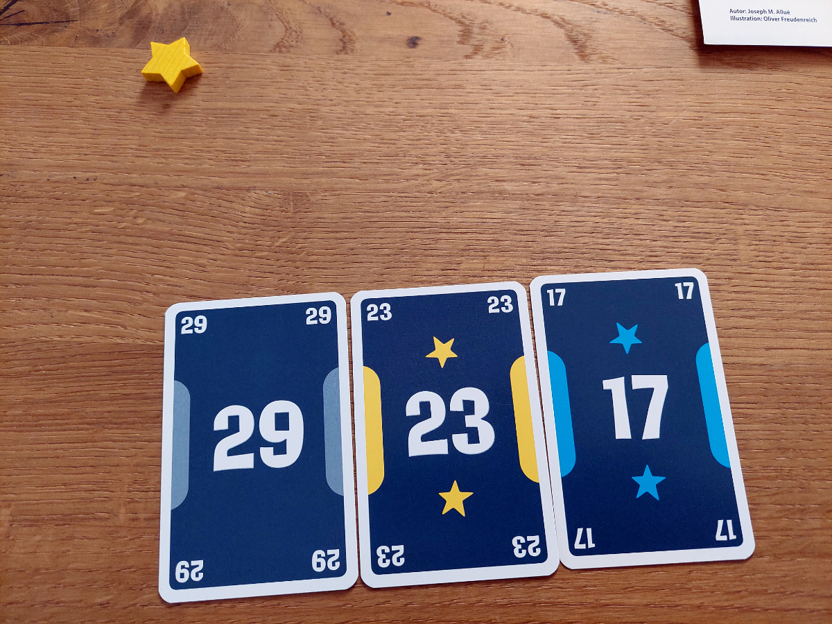 Eine Runde endet, wenn alle bis auf einen gepasst haben oder alle verbleibenden Spieler ihre letzte Karte abgelegt haben. Der letzte aktive Spieler bekommt einen Stern. Anschließend wird die Hand wieder auf fünf Karten aufgefüllt, wobei man vorher beliebig viele abwerfen darf – ein taktisches Element, das man nicht unterschätzen sollte.