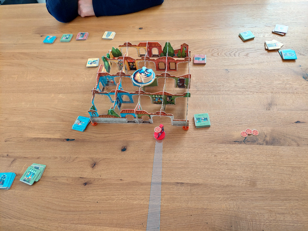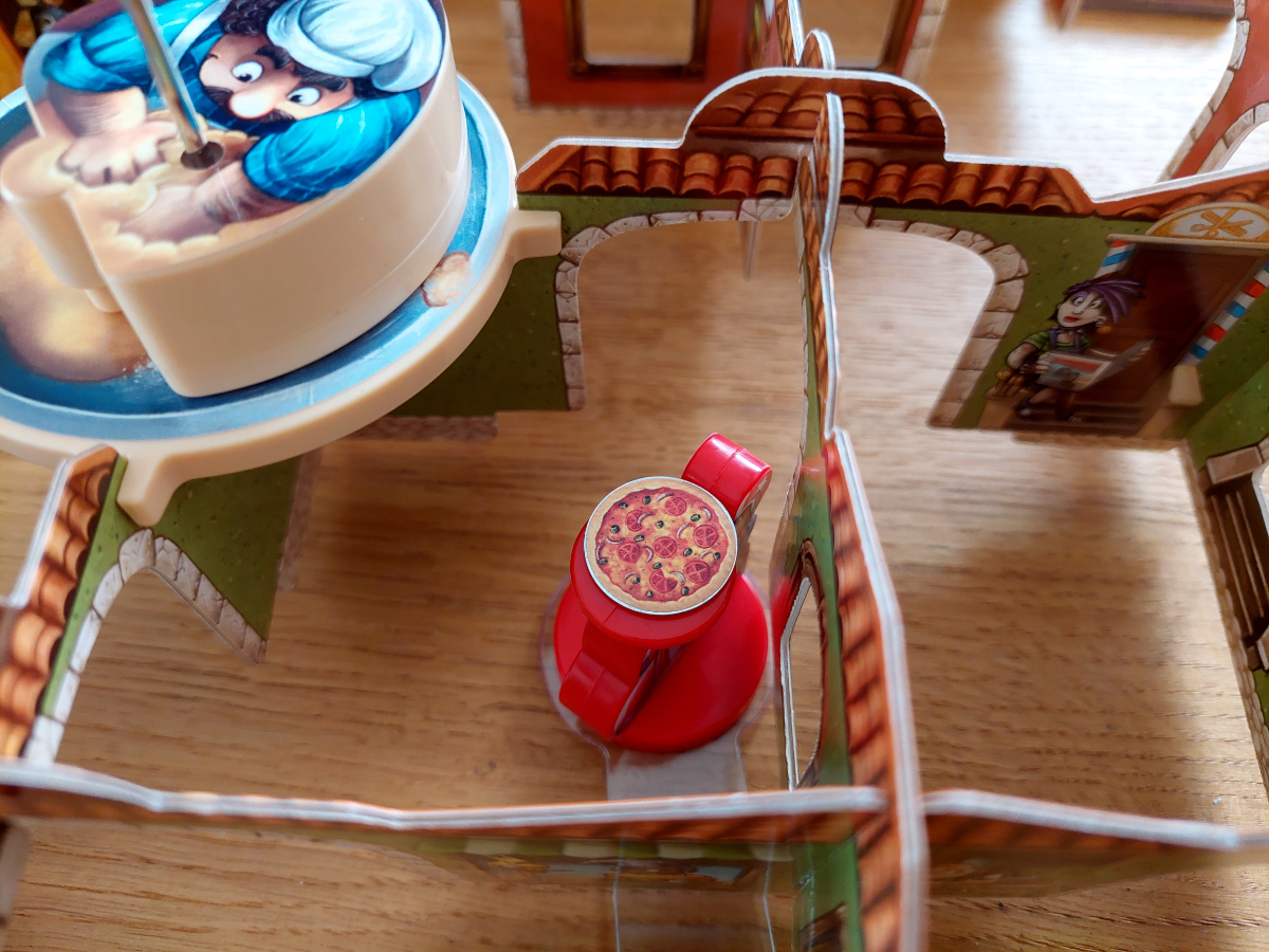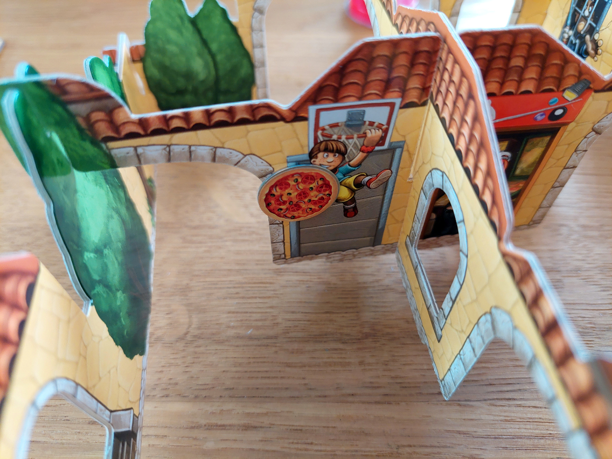 Besonders gelungen ist die liebevolle Gestaltung des Spielmaterials. Die Stadt lässt sich verhältnismäßig stabil aufbauen, die Magnetpizzen funktionieren zuverlässig, und die Illustrationen transportieren den typisch italienischen Charme eines überfüllten Viertels voller quirliger Figuren. Auch wenn es gelegentlich zu Frust kommen kann, wenn die Pizzen wiederholt herunterfallen, bleibt die Stimmung meist ausgelassen und belohnt am Ende jene, die nicht aufgeben.