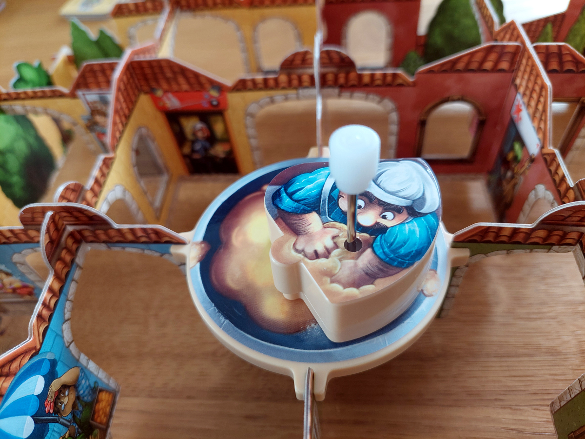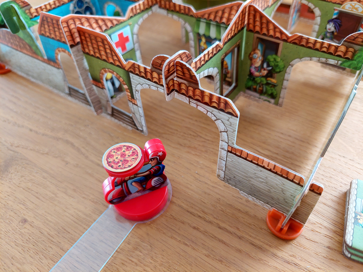 Bevor die erste Lieferung startet, wird die Stadt Rabazza aufgebaut. Eine bunte Kulisse aus magnetischen Wänden, vier Stadteingängen und dem Backtisch in der Mitte, auf dem Pizzabäcker Pino geduldig seinen Teig knetet – oder eher ungeduldig, denn sobald er aufgezogen wird, beginnt sein vibrierender Einsatz, der die Stadt zum Wackeln bringt und die Spieler unter Zeitdruck setzt. Ziel ist es, während dieser „Knetzeit“ möglichst viele Metallpizzen an die passenden Bewohner zu liefern – magnetisch haftend an den Stadtwänden.