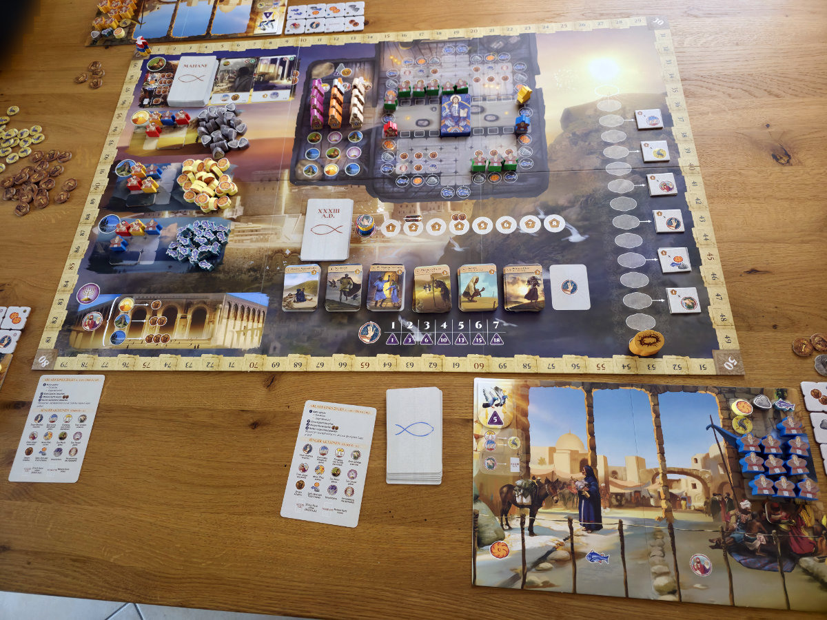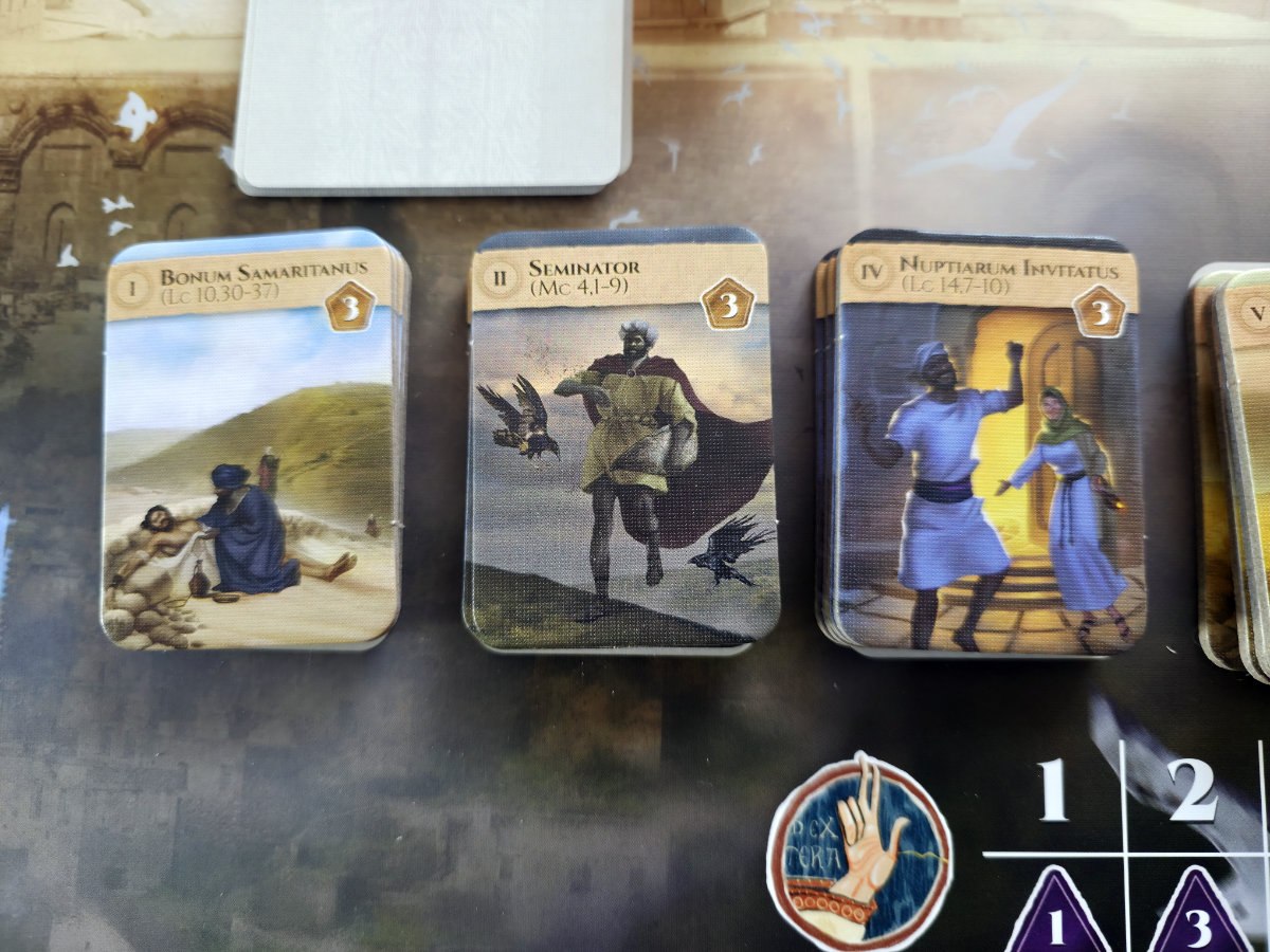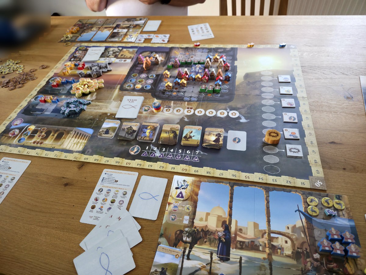 Das zentrale Element ist ein ausgeklügelter Kartenmechanismus. Jede Karte zeigt ein Symbol eines von fünf Orten in und um Jerusalem – etwa den Tempel oder den Markt. Durch das geschickte Ausspielen dieser Karten bilden die Spieler Sets, mit denen sie die Apostel besuchen dürfen und an den Tisch des letzten Abendmahls setzen können. Dies bringt nicht nur Vorteile im Spielverlauf, sondern ist auch thematisch elegant eingebettet. Die Apostel sind nicht nur Spielfiguren, sondern symbolisieren Einfluss und Nähe zu Jesus, welches wiederum Punkte (4-6 je nach Apostel und dann noch je nach Platzierung) bei Spielende bringt.