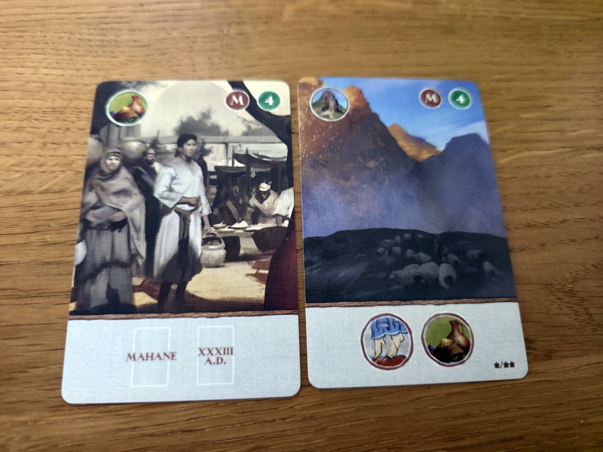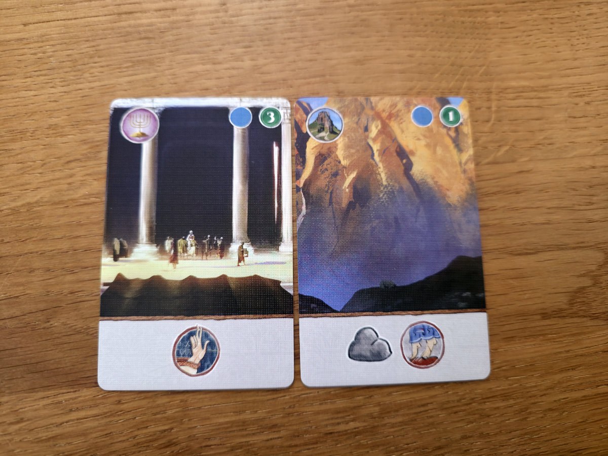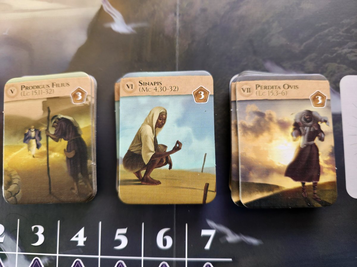 Das zentrale Element ist ein ausgeklügelter Kartenmechanismus. Jede Karte zeigt ein Symbol eines von fünf Orten in und um Jerusalem – etwa den Tempel oder den Markt. Durch das geschickte Ausspielen dieser Karten bilden die Spieler Sets, mit denen sie die Apostel besuchen dürfen und an den Tisch des letzten Abendmahls setzen können. Dies bringt nicht nur Vorteile im Spielverlauf, sondern ist auch thematisch elegant eingebettet. Die Apostel sind nicht nur Spielfiguren, sondern symbolisieren Einfluss und Nähe zu Jesus, welches wiederum Punkte (4-6 je nach Apostel und dann noch je nach Platzierung) bei Spielende bringt.