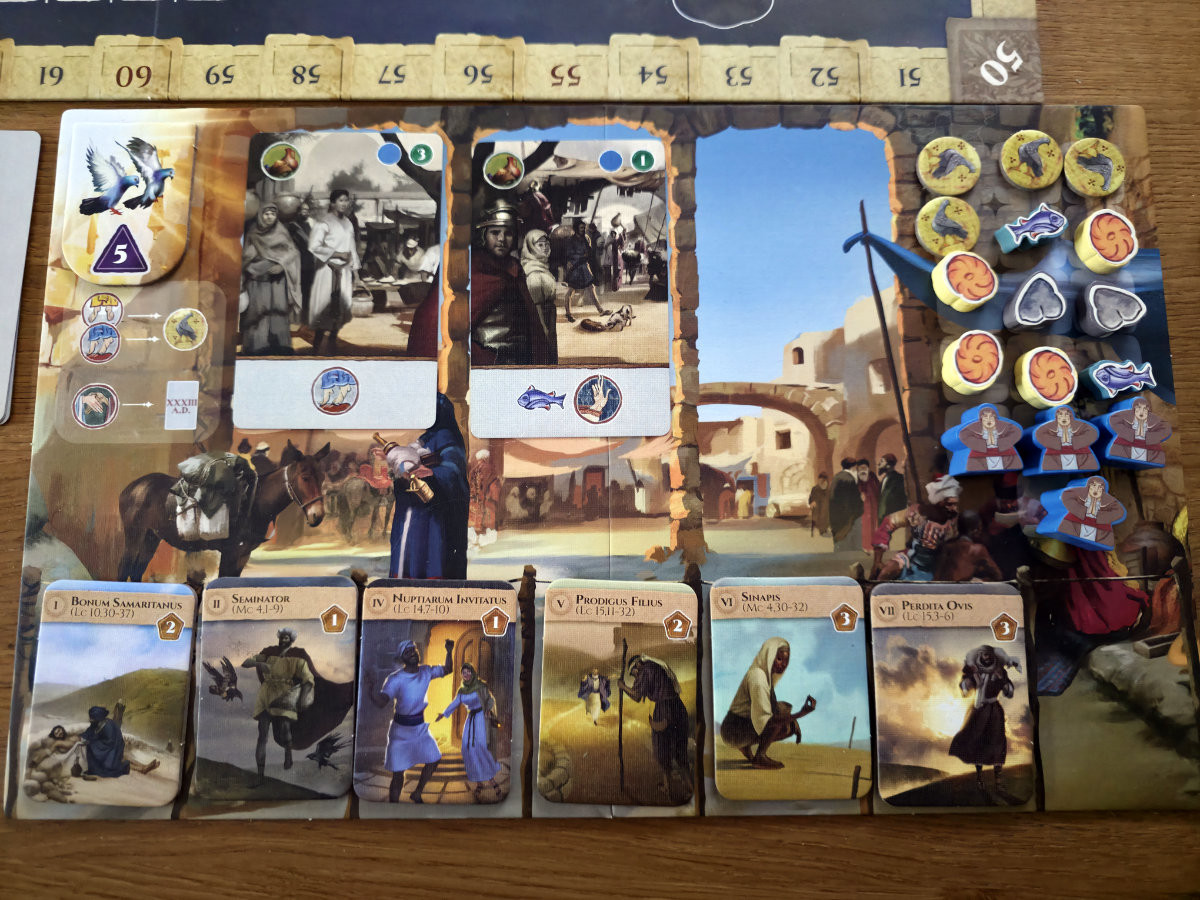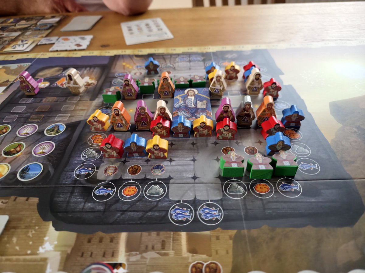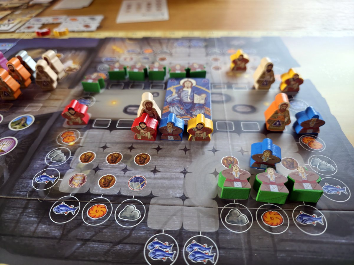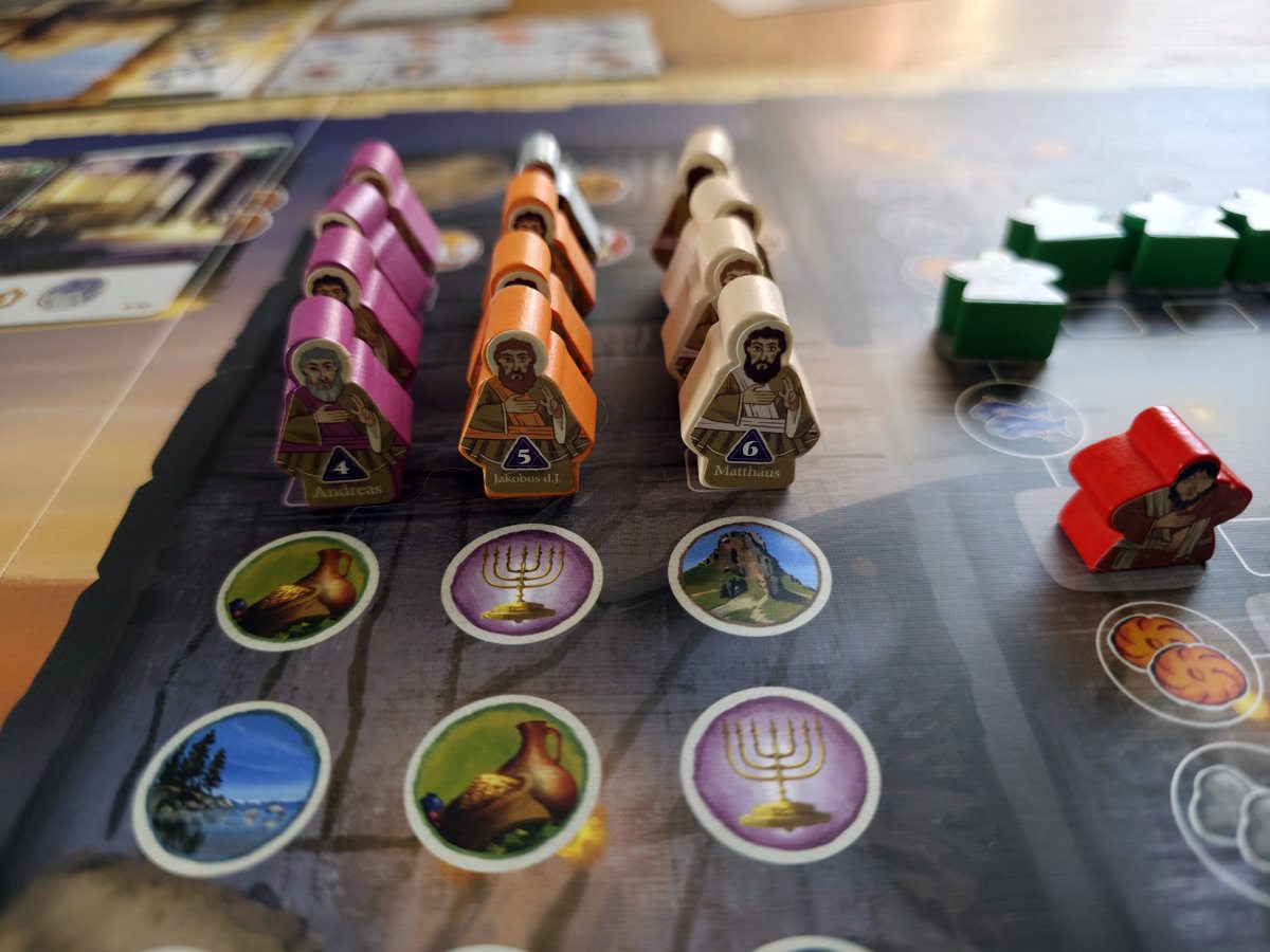 Die Karten erlauben zudem verschiedene Aktionen, etwa das Sammeln von Ressourcen wie Brot oder Fisch – allesamt symbolträchtige Elemente des christlichen Abendmahls. Diese Ressourcen werden benötigt, um eigene Jünger in den Speisesaal auf dem Berg Zion zu schicken. Je näher diese Jünger am Tisch sitzen, desto mehr Punkte erhalten die Spielenden am Ende. Die Positionierung ist also nicht nur thematisch, sondern auch taktisch relevant.
