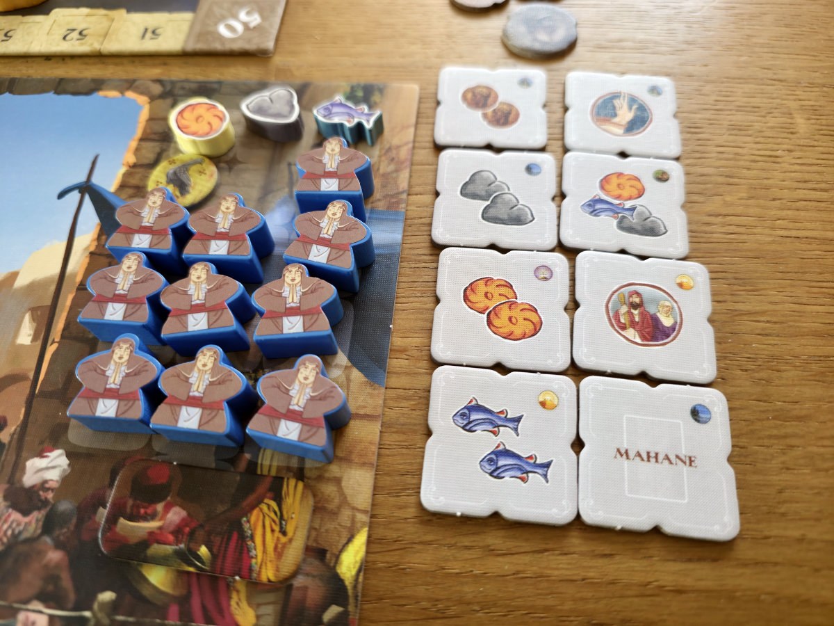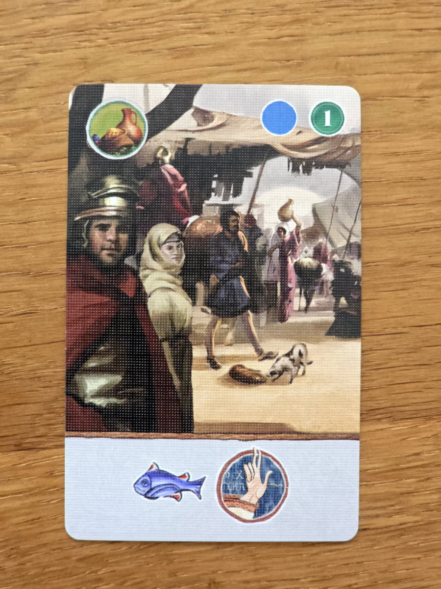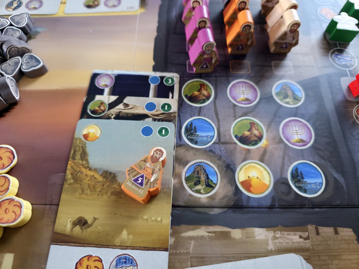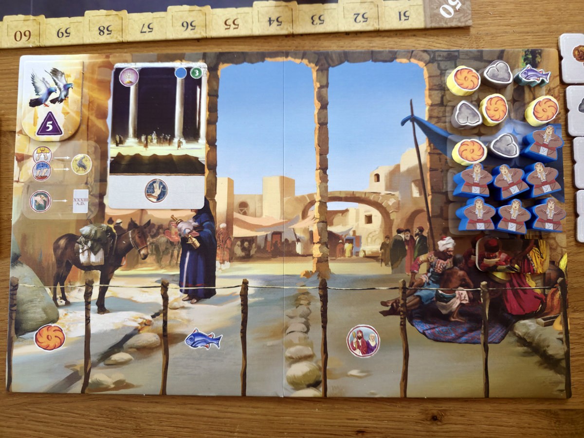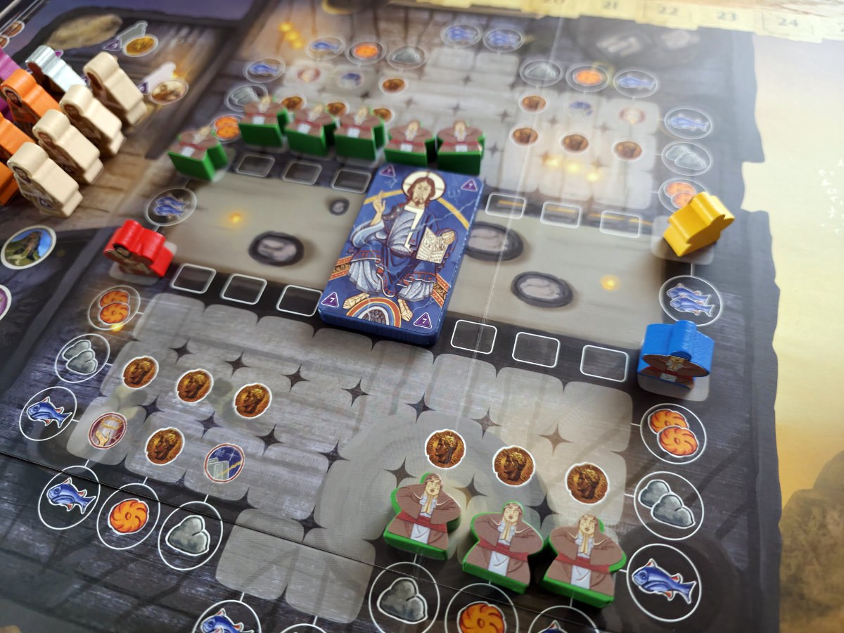 Die Karten erlauben zudem verschiedene Aktionen, etwa das Sammeln von Ressourcen wie Brot oder Fisch – allesamt symbolträchtige Elemente des christlichen Abendmahls. Diese Ressourcen werden benötigt, um eigene Jünger in den Speisesaal auf dem Berg Zion zu schicken. Je näher diese Jünger am Tisch sitzen, desto mehr Punkte erhalten die Spielenden am Ende. Die Positionierung ist also nicht nur thematisch, sondern auch taktisch relevant.