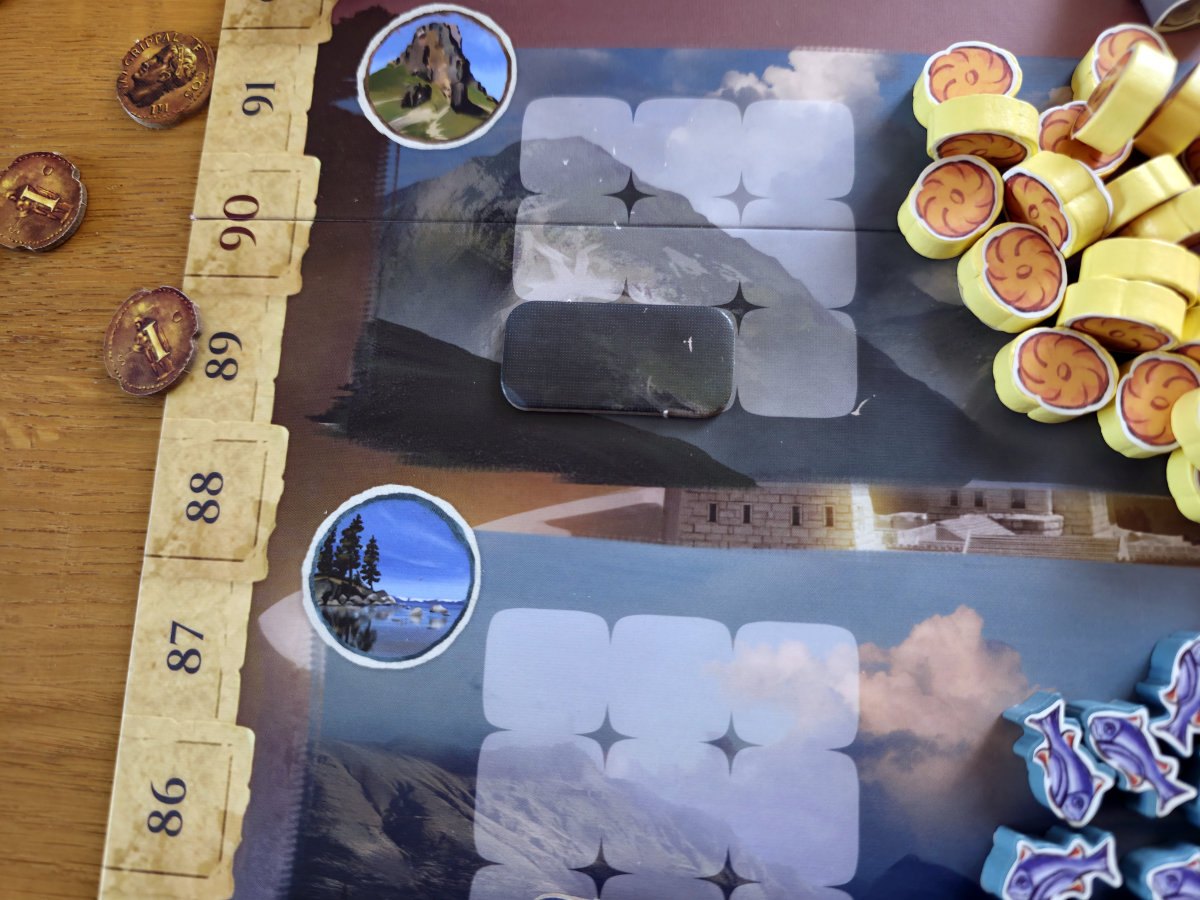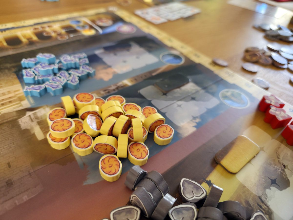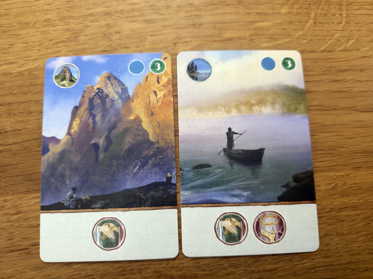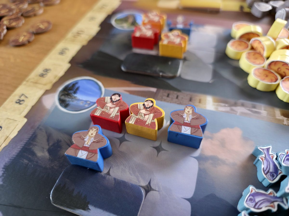 Die Karten erlauben zudem verschiedene Aktionen, etwa das Sammeln von Ressourcen wie Brot oder Fisch – allesamt symbolträchtige Elemente des christlichen Abendmahls. Diese Ressourcen werden benötigt, um eigene Jünger in den Speisesaal auf dem Berg Zion zu schicken. Je näher diese Jünger am Tisch sitzen, desto mehr Punkte erhalten die Spielenden am Ende. Die Positionierung ist also nicht nur thematisch, sondern auch taktisch relevant.