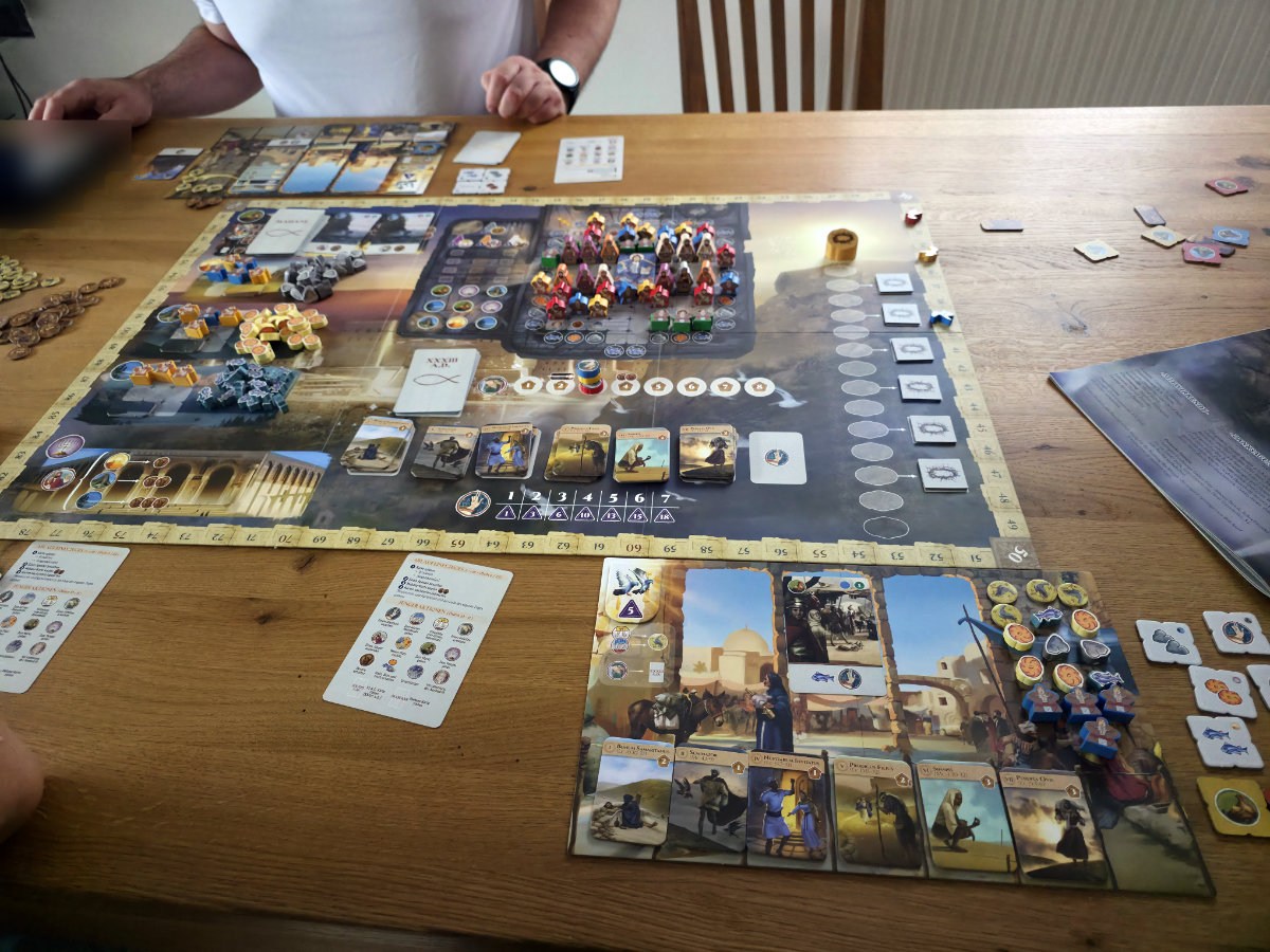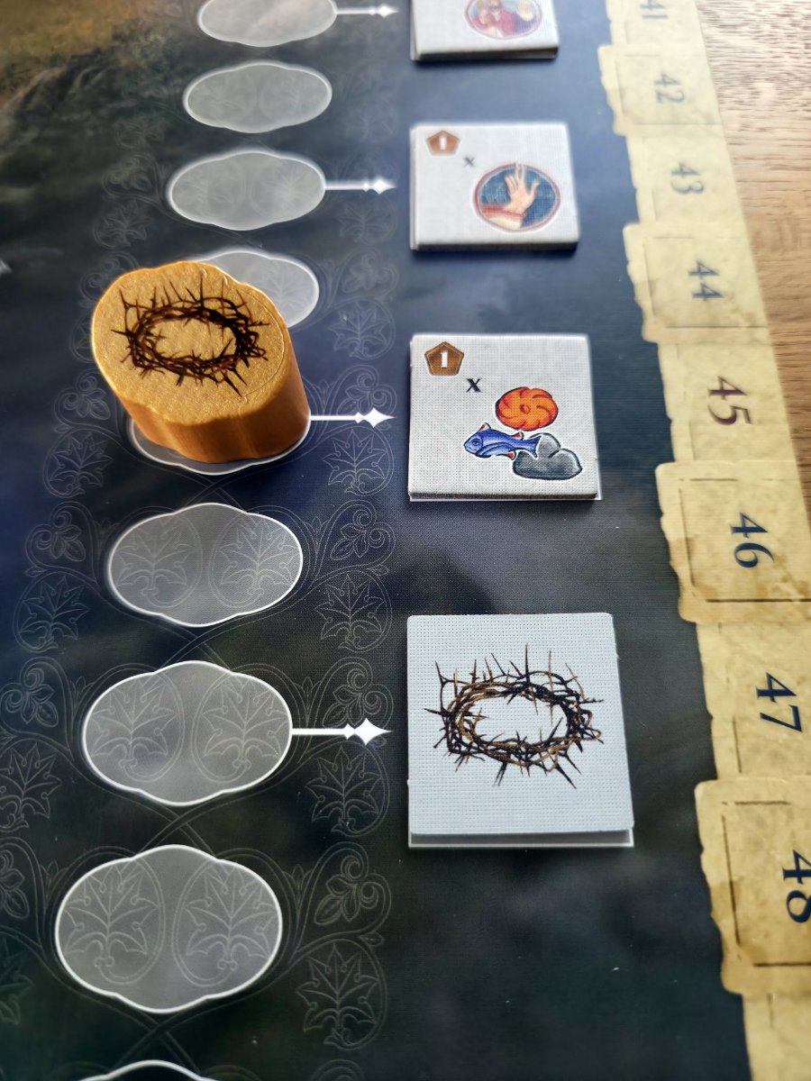 Ein spannendes Element ist dabei die Interaktion. Da alle Spieler versuchen, ihre Jünger möglichst vorteilhaft zu platzieren, entsteht ein intensiver Wettbewerb um die besten (Punkte-)Plätze. Dies führt zu einem dynamischen Spielverlauf, bei dem Timing, Planung und das richtige Ausspielen der Karten entscheidend sind – für einen „Besuch“ bei einem Apostel müssen die Karten (hier nur 3 an der Zahl) in der richtigen Reihenfolge ausliegen.