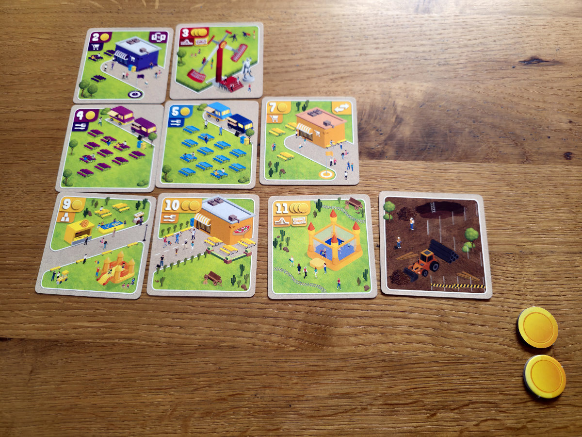 Zu Beginn erhält jede Person ein eigenes Parktableau, einige Münzen als Startkapital und eine Auswahl an Attraktionen, die im Laufe des Spiels erweitert wird. Der zentrale Mechanismus ist das Draften. In jeder Runde werden die Attraktionskarten an die Sitznachbarn weitergegeben, aus denen reihum je eine gewählt wird. Jede Attraktion kostet Münzen, und das Budget ist knapp – wer zu verschwenderisch plant, riskiert, später nicht mehr bauen zu können, denn es gibt keine Einnahmen. Die Attraktionen unterscheiden sich nicht nur in den Kosten, sondern auch in ihrer Art und den Punkten, die sie bringen.