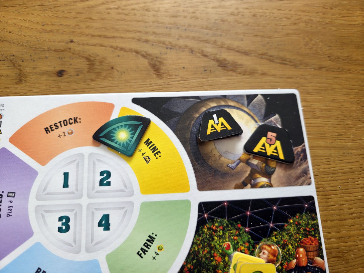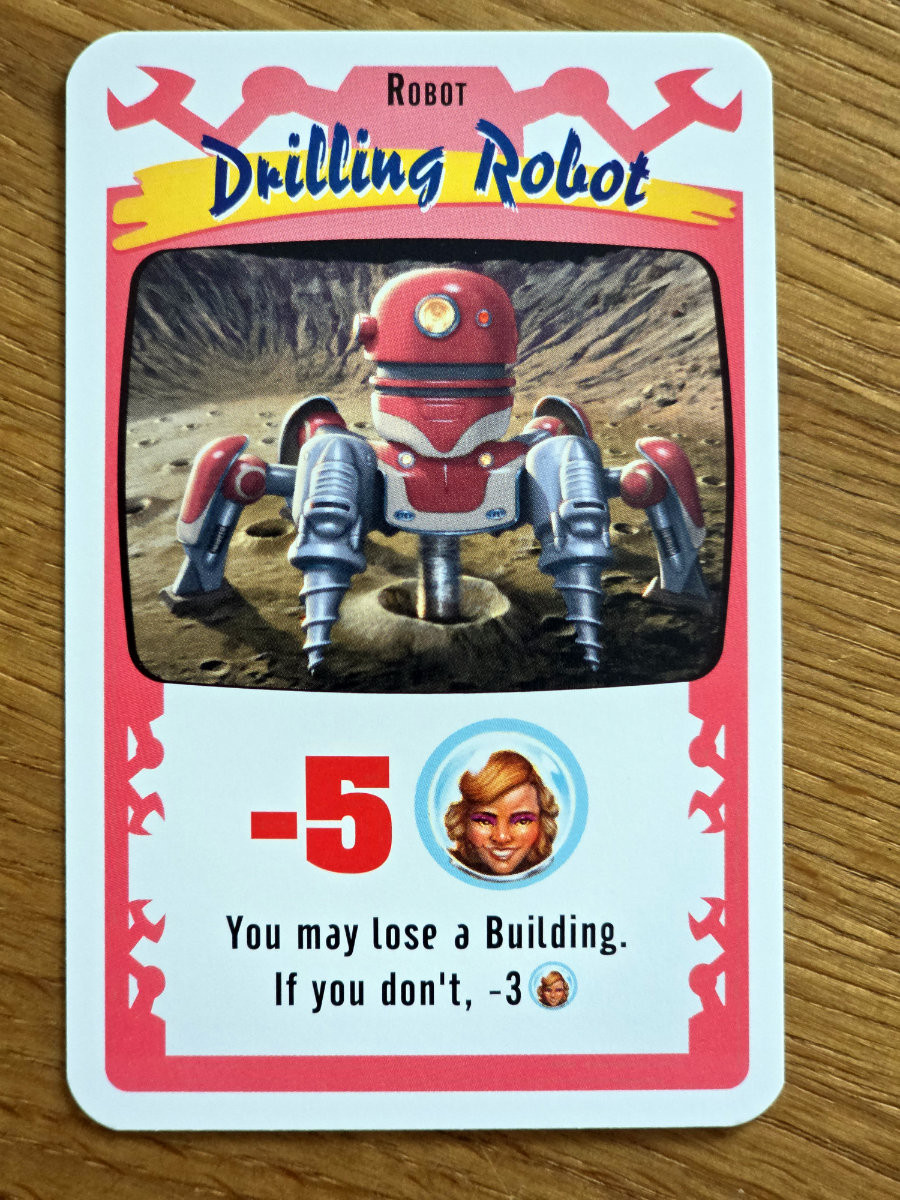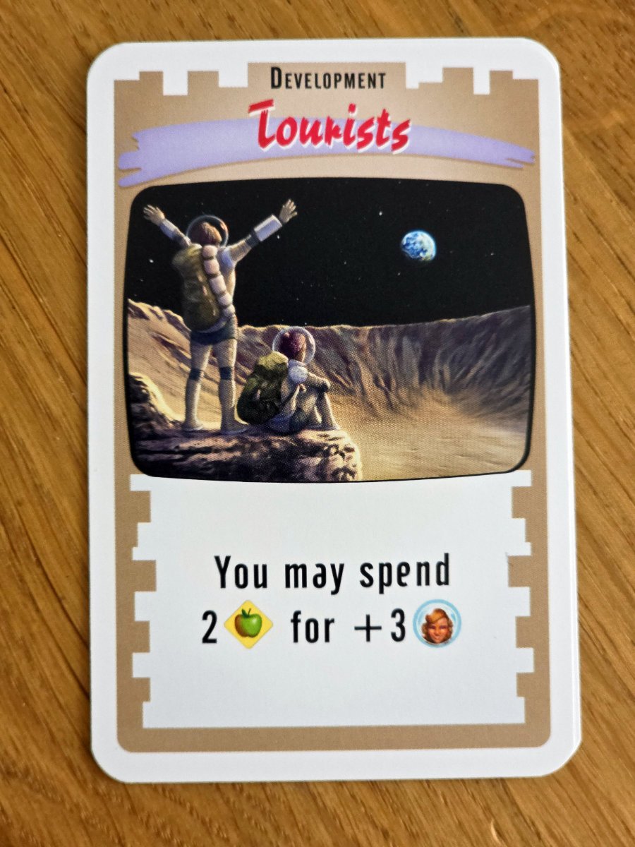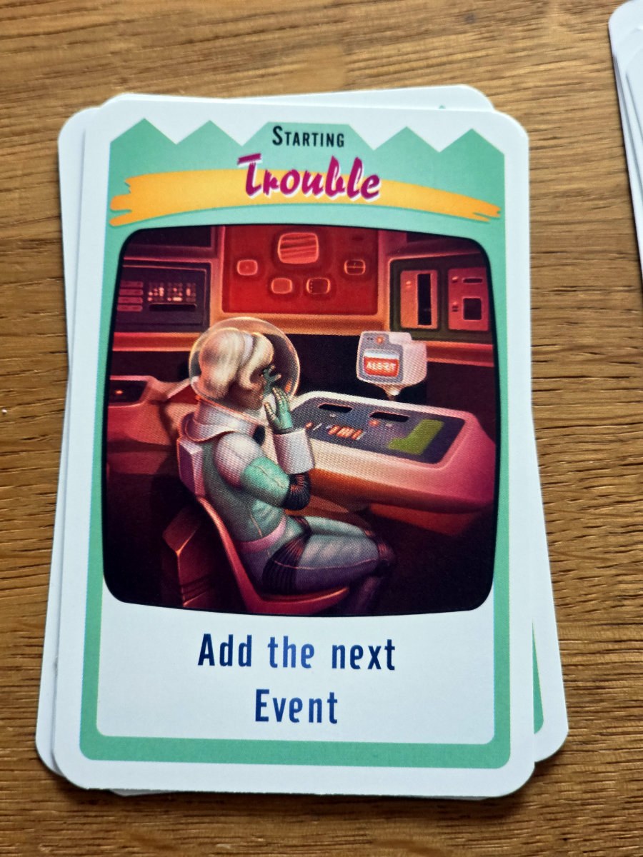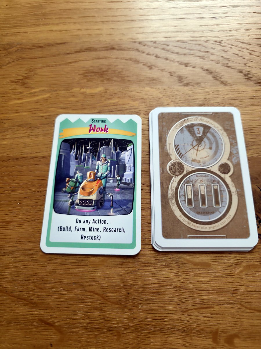 Der Ablauf ist ebenso elegant wie gnadenlos. Alle Spieler teilen sich ein zentrales Deck, das zu Beginn aus harmlosen „Work“-Karten, einigen „Trouble“-Karten und ein paar „Twists“ besteht. Jede Runde wird eine Karte aufgedeckt. Bei „Work“ führen alle gleichzeitig eine Aktion aus – etwa Erz abbauen, Nahrung produzieren, forschen, Gebäude errichten oder Vorräte auffüllen. „Trouble“ hingegen fügt dem Deck neue Katastrophen hinzu, wie Hunger, Stromausfälle, Lecks, Bürokratie oder technische Pannen – kurz, alles, was eine Mondkolonie ins Chaos stürzen kann. „Twists“ bringen zusätzliche, variierende Regeln ins Spiel, die jede Partie anders färben.