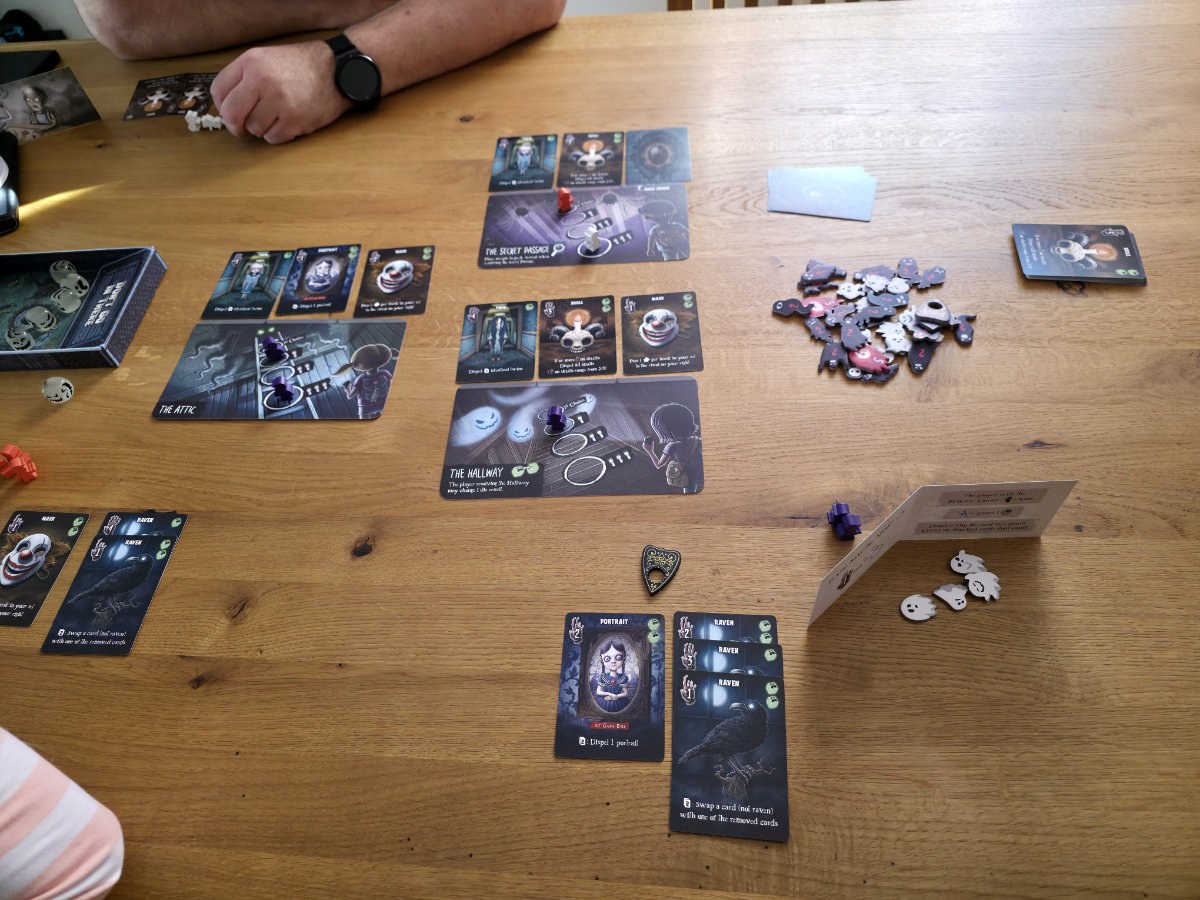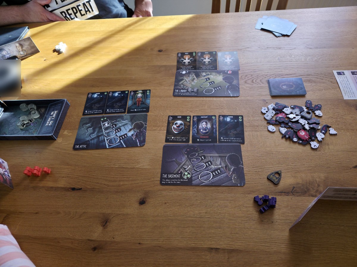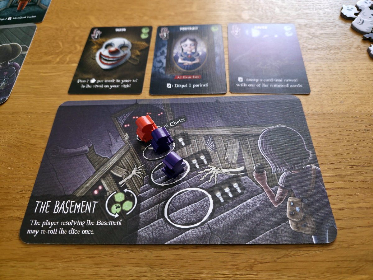 Der Ablauf ist schnell verinnerlicht. Wer am Zug ist, platziert eine seiner Spielfiguren in einem von drei Räumen des Hauses. Jeder Raum bietet vier Platzierungen – je tiefer man hineingeht, desto größer die Chance, begehrte Karten zu ergattern, aber auch das Risiko, mehr Geister anzulocken. Sobald drei Figuren in einem Raum stehen, wird dieser gewertet uns es werden die Geisterwürfel in den Würfelturm geworfen. Je nach Ergebnis und Position der Figuren kassieren die Spieler Geistermarker, die am Ende des Spiels in Fluchpunkte umgerechnet werden. Die Kids müssen sich im Spukhaus durch die Räume bewegen und „berühren“ dabei allerhand Gegenstände und sammeln so die zugehörigen, dort ausliegenden, Karten ein.