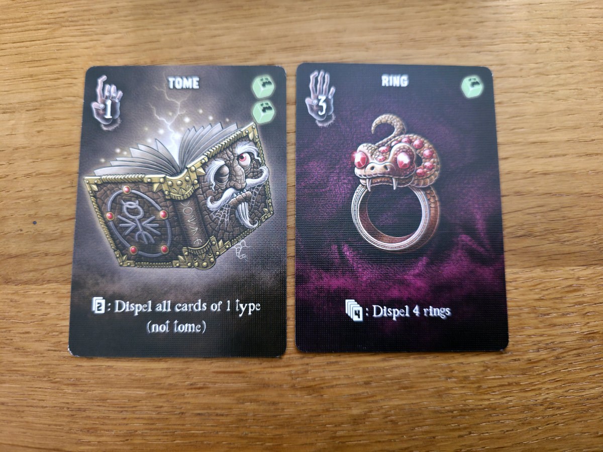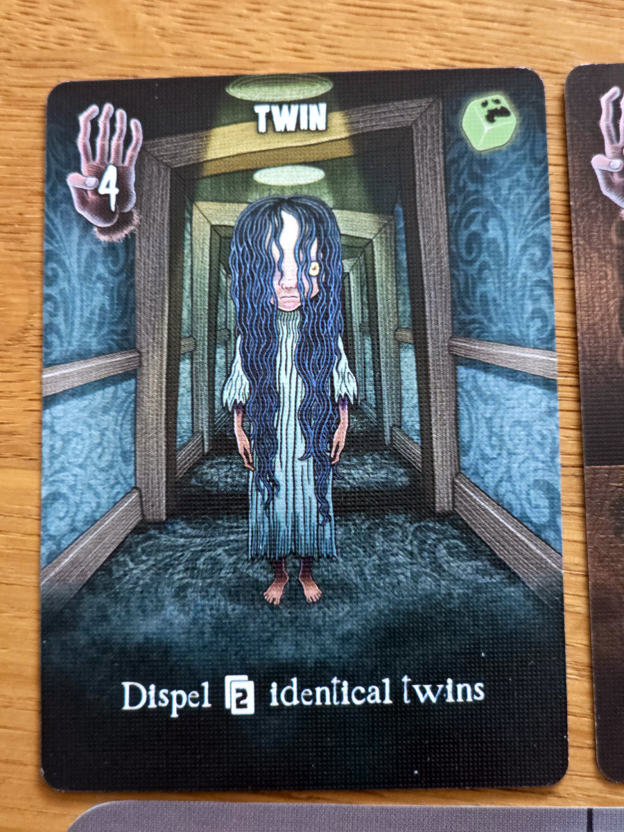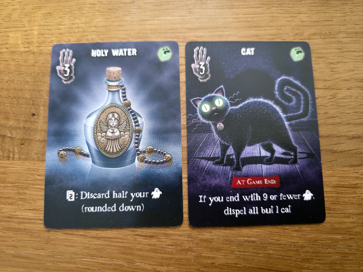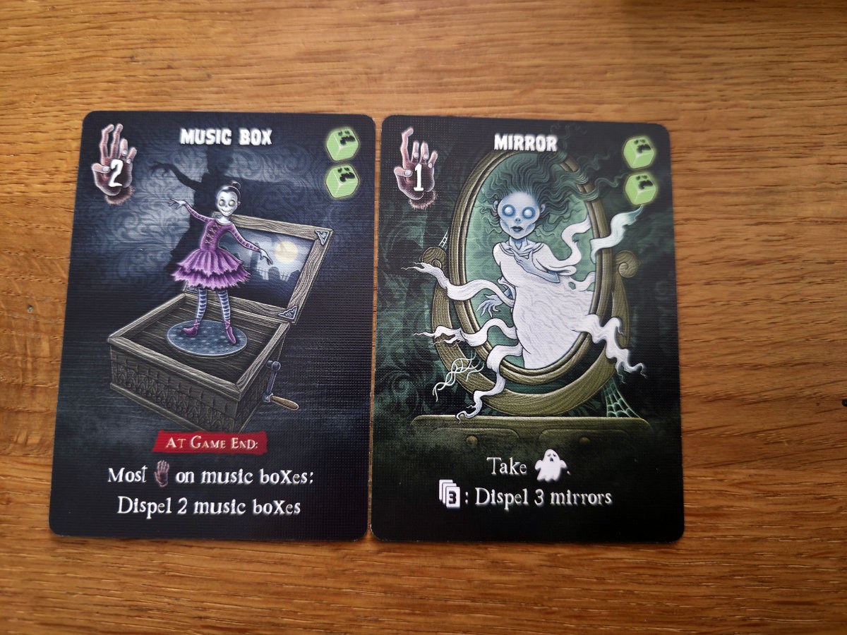 Die Karten, die man aus den Räumen erhält, sind verfluchte Gegenstände – von unheilvollen Spiegeln bis zu mysteriösen Büchern. Manche helfen, Flüche zu bannen, andere bringen zusätzliche Punkte ein, die man tunlichst vermeiden möchte. Die meisten Karten bringen halt Fluch“punkte“ ein, aber einige haben auch Effekte, die dies wieder umkehren können.