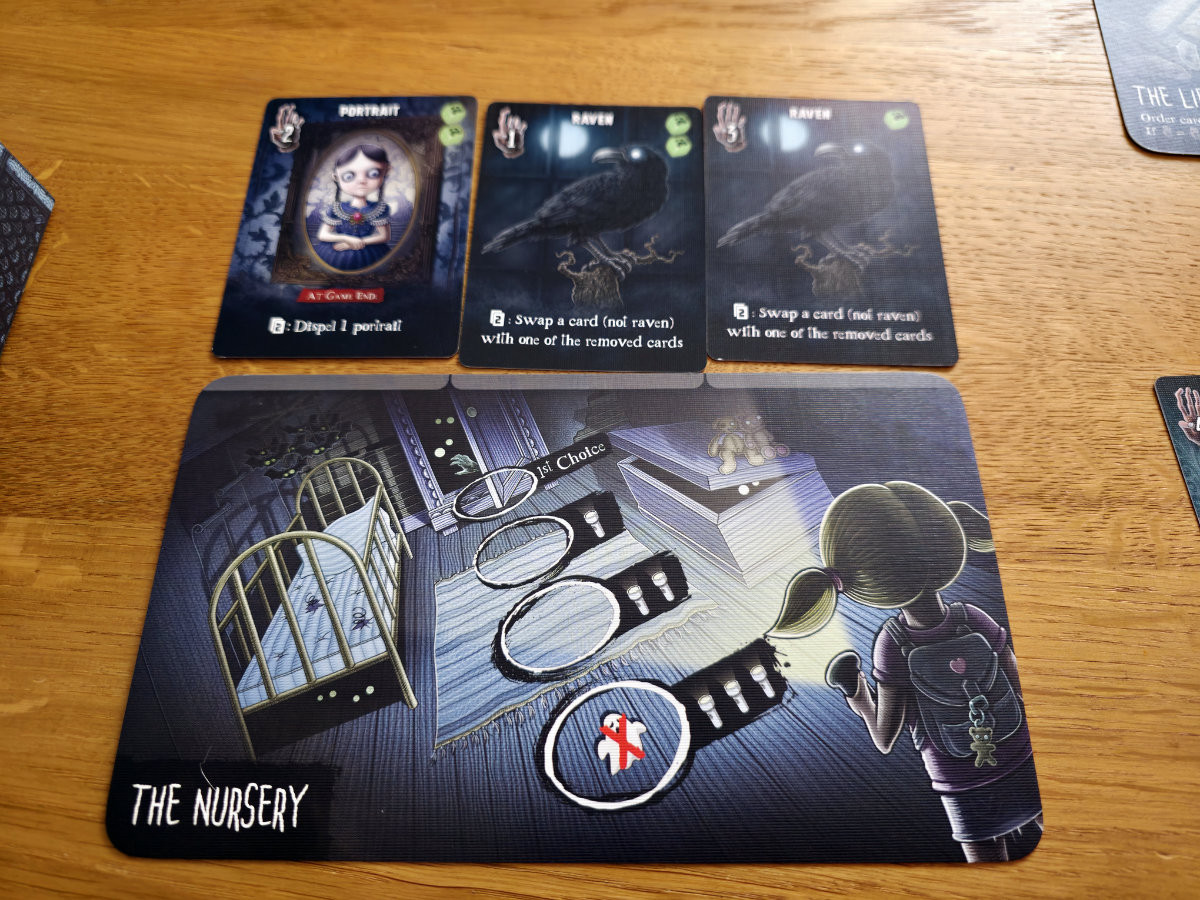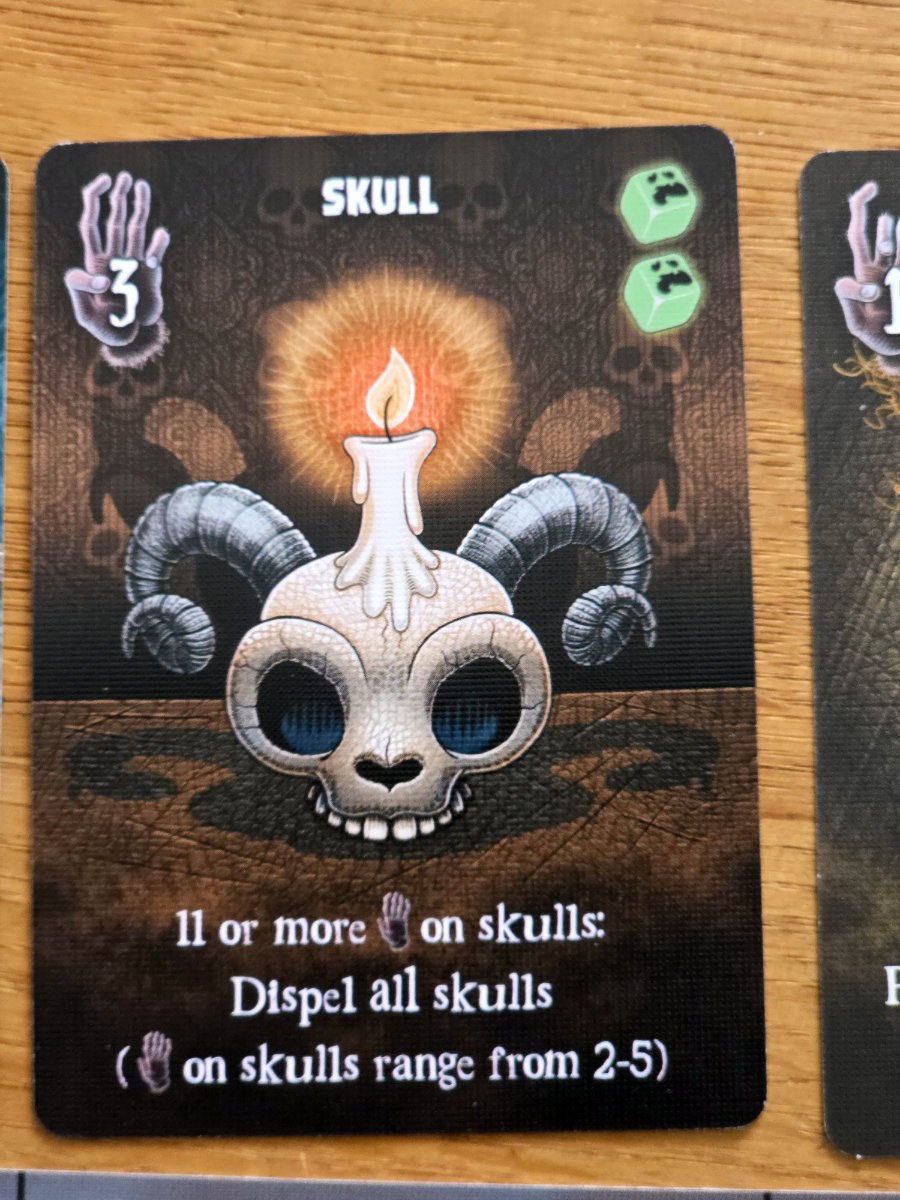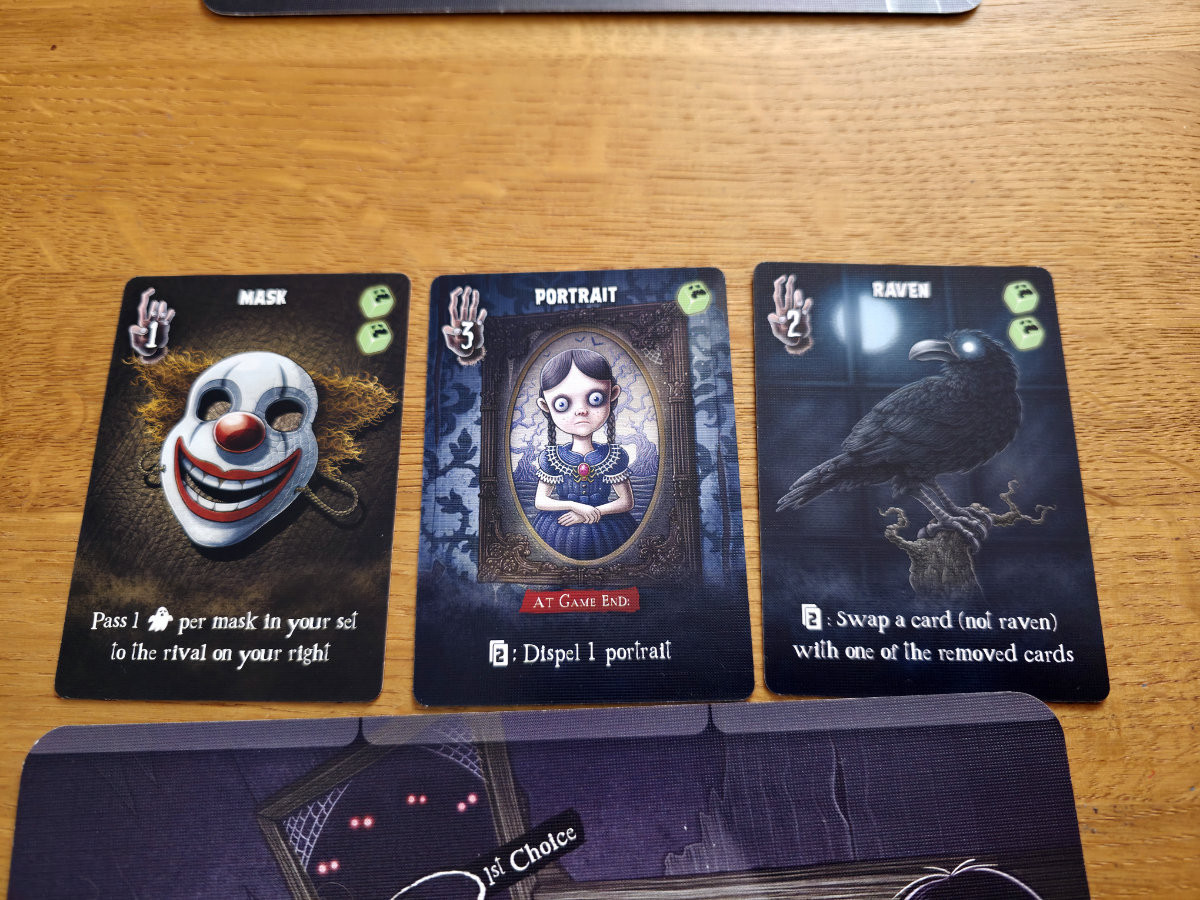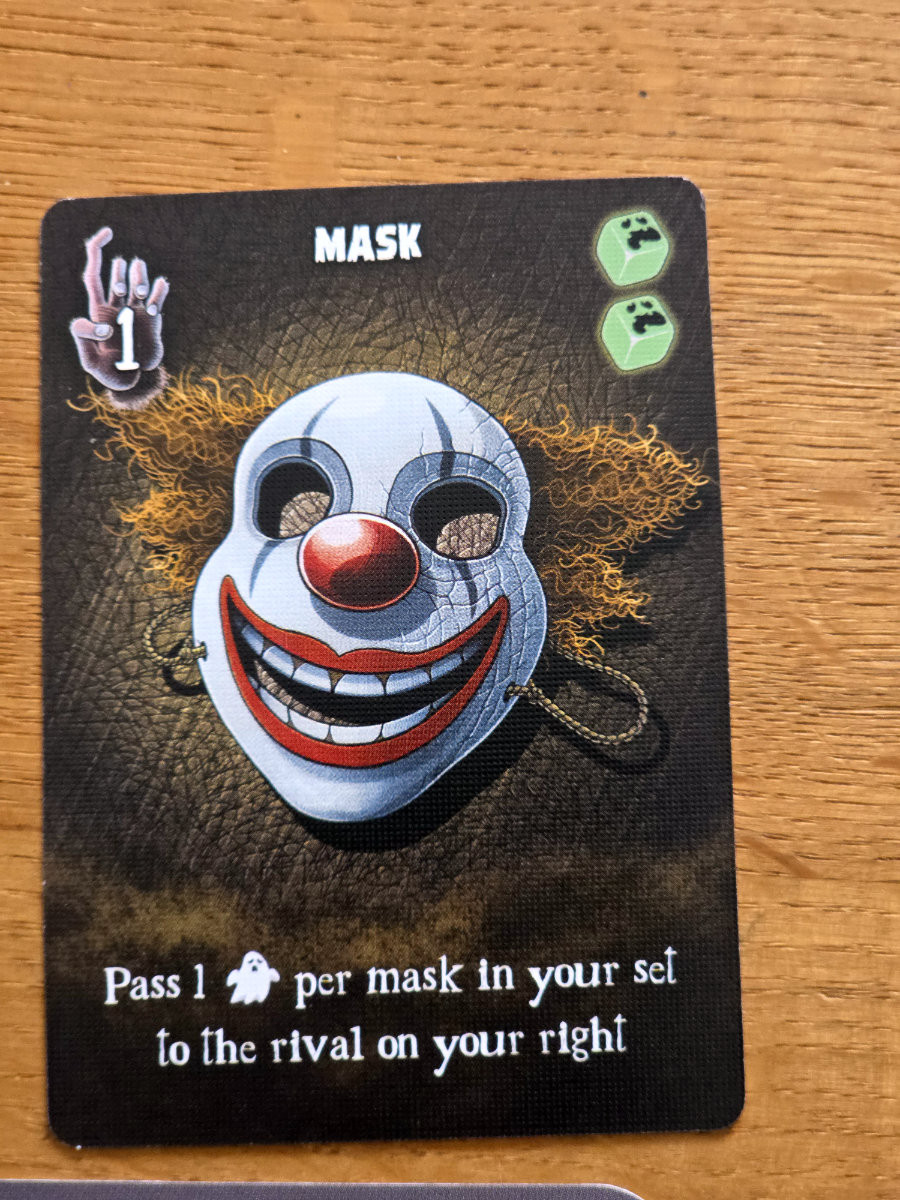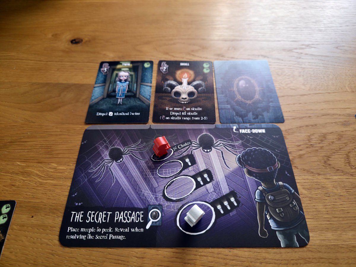 Die Karten, die man aus den Räumen erhält, sind verfluchte Gegenstände – von unheilvollen Spiegeln bis zu mysteriösen Büchern. Manche helfen, Flüche zu bannen, andere bringen zusätzliche Punkte ein, die man tunlichst vermeiden möchte. Die meisten Karten bringen halt Fluch“punkte“ ein, aber einige haben auch Effekte, die dies wieder umkehren können.