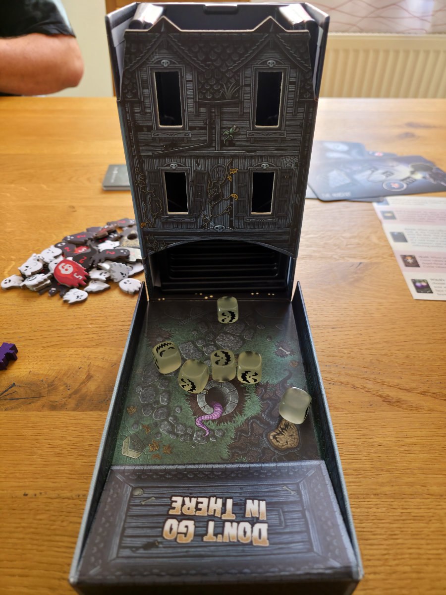 „DGIT“ ist ein herrlich atmosphärisches, leicht zugängliches und zugleich taktisch reizvolles Spiel, das den Nervenkitzel eines Gruselabenteuers perfekt einfängt. Schon beim Öffnen der Schachtel wird klar, dass hier nicht nur das Thema, sondern auch die Präsentation überzeugt. Die Spielbox verwandelt sich in einen stilechten Würfelturm, und die im Dunkeln leuchtenden Geisterwürfel sorgen für den passenden Gänsehautfaktor.