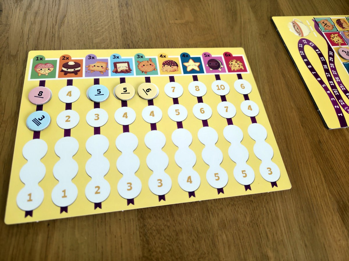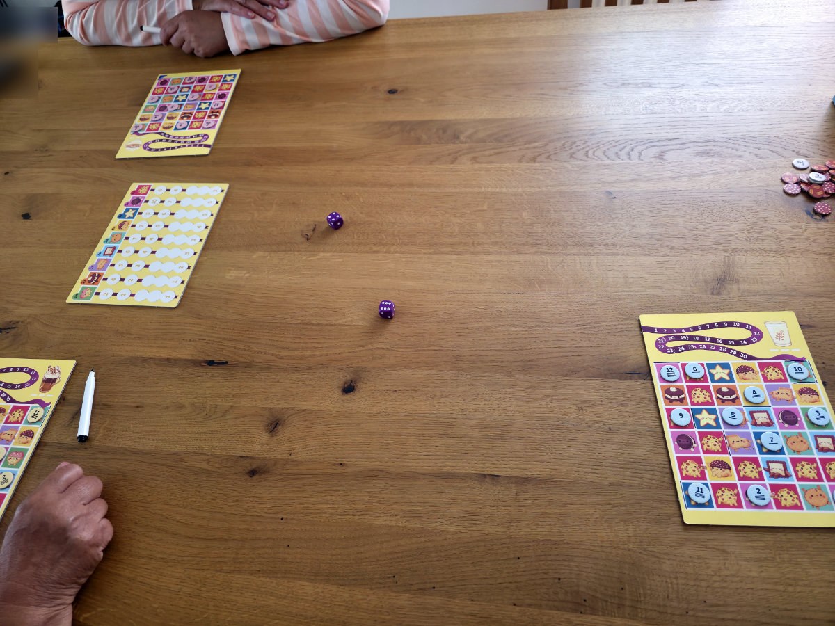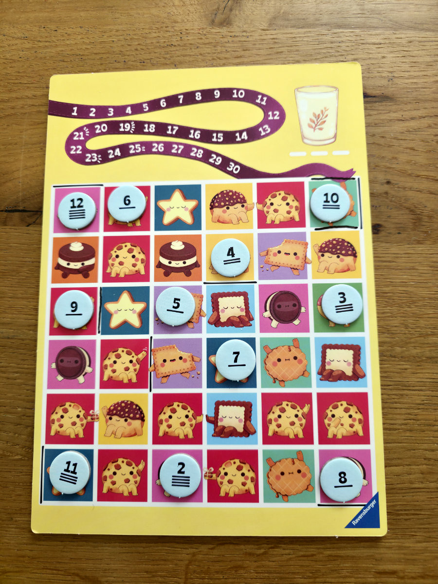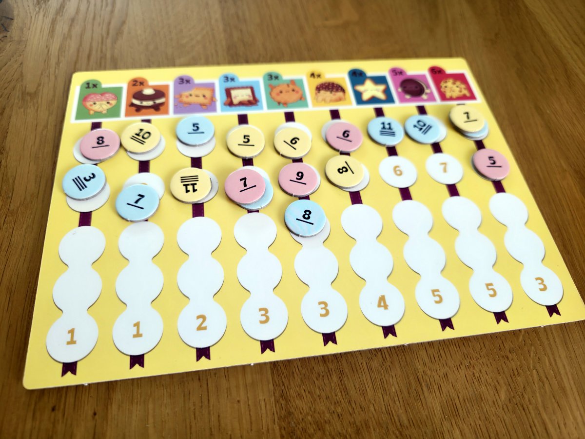 Das Grundprinzip ist schnell erklärt. Auf dem eigenen Spielplan sind Keksfelder in einem Raster angeordnet und zufällig Zahlenplättchen verteilt. In jeder Runde werden zwei Würfel geworfen und so festgestellt, welches Kekskästchen aktuell mit 1-4 Wänden versehen werden darf. Es geht dabei immer um das Feld, auf dem ein zum Wurfergebnis passendes Zahlenplättchen liegt. Die Zahlenplättchen haben zudem eine Anzahl (1-4) von Balken auf sich, die eben angeben, wie viele „Wände“ man nun einzeichnen darf.