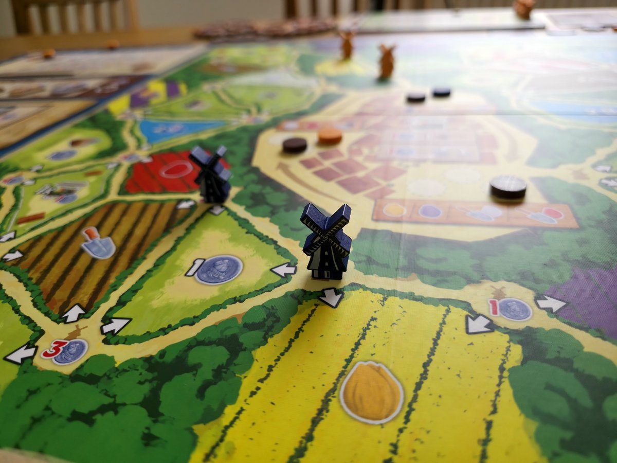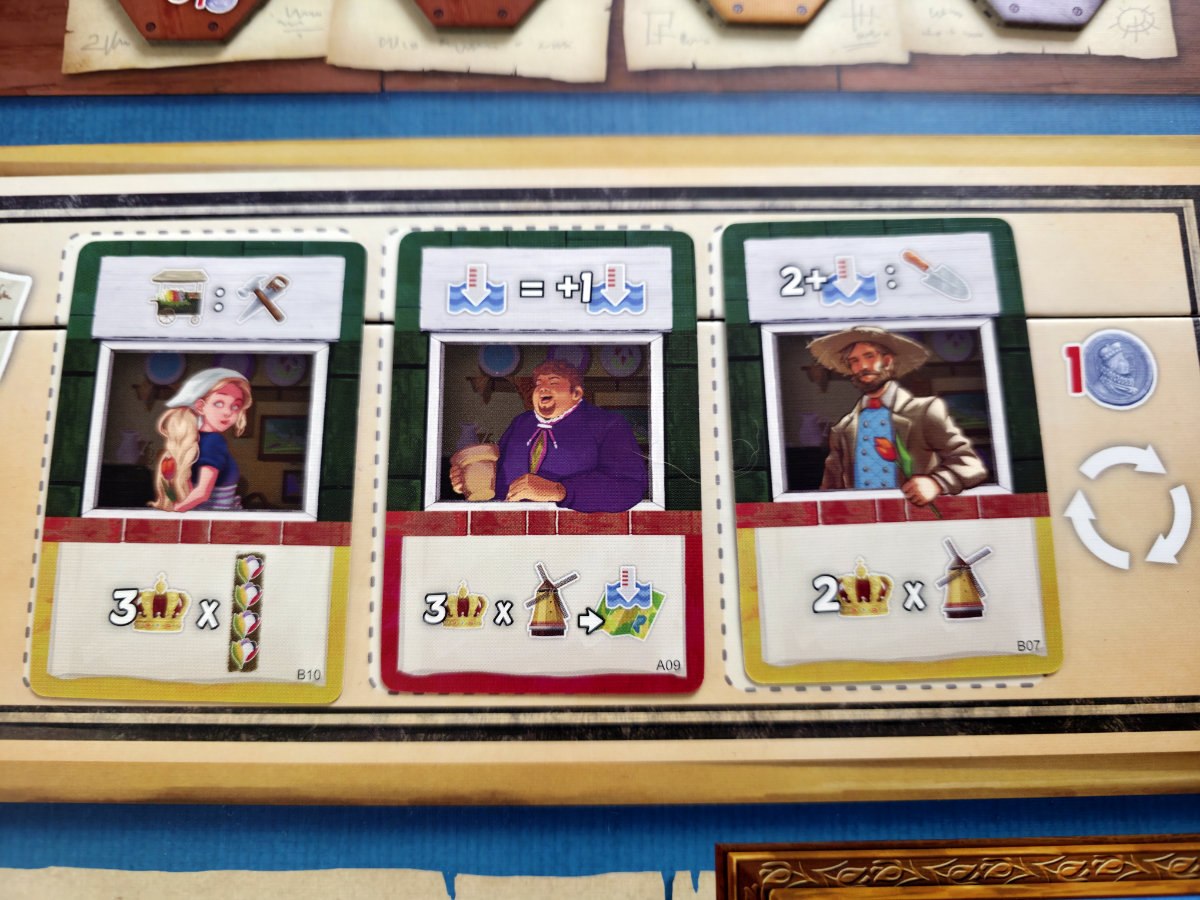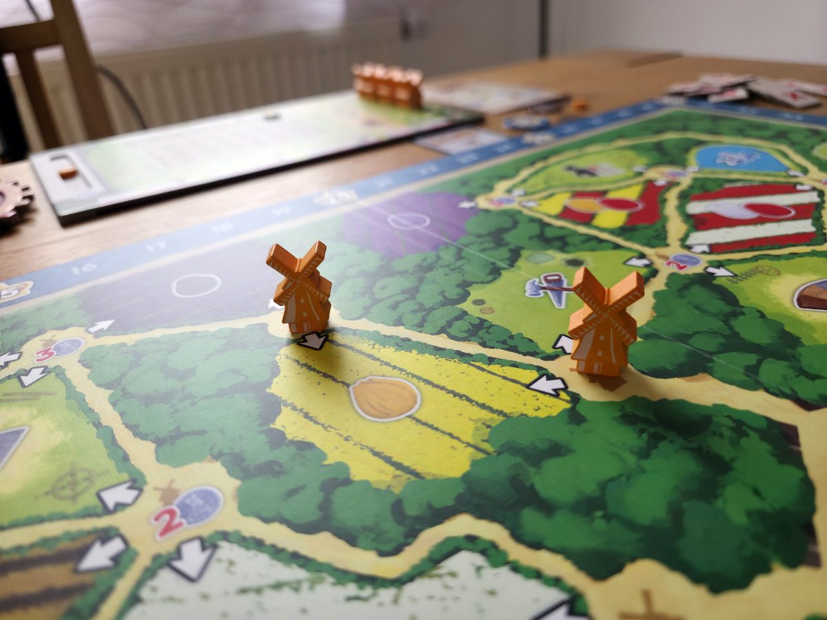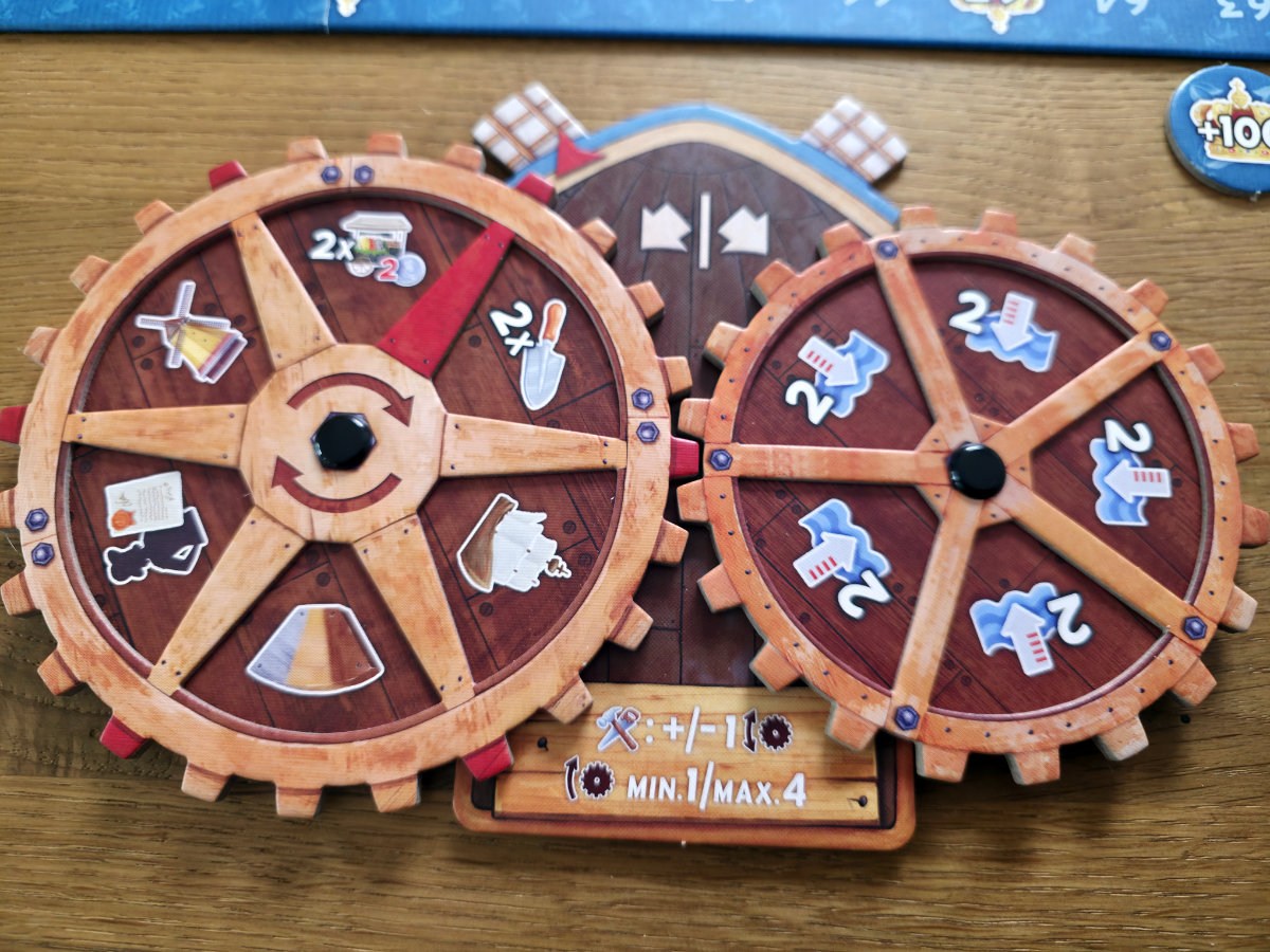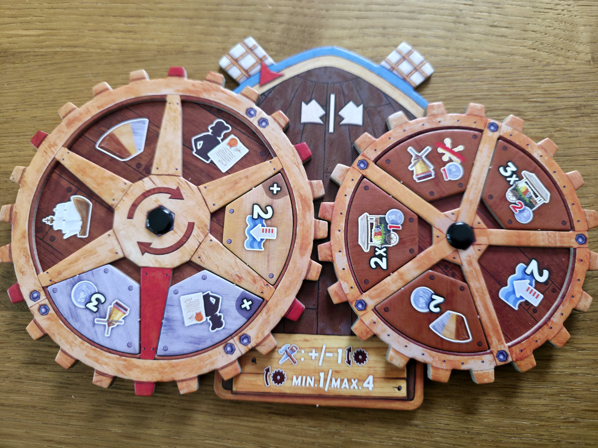 Der Einstieg beginnt mit bescheidenen Mitteln. Jeder Spieler verfügt über ein kleines Stück Land, ein paar Windmühlen und Tulpenzwiebeln. Von hier aus entfaltet sich der Kern des Spiels – ein elegantes Engine-Building-System. Die zentrale Mechanik basiert auf einem Rondell, über das die Spieler ihre Aktionen auswählen. Dieses Aktionsrad lässt sich im Verlauf der Partie durch sogenannte „Wheel Enhancement Tiles“ aufwerten, wodurch sich nicht nur die Effizienz, sondern auch die strategische Flexibilität erhöht.