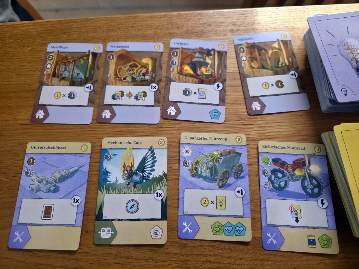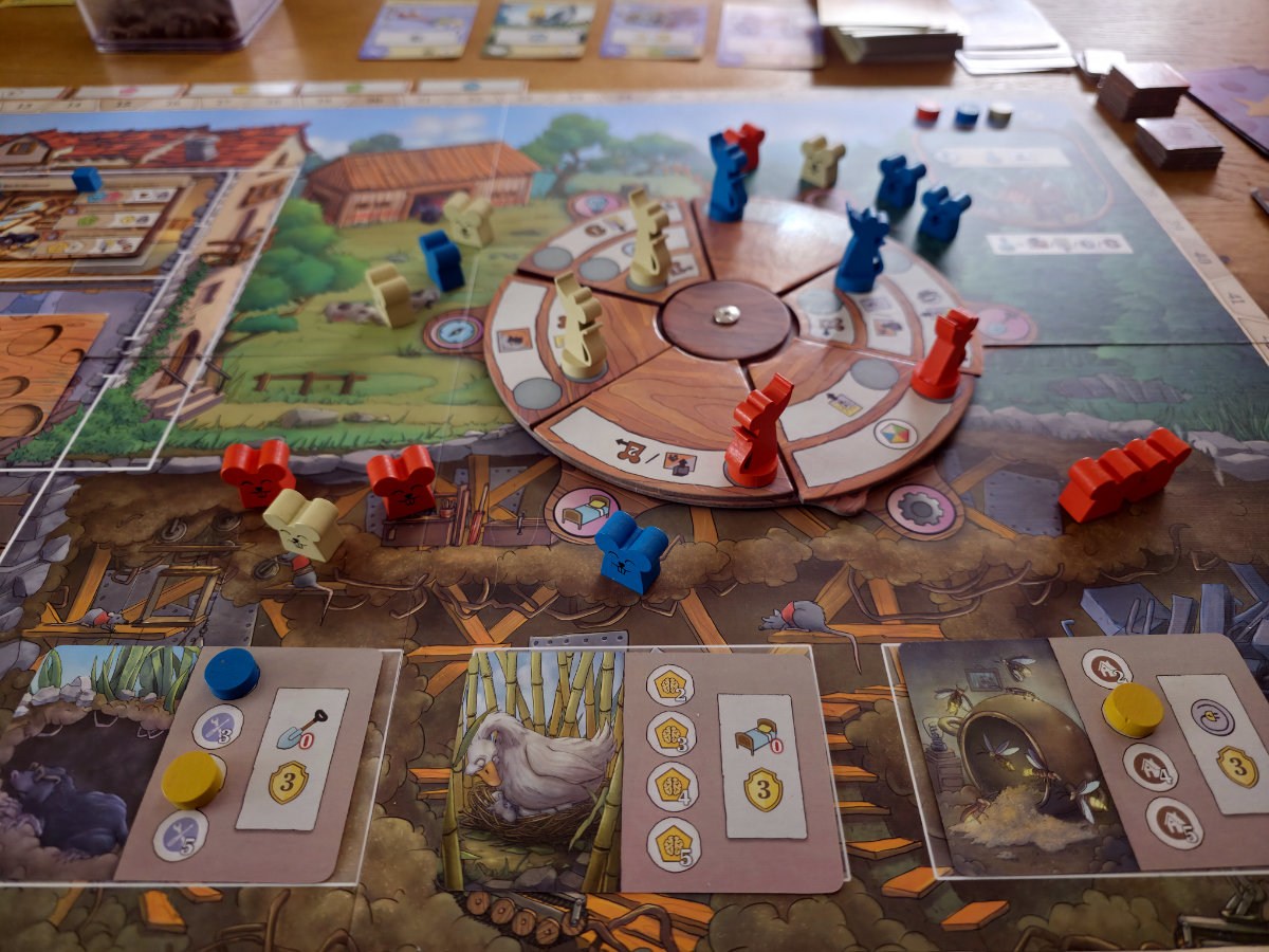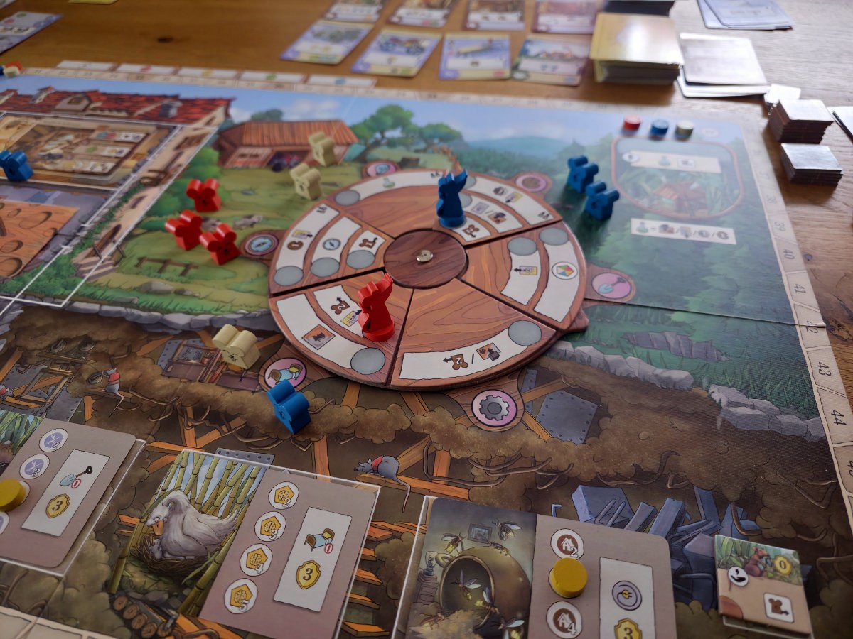 Das Herzstück des Spiels ist ein Aktionsrad, das sich nach jeder Runde weiterdreht. Klingt harmlos, ist aber ein taktisches Minenfeld. Denn jede Aktion – sei es Ressourcen sammeln, Erfindungen bauen oder das eigene Tableau ausbauen – wird durch das Rad beeinflusst. Boni verändern sich, Optionen verschieben sich, und wer nicht mitdenkt, steht schnell mit leerem Käselager da.
