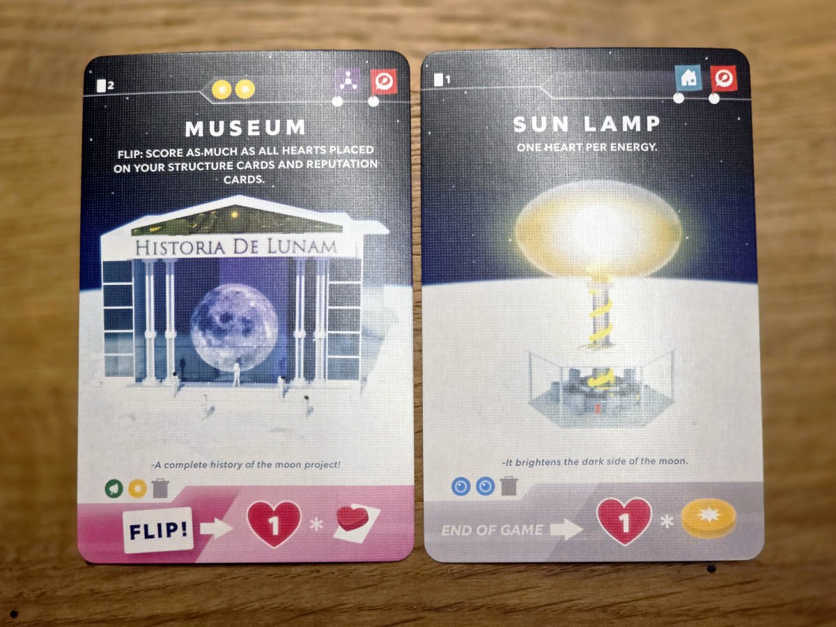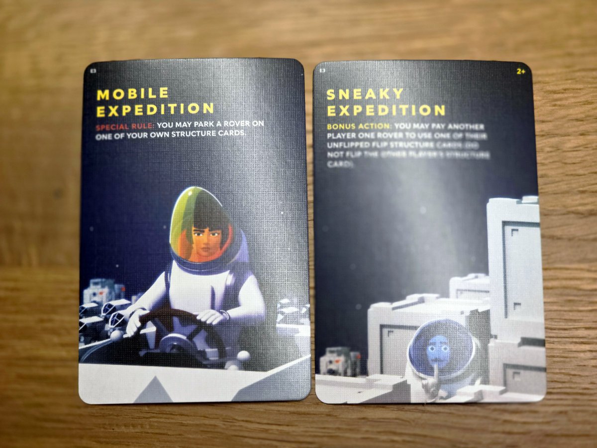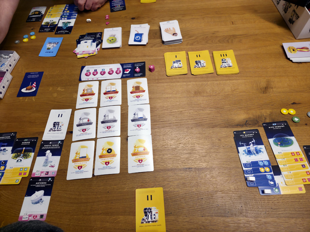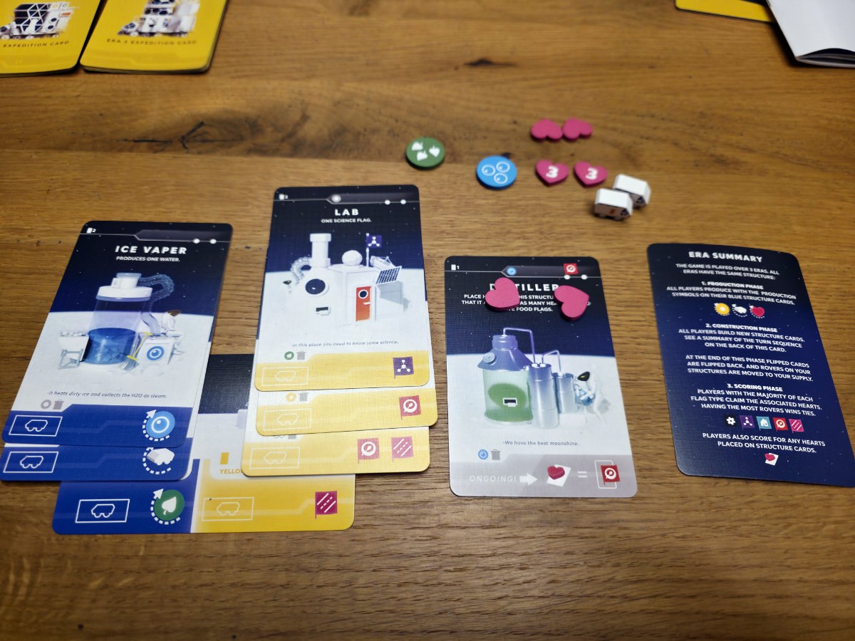 Ein zentrales Element sind die Mondrover, kleine Holzmarker, die auf „gebaute“ Karten der Mitspieler bewegt werden können, um Interaktionen zu ermöglichen. Diese Rover erlauben es, bestimmte Boni zu erhalten oder Mehrheiten zu beeinflussen – ein cleverer Mechanismus, der für zusätzliche taktische Tiefe sorgt. Auch die Mehrheit von „Flaggen“ (symbolisch für Gebäudearten) spielt eine wichtige Rolle. Wer bestimmte Bedingungen erfüllt, erhält in der Wertungsphase am Ende jeder Ära extra Punkte.