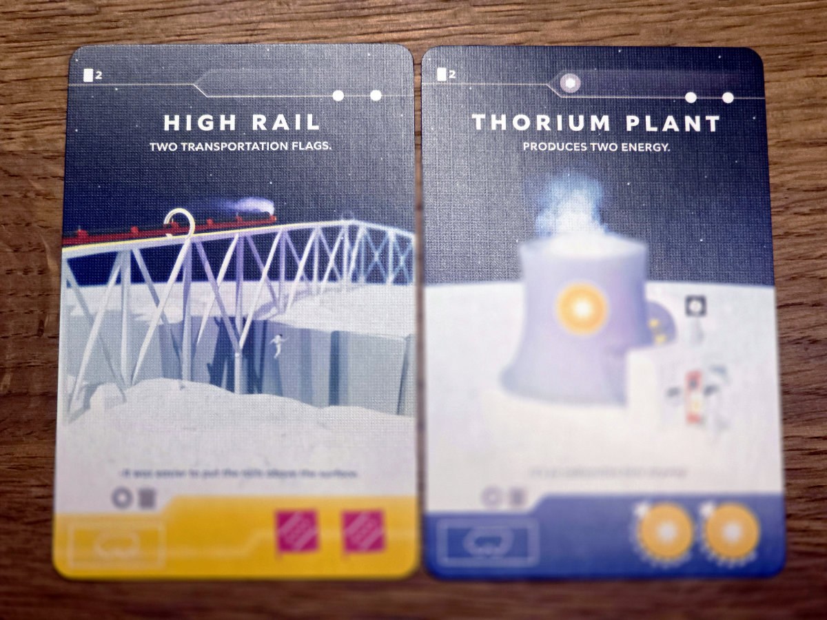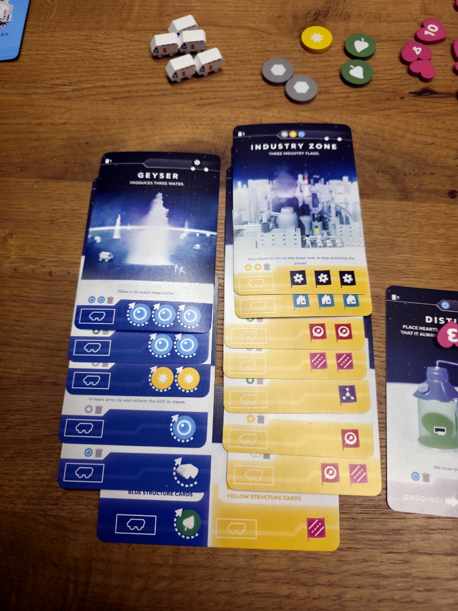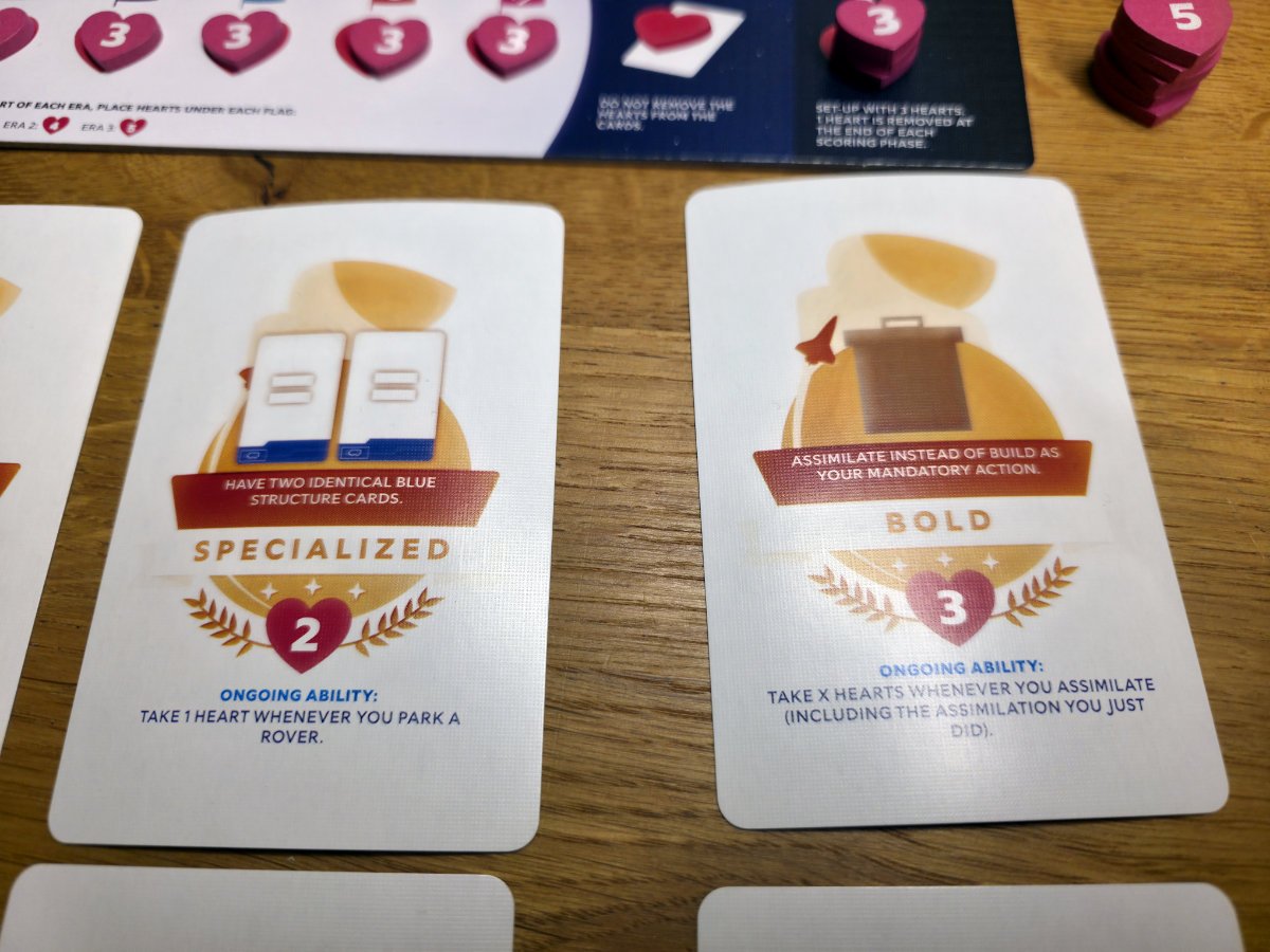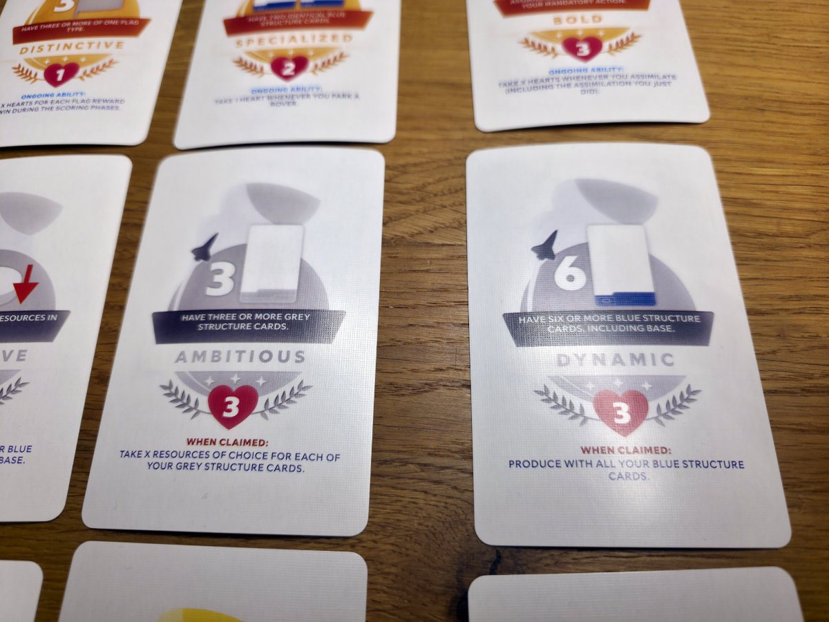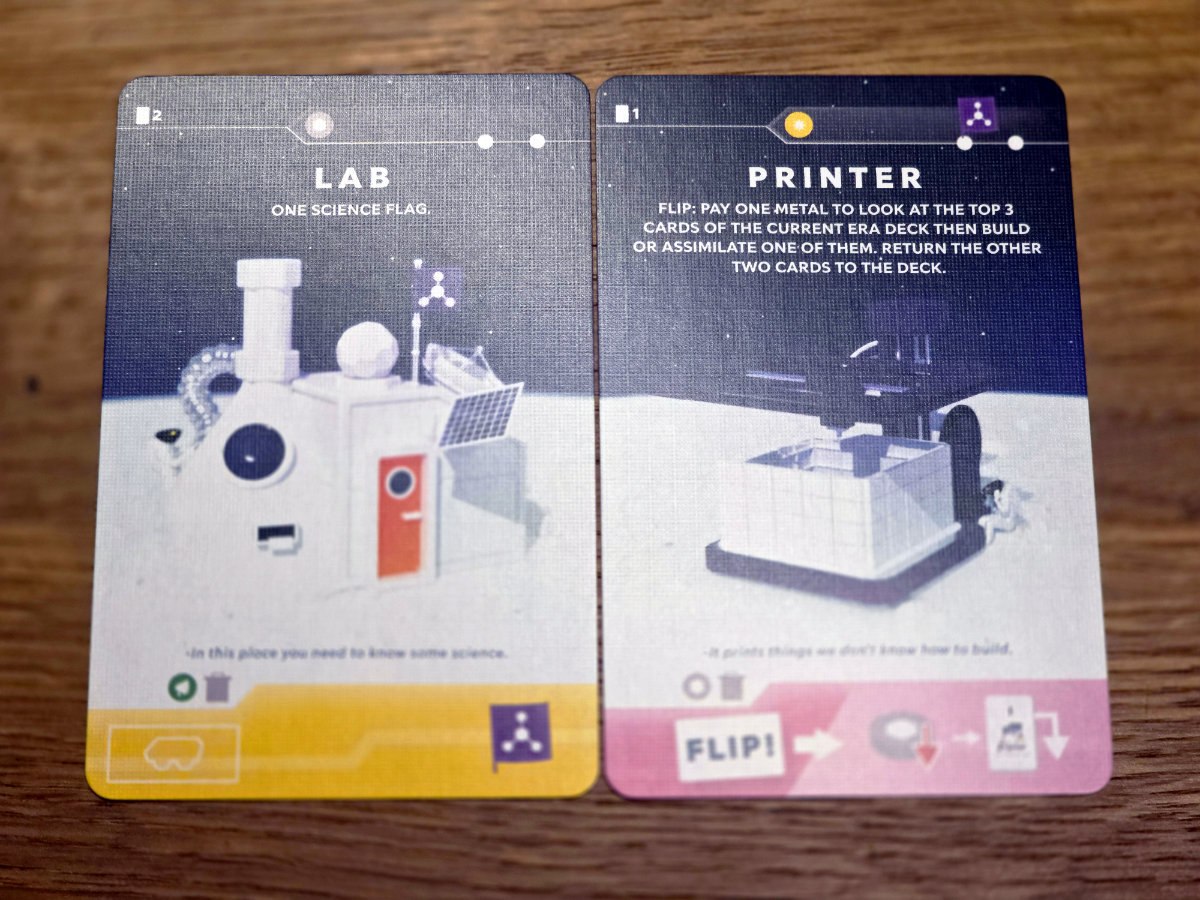 Ein zentrales Element sind die Mondrover, kleine Holzmarker, die auf „gebaute“ Karten der Mitspieler bewegt werden können, um Interaktionen zu ermöglichen. Diese Rover erlauben es, bestimmte Boni zu erhalten oder Mehrheiten zu beeinflussen – ein cleverer Mechanismus, der für zusätzliche taktische Tiefe sorgt. Auch die Mehrheit von „Flaggen“ (symbolisch für Gebäudearten) spielt eine wichtige Rolle. Wer bestimmte Bedingungen erfüllt, erhält in der Wertungsphase am Ende jeder Ära extra Punkte.