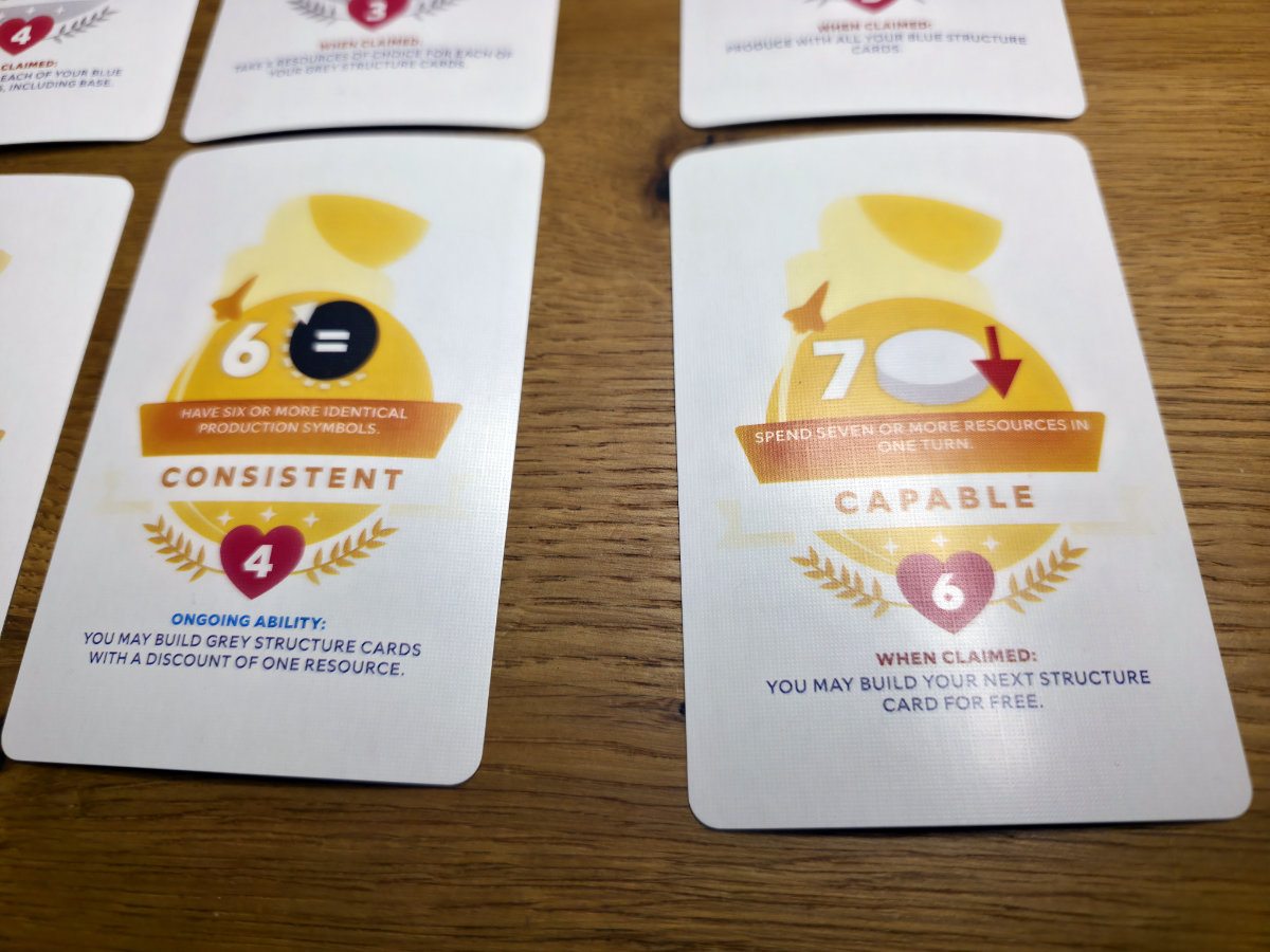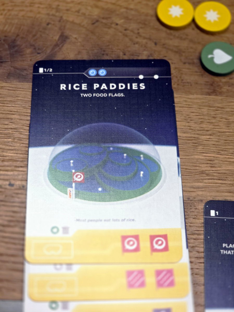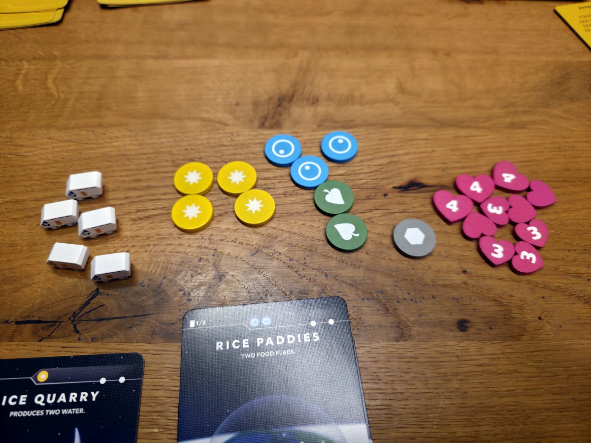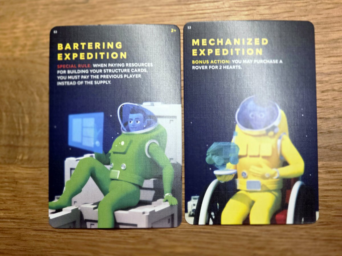 Ein zentrales Element sind die Mondrover, kleine Holzmarker, die auf „gebaute“ Karten der Mitspieler bewegt werden können, um Interaktionen zu ermöglichen. Diese Rover erlauben es, bestimmte Boni zu erhalten oder Mehrheiten zu beeinflussen – ein cleverer Mechanismus, der für zusätzliche taktische Tiefe sorgt. Auch die Mehrheit von „Flaggen“ (symbolisch für Gebäudearten) spielt eine wichtige Rolle. Wer bestimmte Bedingungen erfüllt, erhält in der Wertungsphase am Ende jeder Ära extra Punkte.
