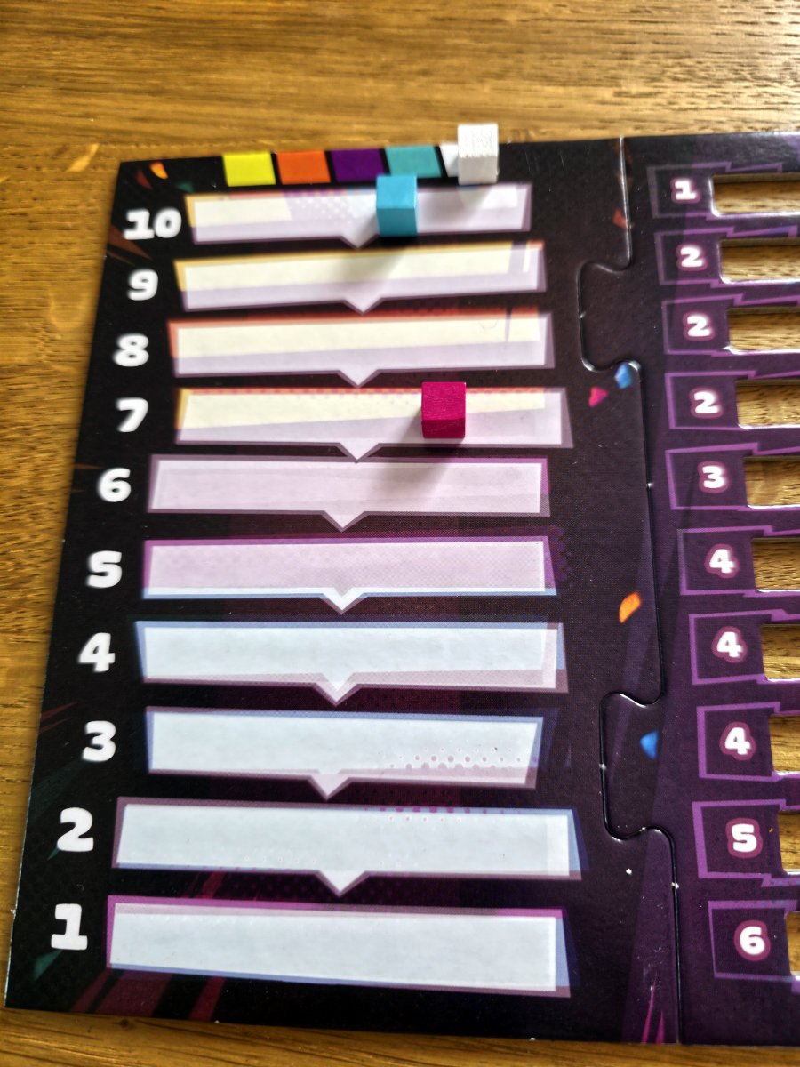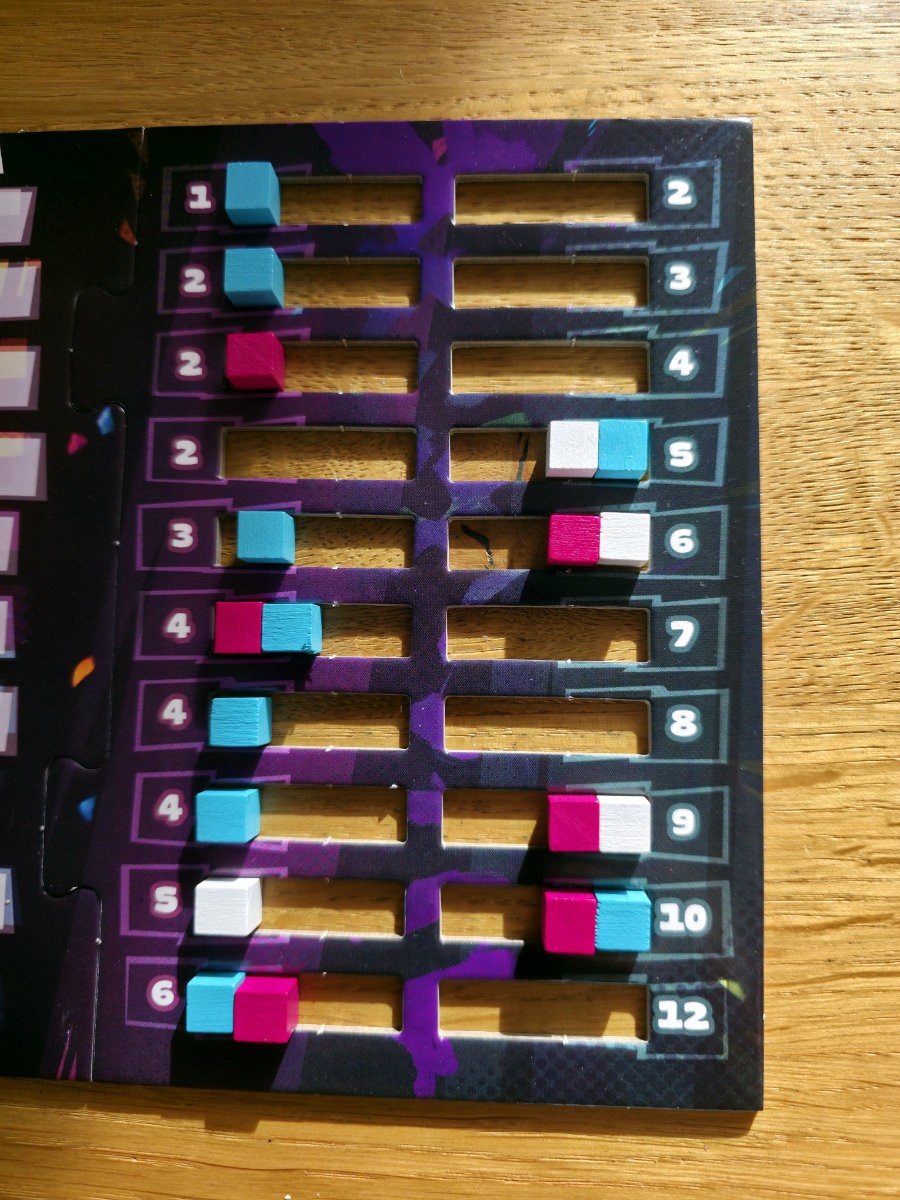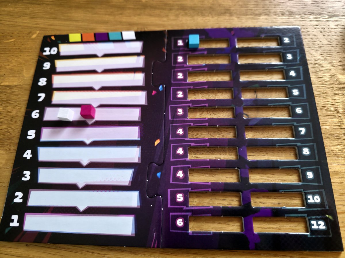 Mit kleinen Holzwürfelchen werden die gesammelten Punkte in einem Rahmengitter sichtbar gemacht. So wächst vor aller Augen das eigene Punktekonto – oder eben nicht, wenn man sich verzockt hat. Hierbei erhält auf der linken Rahmenseite Punkte, wer frühzeitig aussteigt und auf der rechten Seite Punkte für Durchhaltevermögen ;)! Natürlich sind die Punkte dabei so gestaffelt, dass es nur wenig für Aussteiger und viel für diejenigen gibt, die die Aufgabe gemeistert haben.