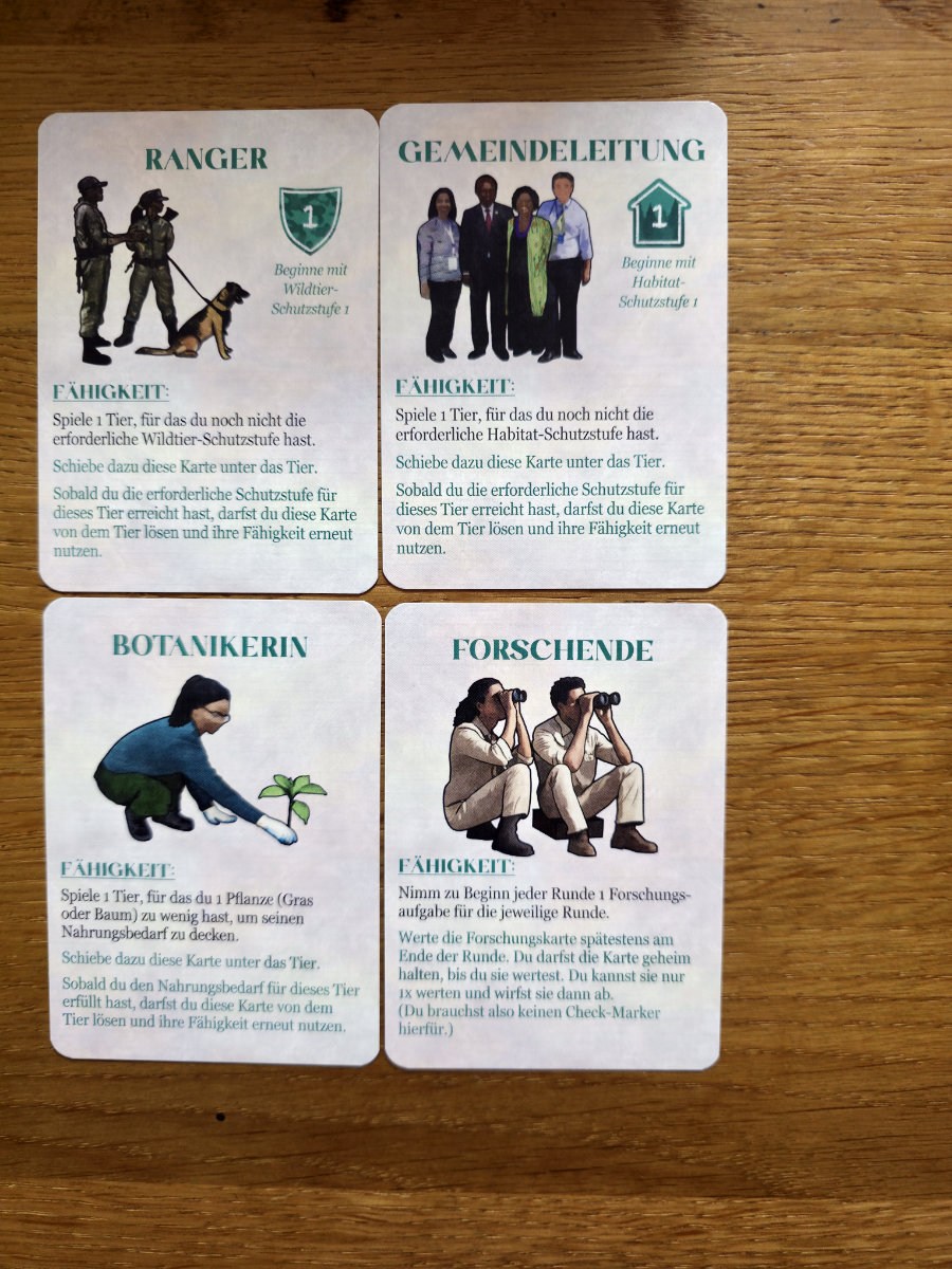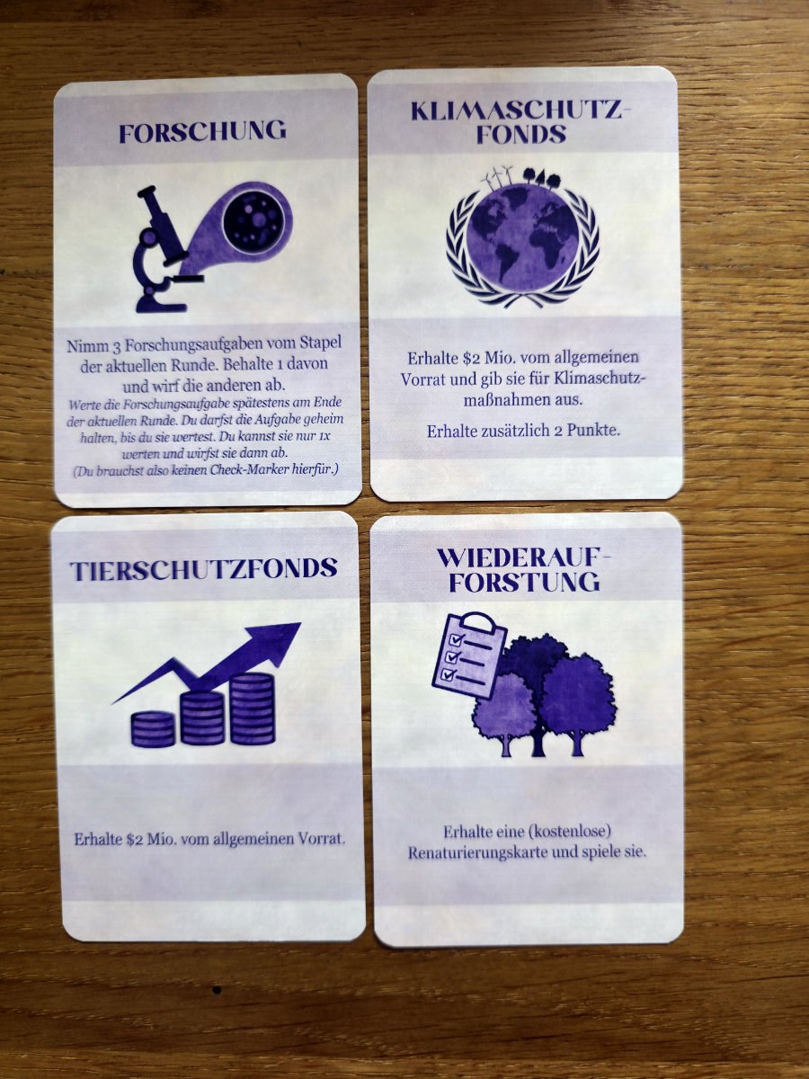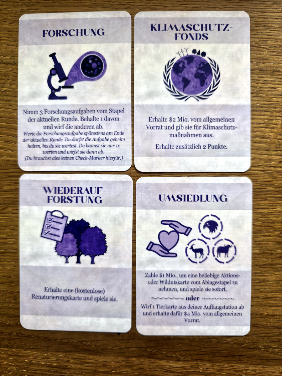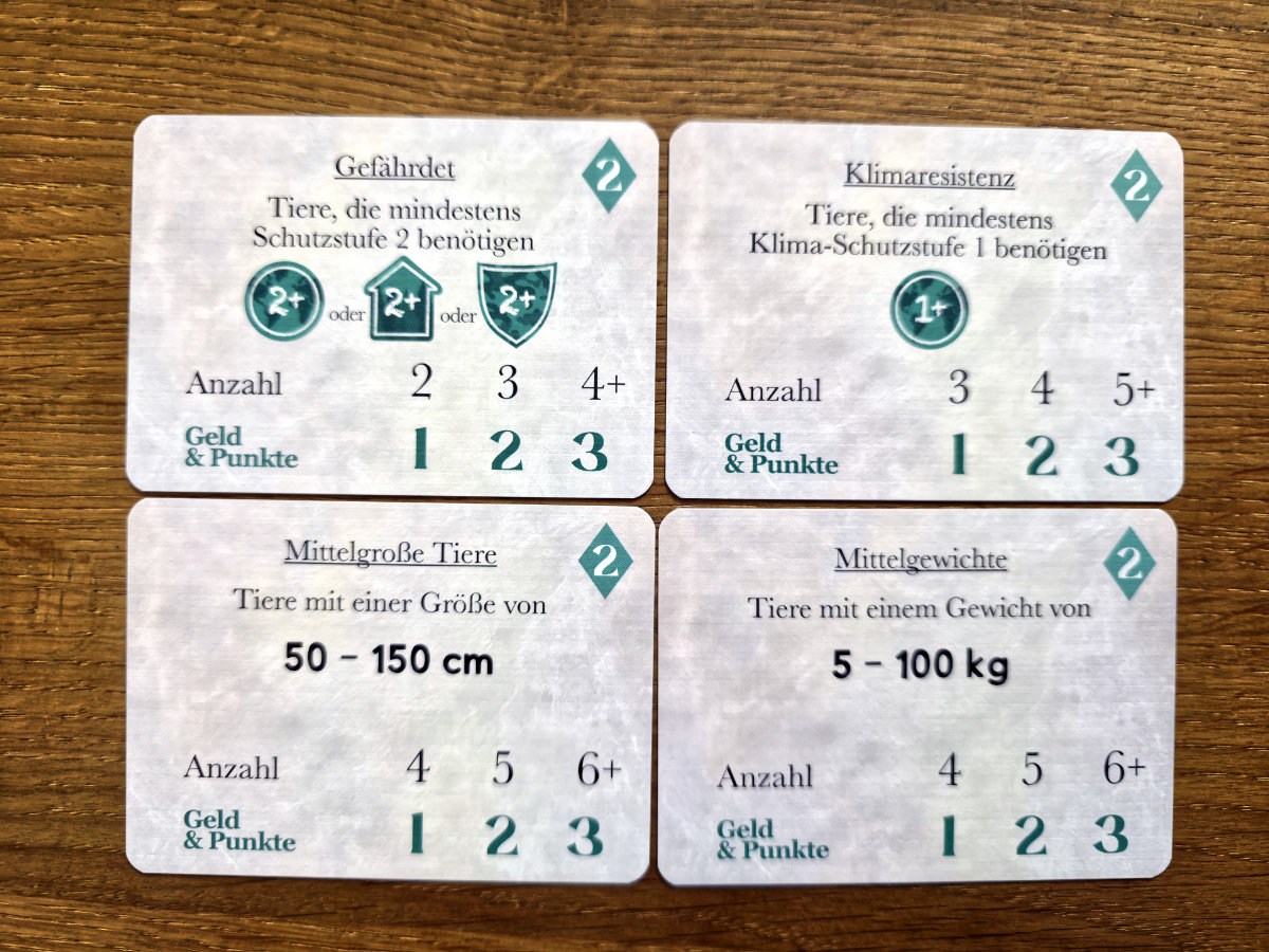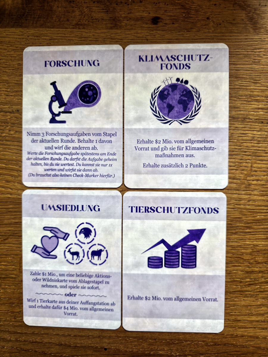 Spannend ist hierbei auch die semi-kooperative Komponente. Viele Tiere benötigen ein bestimmtes globales Klimaschutzniveau, das nur durch gemeinsame Investitionen aller Spieler erreicht werden kann. Diese Investitionen erfolgen mit Geld, das durch das Erfüllen von Forschungsaufträgen verdient wird. Die Spieler müssen also abwägen, ob sie sofort Geld benötigen oder lieber auf eine spätere, lukrativere Wertung warten. Zusätzlich können sie ihr Reservat durch Schutzmaßnahmen gegen Wilderei und Habitatverlust aufwerten oder spezielle Wiederansiedlungskarten erwerben.