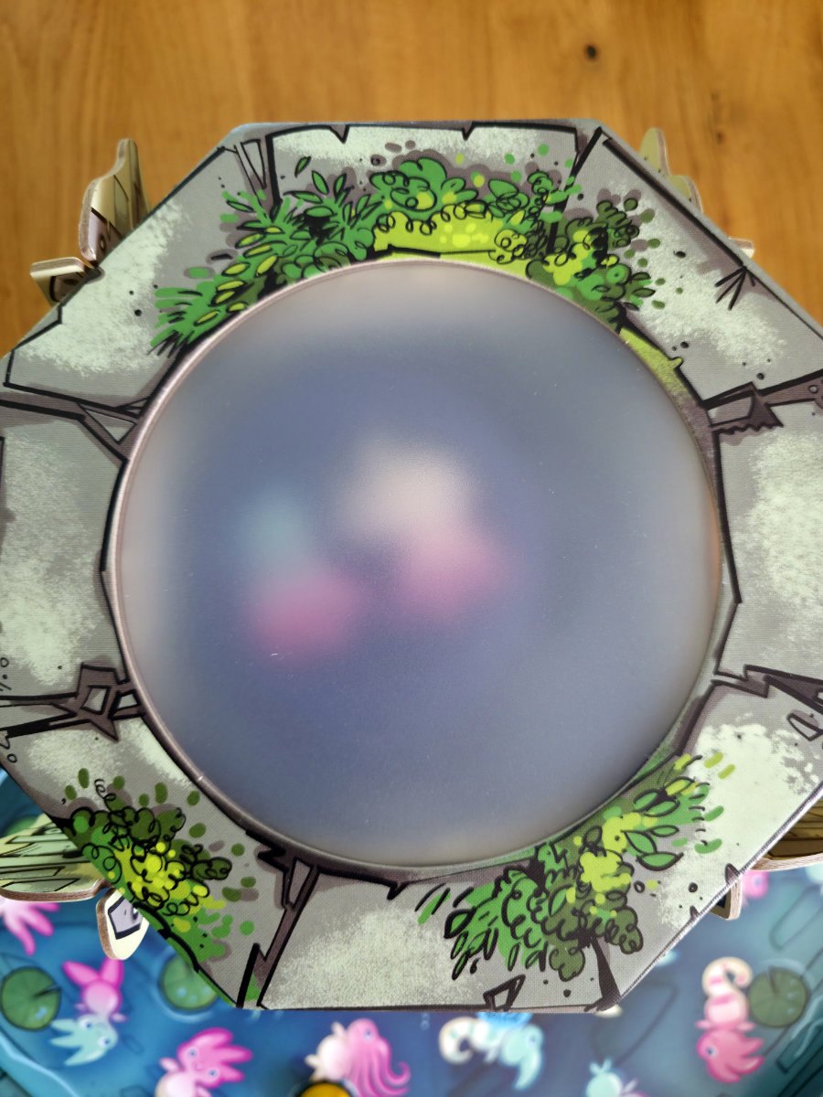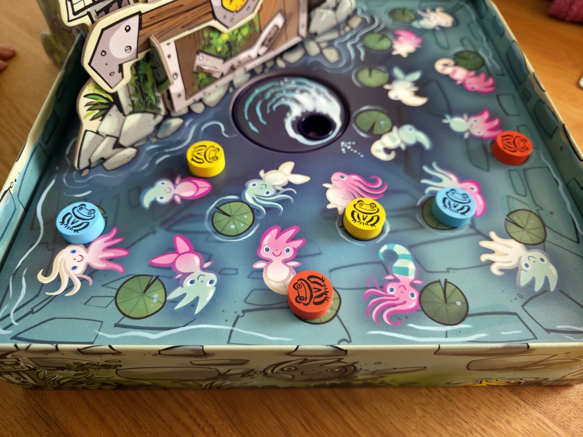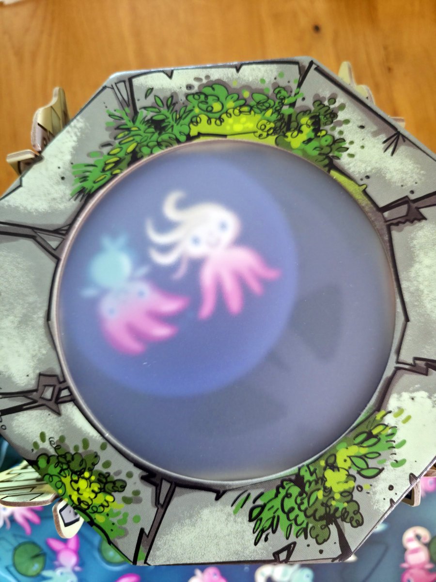 Der Clou des Spiels liegt in der Mechanik. Über eine kleine Zugbrücke werden Plättchen in den Brunnen befördert. Diese Plättchen zeigen die Wichtel, deren Köpfe und Körper in unterschiedlichen Farben und Formen gestaltet sind. Doch sobald ein Plättchen unten im Brunnen liegt, ist es zunächst kaum zu erkennen. Erst wenn ein Spieler an der Hebemechanik dreht, wird das Plättchen Stück für Stück nach oben geschoben – und damit näher an die Abdeckung gebracht. Wie durch einen Schleier erscheinen langsam die Farben, Konturen und schließlich die Details der kleinen Figuren. Es ist ein Moment voller Spannung, fast so, als würde man ein Geheimnis lüften, das sich nur den Geduldigen offenbart.