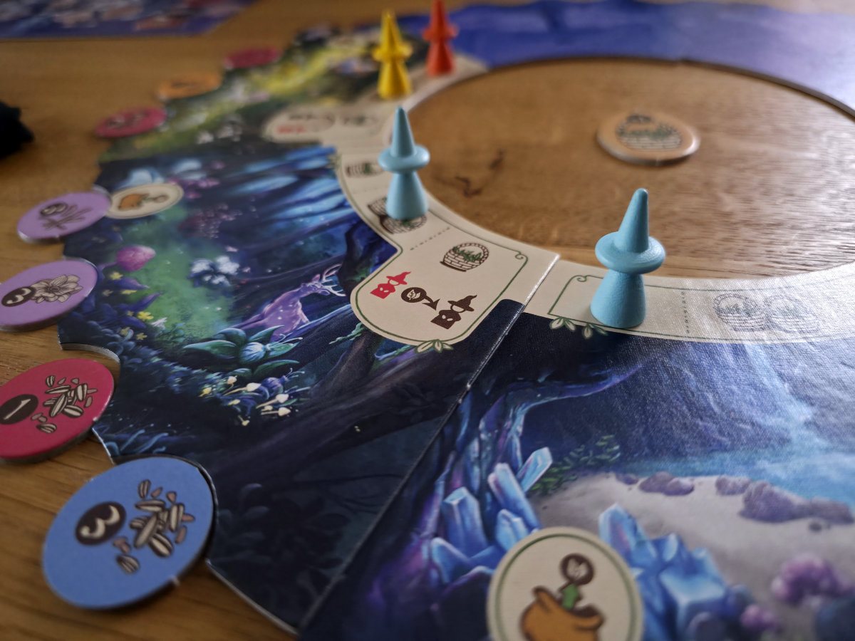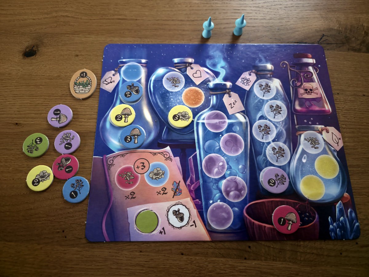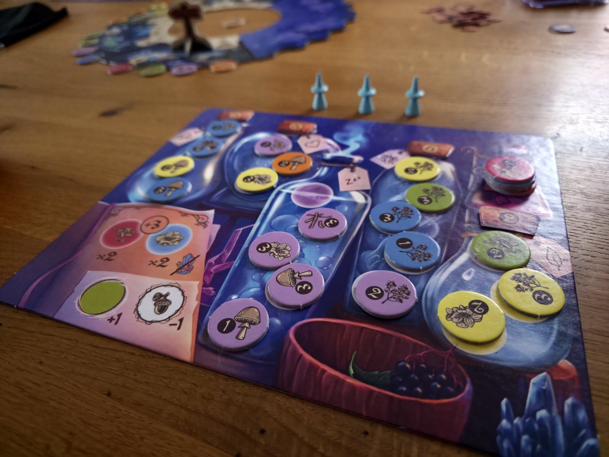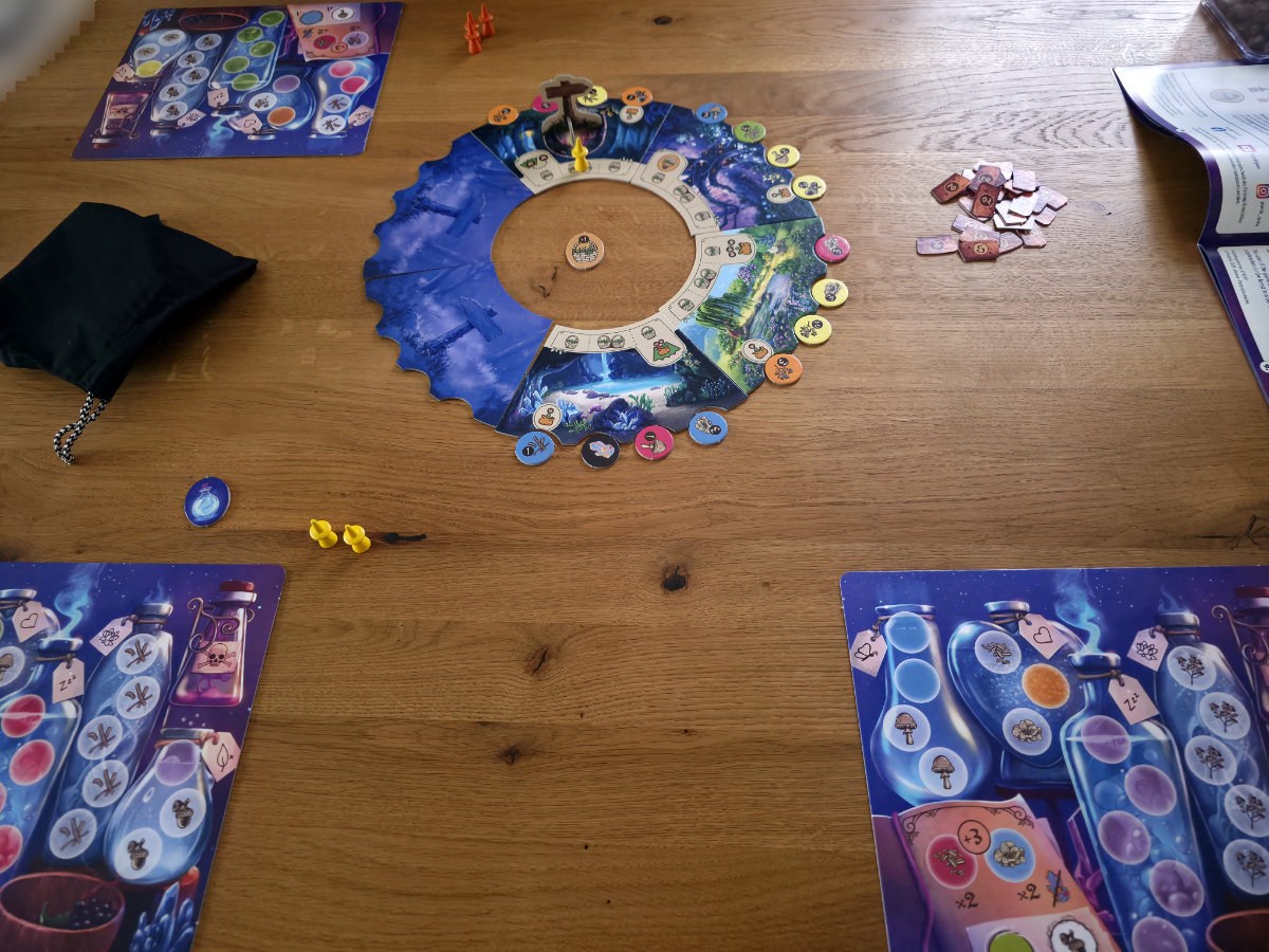Der Spielablauf ist schnell erklärt. Die Spieler bewegen ihre Figuren auf einem Rundparcours, der wie ein magischer Kreislauf angelegt ist – nur 4 von den 6 Rundteilen sind immer aufgedeckt. An den einzelnen Stationen liegen Plättchen aus, die für die Herstellung der Elixire benötigt werden. Wer seine Figur geschickt platziert, erhält die passenden Zutaten – doch hier liegt die Raffinesse. Man muss im Voraus planen, denn nicht jedes Feld liefert sofort das gewünschte Plättchen. Wer unbedacht zieht, läuft Gefahr, wichtige Zutaten zu verpassen und den Mitspielern die besseren Optionen zu überlassen.