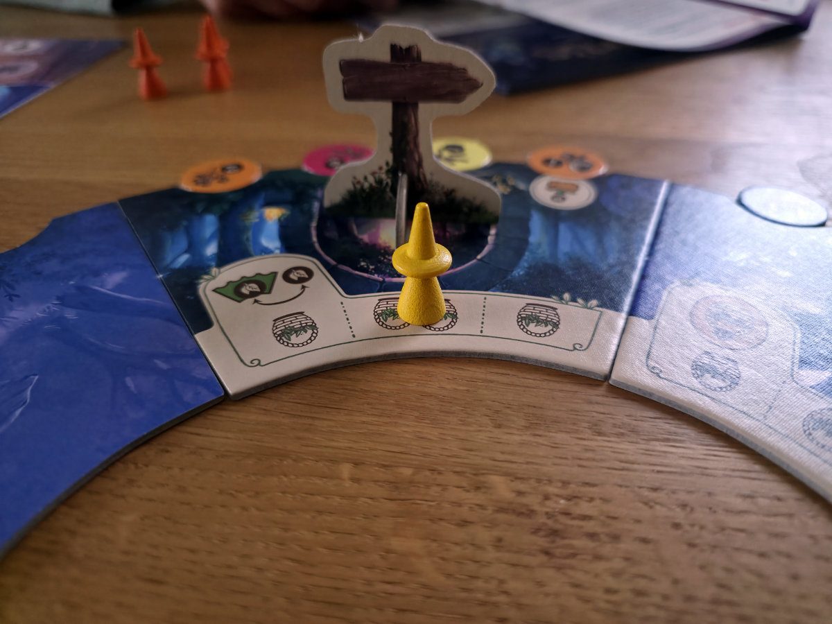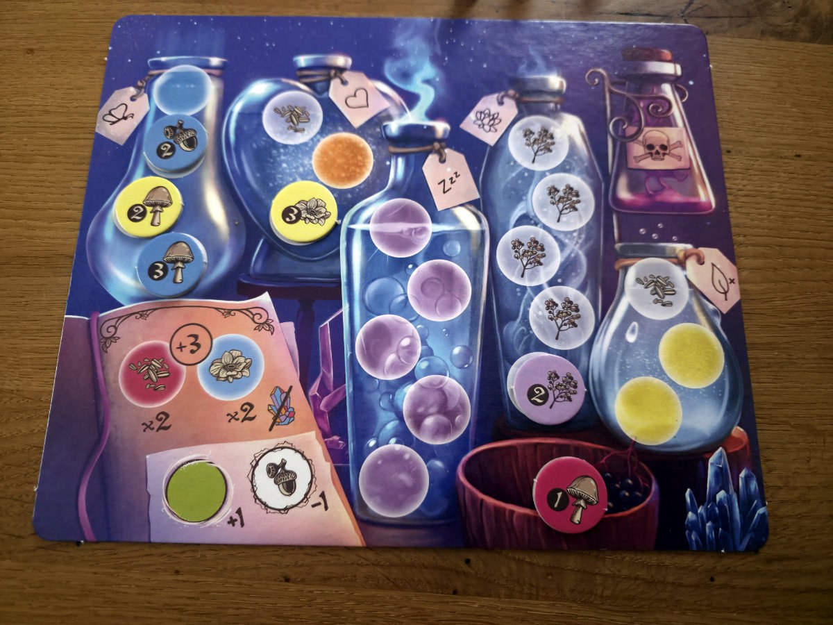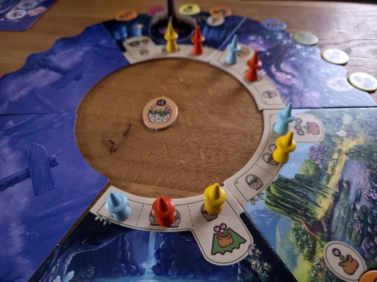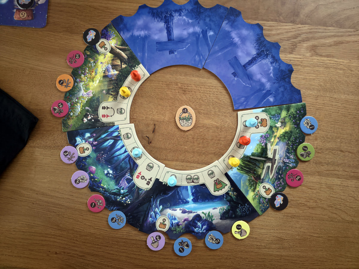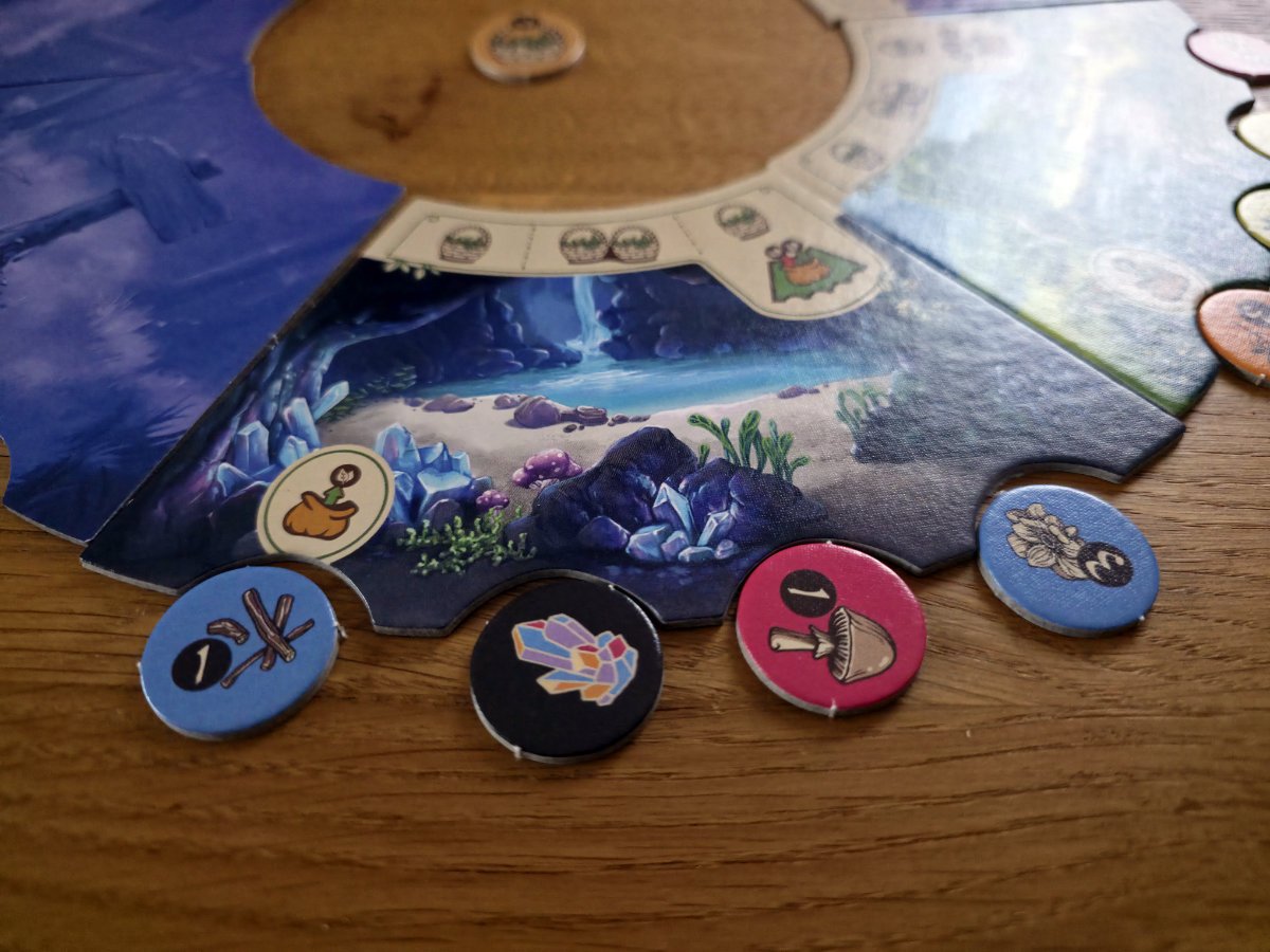 Der Spielablauf ist schnell erklärt. Die Spieler bewegen ihre Figuren auf einem Rundparcours, der wie ein magischer Kreislauf angelegt ist – nur 4 von den 6 Rundteilen sind immer aufgedeckt. An den einzelnen Stationen liegen Plättchen aus, die für die Herstellung der Elixire benötigt werden. Wer seine Figur geschickt platziert, erhält die passenden Zutaten – doch hier liegt die Raffinesse. Man muss im Voraus planen, denn nicht jedes Feld liefert sofort das gewünschte Plättchen. Wer unbedacht zieht, läuft Gefahr, wichtige Zutaten zu verpassen und den Mitspielern die besseren Optionen zu überlassen.