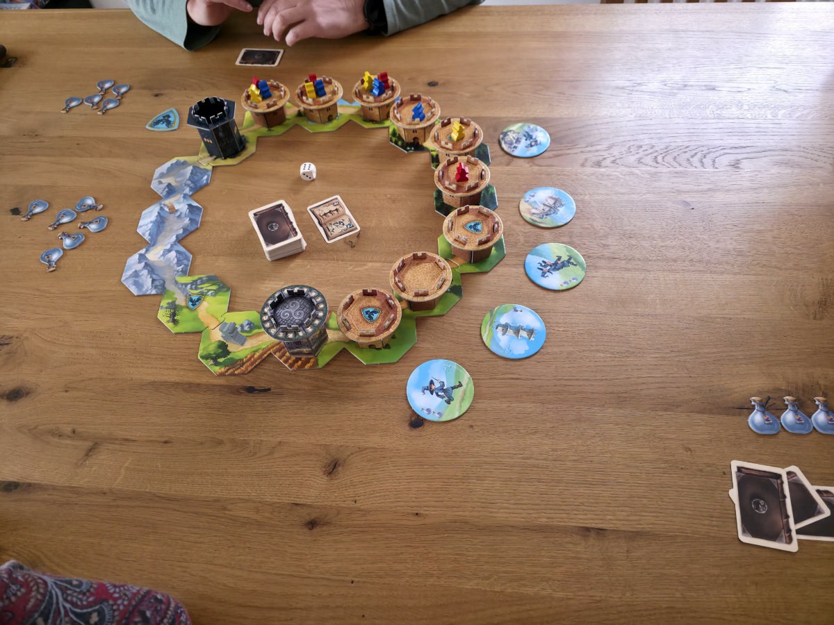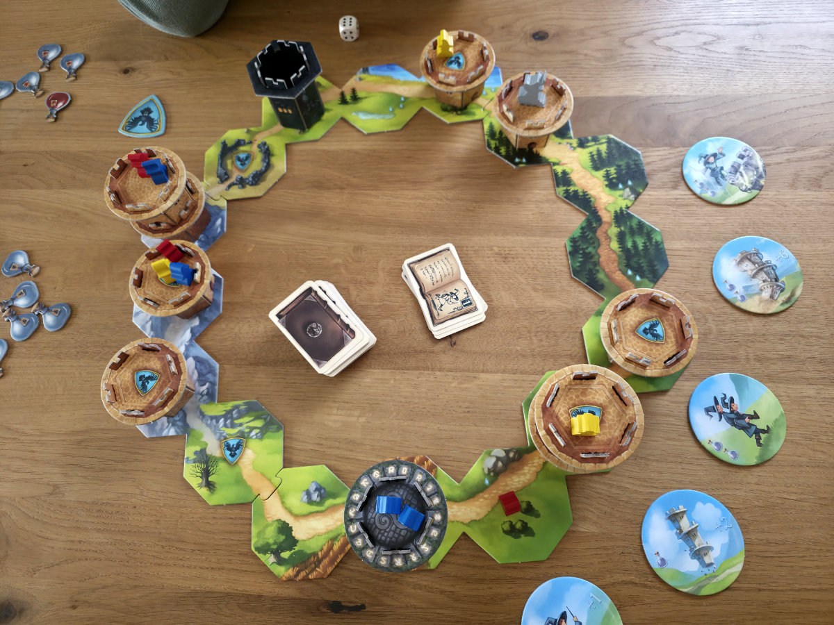 „DwT“ ist ein Spiel, das schon beim ersten Aufbau ein Schmunzeln provoziert. Türme, die nicht stillstehen, sondern selbst über den Parcours marschieren und Magier, die versuchen, trotz aller Hindernisse ihr Ziel – die Rabenburg – zu erreichen.