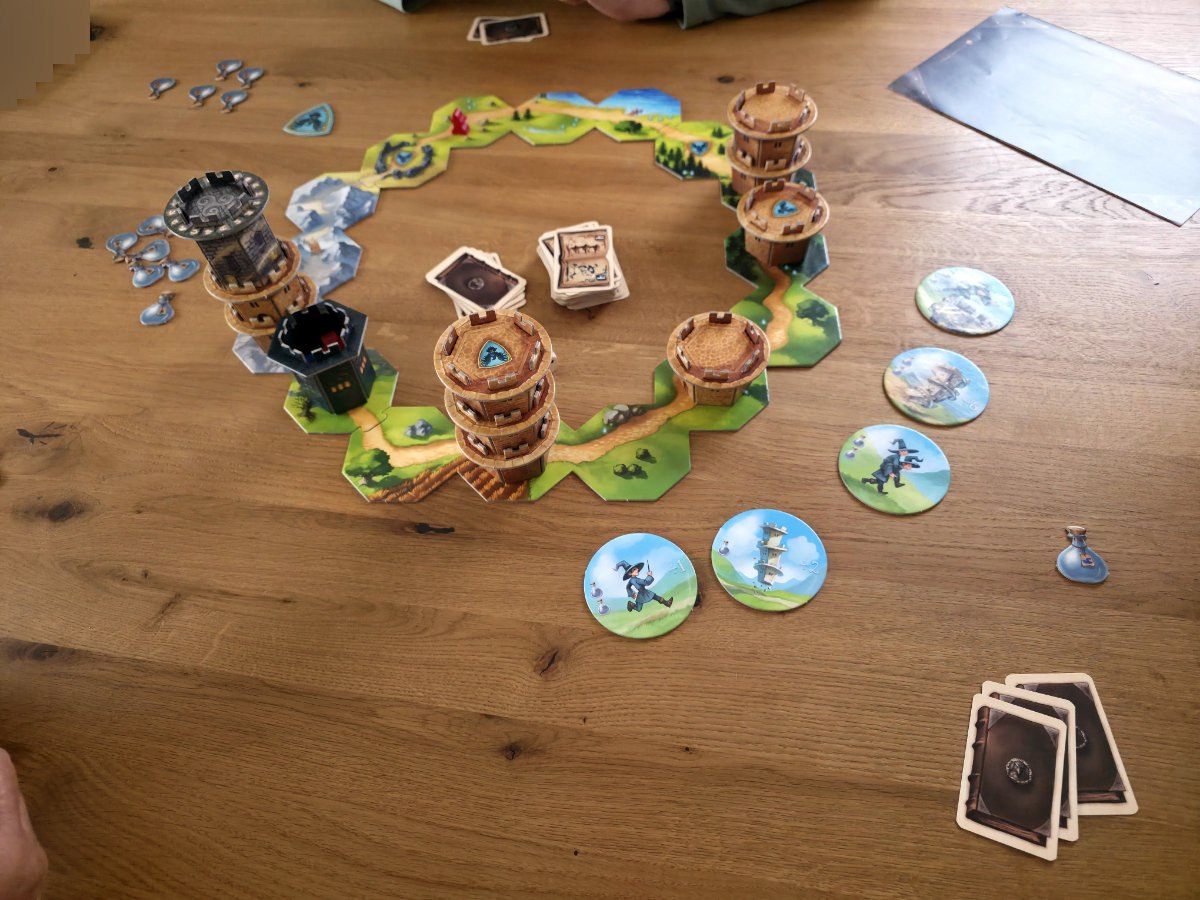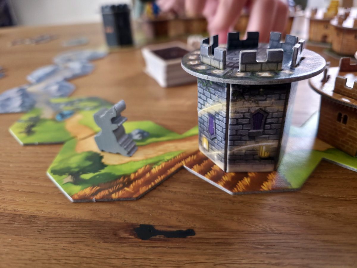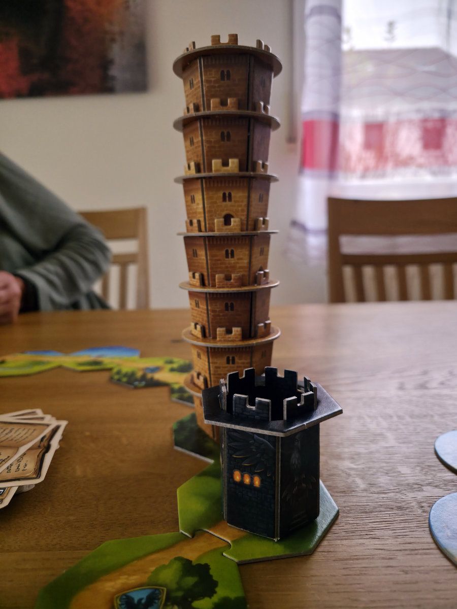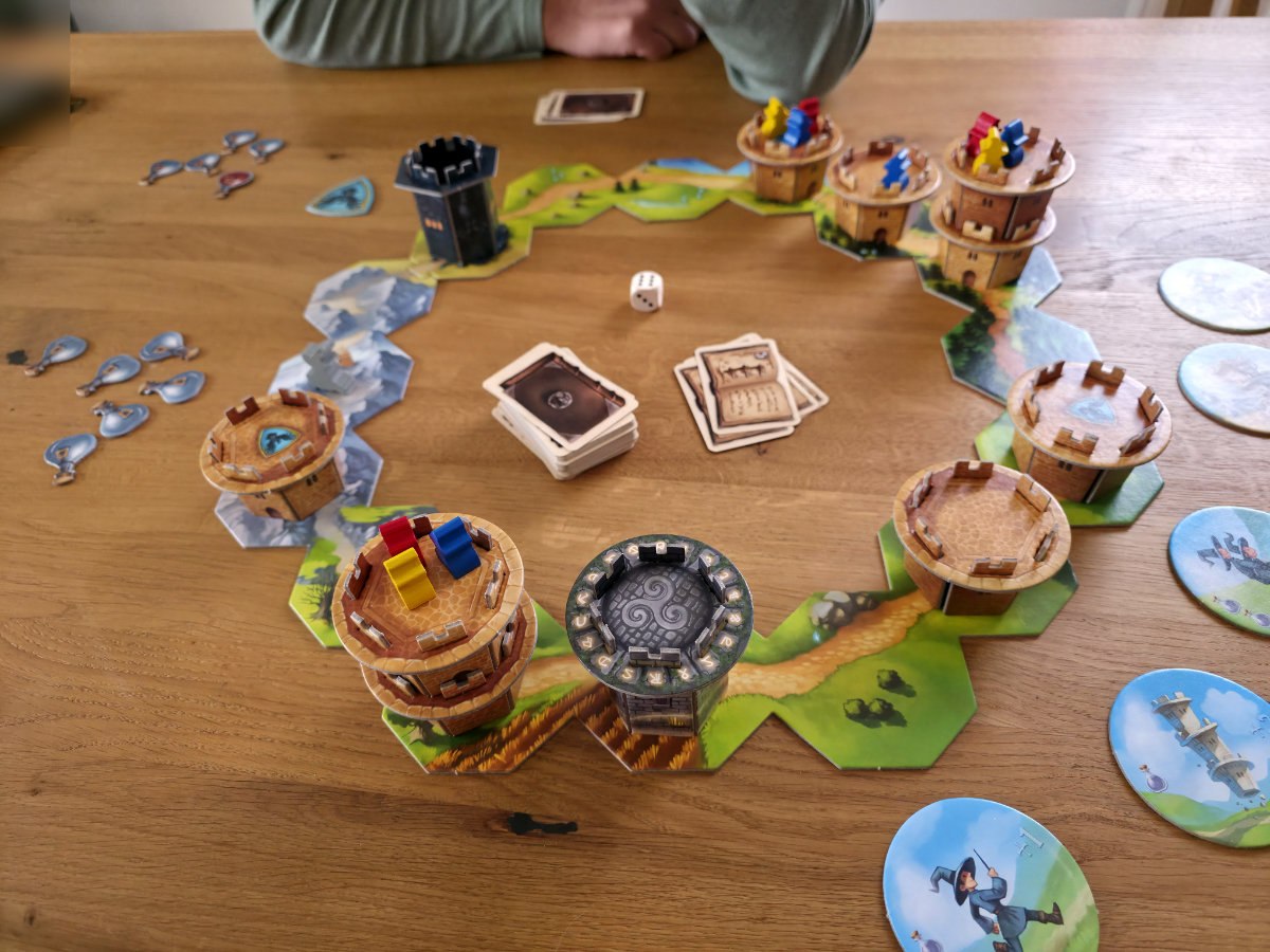 Die Türme sind nicht bloß Kulisse, sondern echte Spielfiguren. Sie können Magier „einsammeln“ und unter sich begraben. Wer verschluckt wird, ist aber nicht verloren, sondern wartet darauf, durch clevere Spielzüge oder Zauber wieder befreit zu werden – aber er verliert eine Zaubertrankessenz. Außerdem können sich die Türme stapeln, wenn sie auf ein besetztes Feld gezogen werden, so können riesige Turmbauten entstehen – und zugleich wird so erschwert sich zu merken, wo eventuell der eigene Magier „versteckt“ ist. Wer aber gut in „Memory“ ist, kann so u.U. Türme samt Magier so fortbewegen, dass sie sich der Rabenburg nähern :).