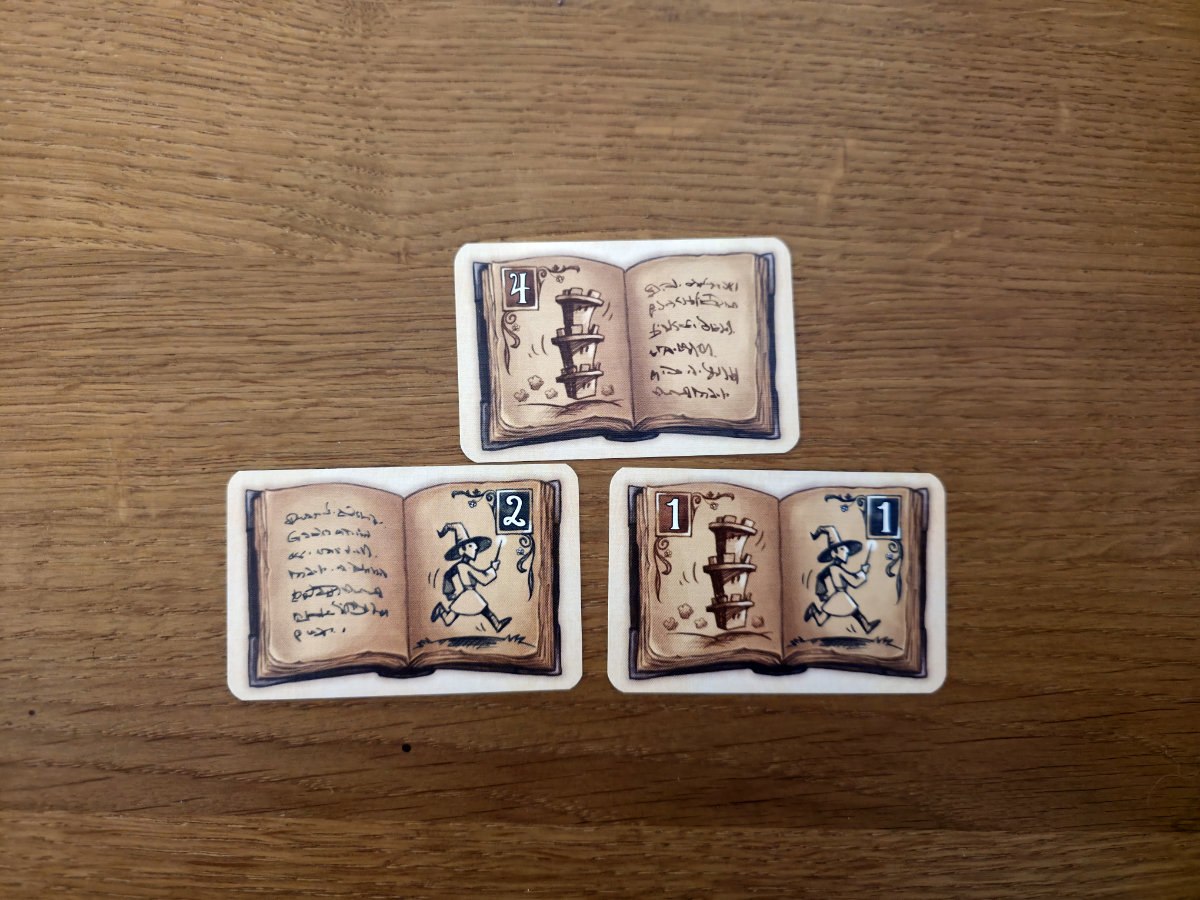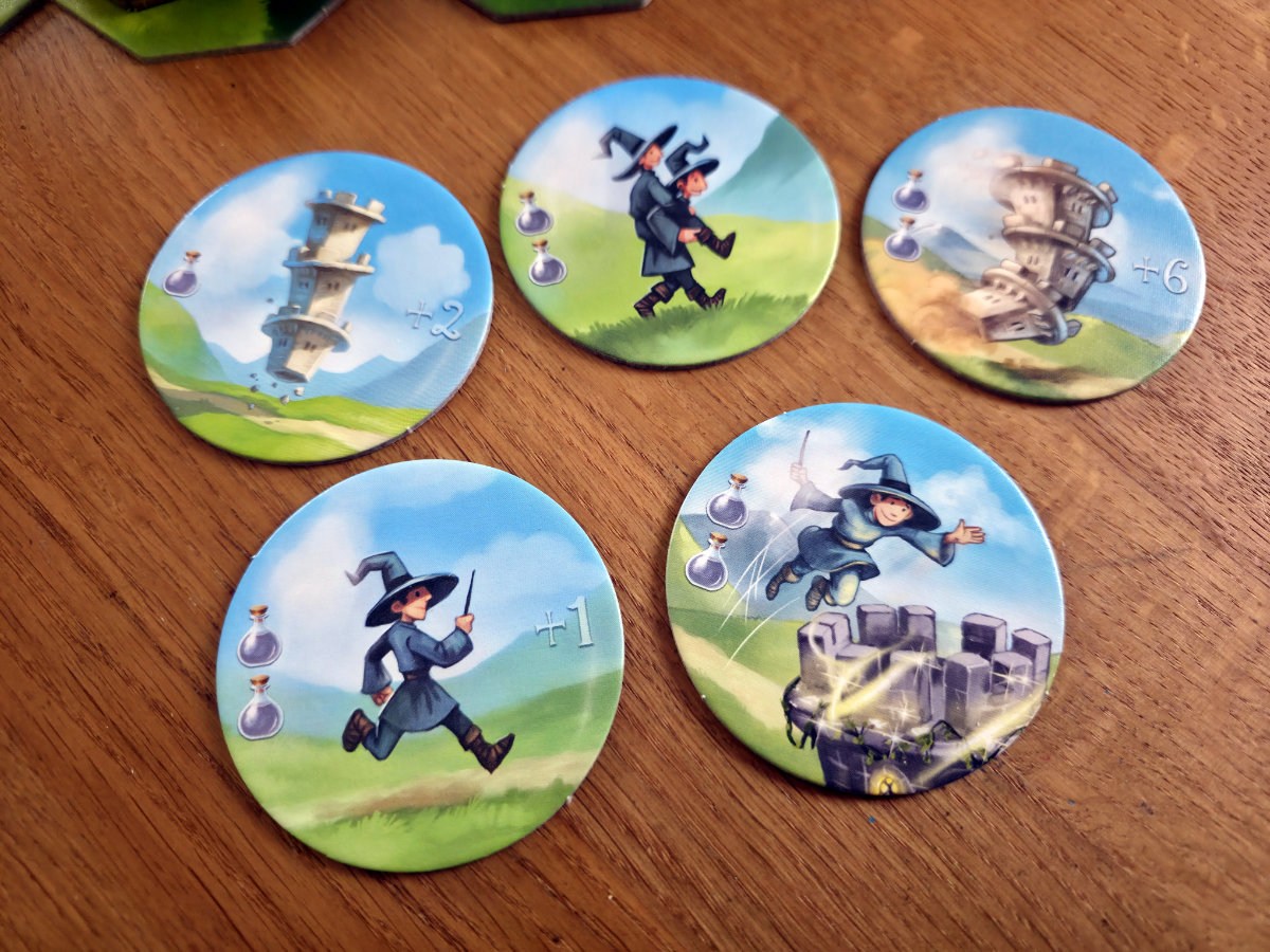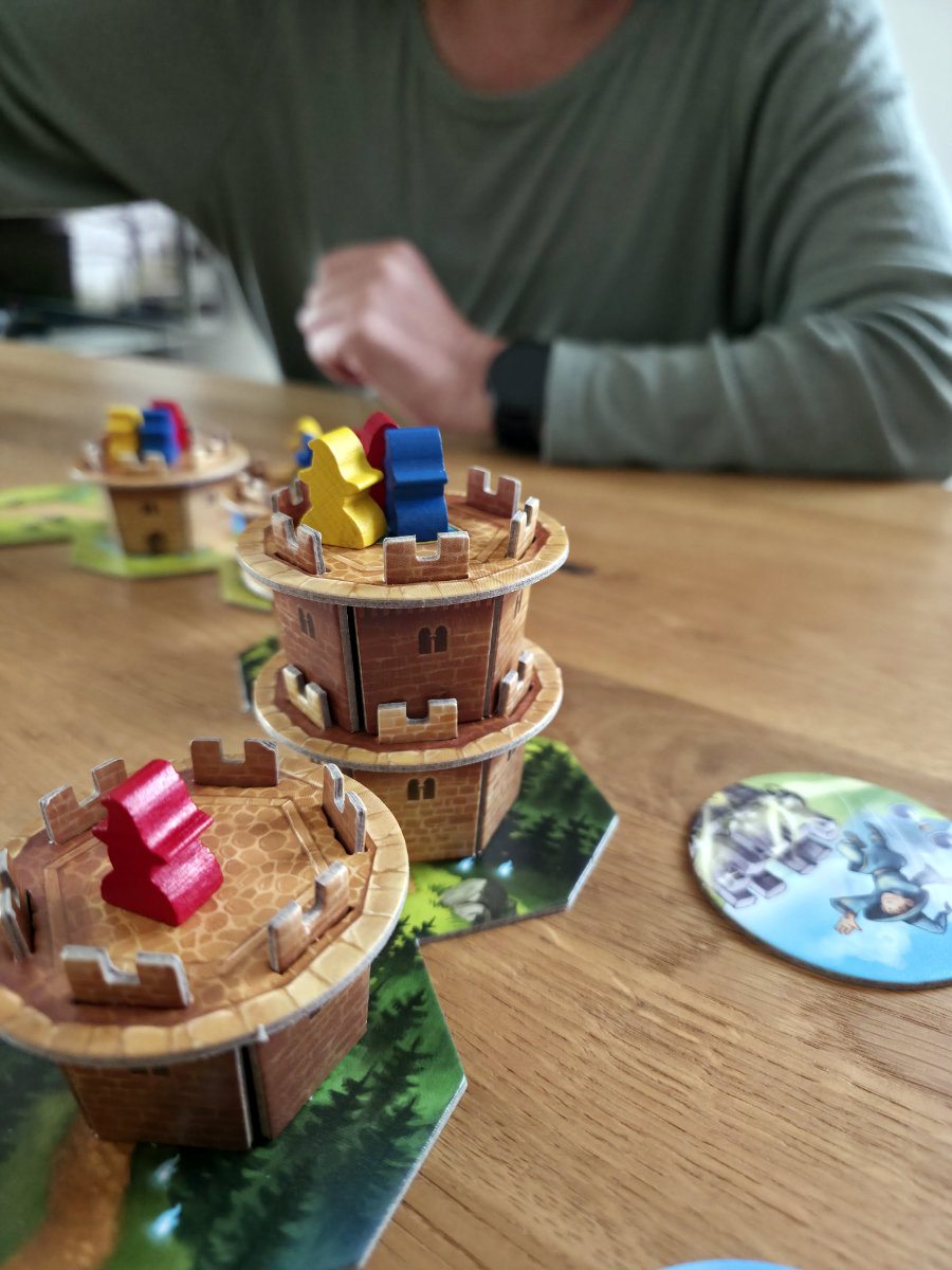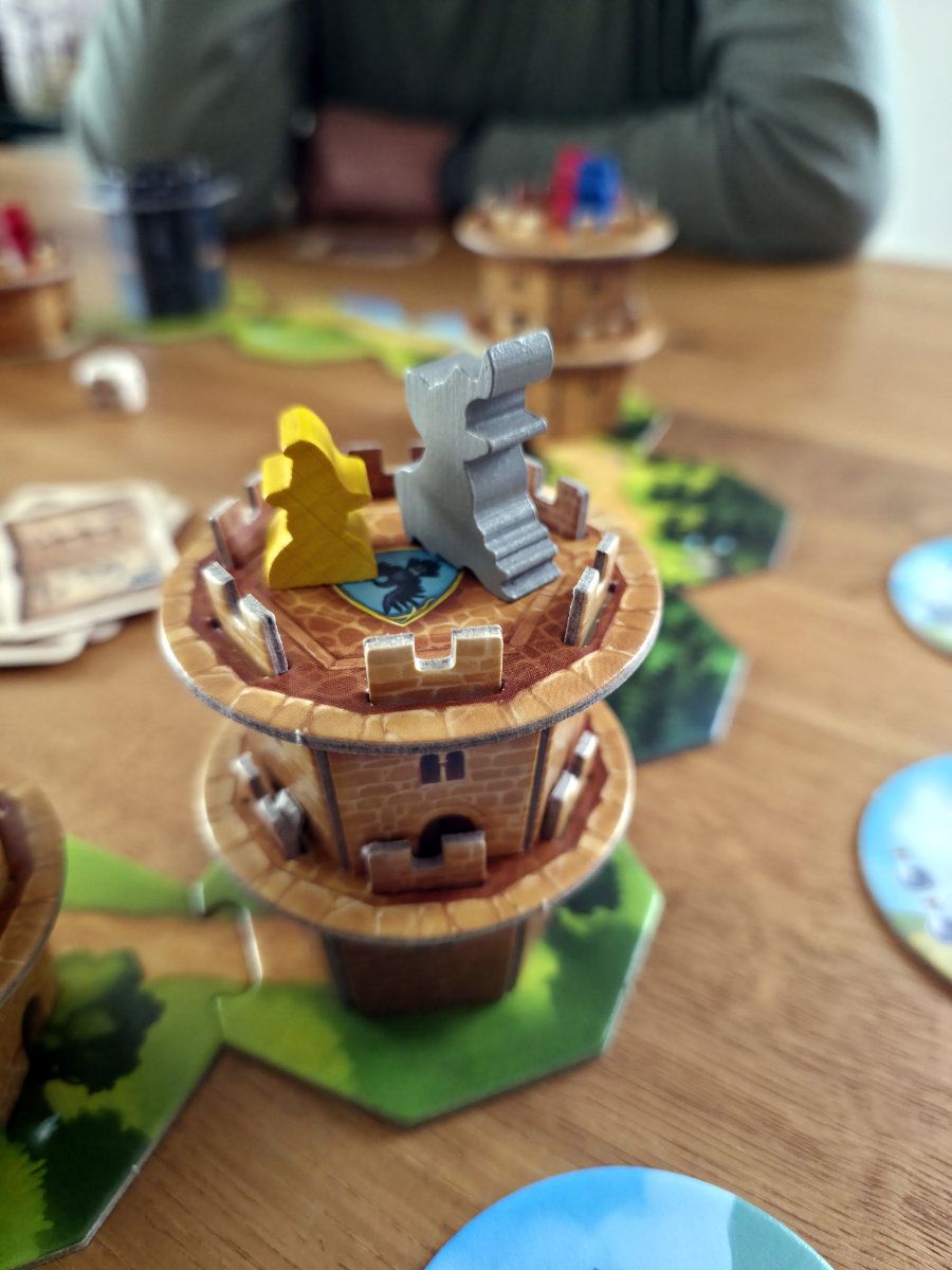Die Türme sind nicht bloß Kulisse, sondern echte Spielfiguren. Sie können Magier „einsammeln“ und unter sich begraben. Wer verschluckt wird, ist aber nicht verloren, sondern wartet darauf, durch clevere Spielzüge oder Zauber wieder befreit zu werden – aber er verliert eine Zaubertrankessenz. Außerdem können sich die Türme stapeln, wenn sie auf ein besetztes Feld gezogen werden, so können riesige Turmbauten entstehen – und zugleich wird so erschwert sich zu merken, wo eventuell der eigene Magier „versteckt“ ist. Wer aber gut in „Memory“ ist, kann so u.U. Türme samt Magier so fortbewegen, dass sie sich der Rabenburg nähern :).