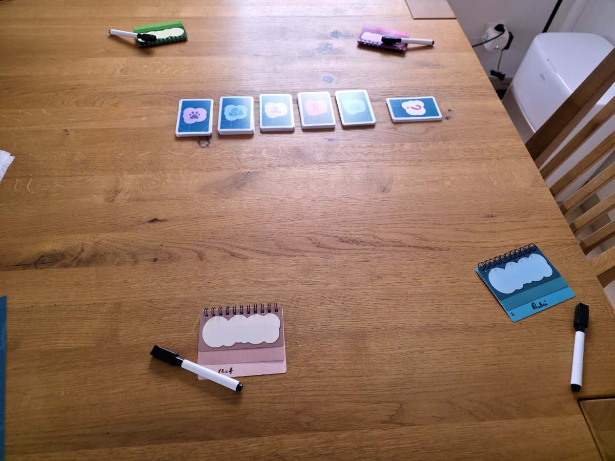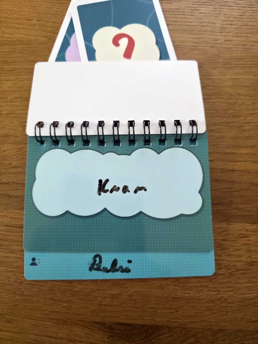 Man stelle sich vor: jeder Spieler hat nur ein einziges Wort, um einen geheimen Begriff zu umschreiben. Klingt einfach? Denkste! Denn auf der Aufgaben-Karte stehen gleich sechs mögliche Wörter, und nur eines davon ist das gesuchte. Welches es ist, verrät eine Zahlenkarte. Nun beginnt der wilde Ritt. Der erste Spieler gibt ein Wort als Hinweis, der nächste muss daraus ein neues Wort ableiten, und so wandert die Assoziationskette weiter – in Form von kleinen Ringbüchlein, die mit Spielernamen (zum Nachvollziehen) und eben einer Assoziation versehen werden. Am Ende muss geraten werden, welches der sechs Wörter ursprünglich gemeint war.