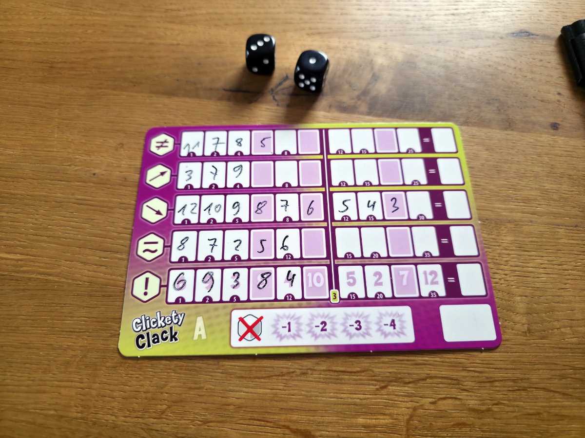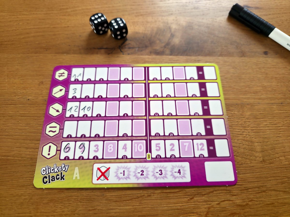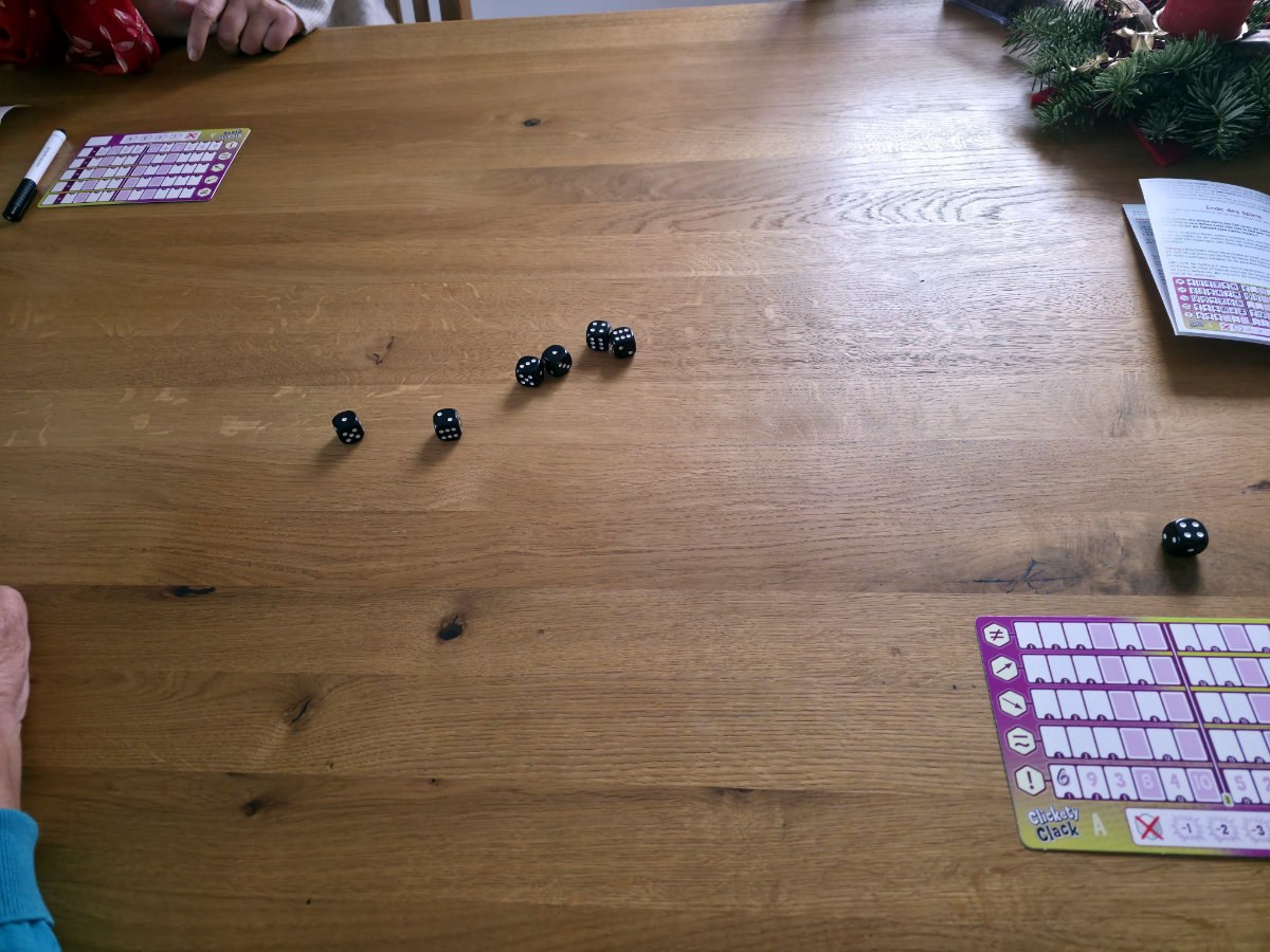 Der Ablauf ist schnell erklärt. In jeder Runde werden Würfel geworfen, die Auslage präsentiert die möglichen Werte und die Spieler entscheiden, welchen Würfel sie nehmen und mit welchem sie ihn „klacken“, um die Summe auf ihrer Tafel zu notieren. Das sorgt für kleine taktische Entscheidungen – nehme ich lieber eine sichere Zahl, die gerade passt, oder wage ich eine riskantere Kombination, die mir später mehr Optionen eröffnet?