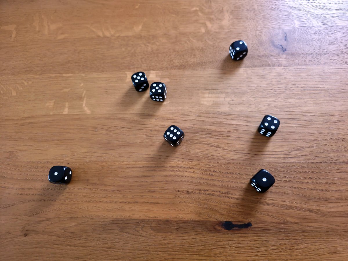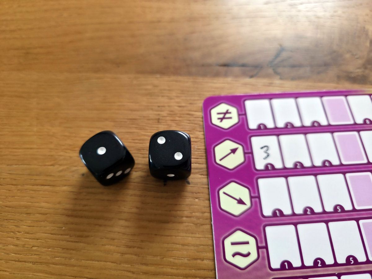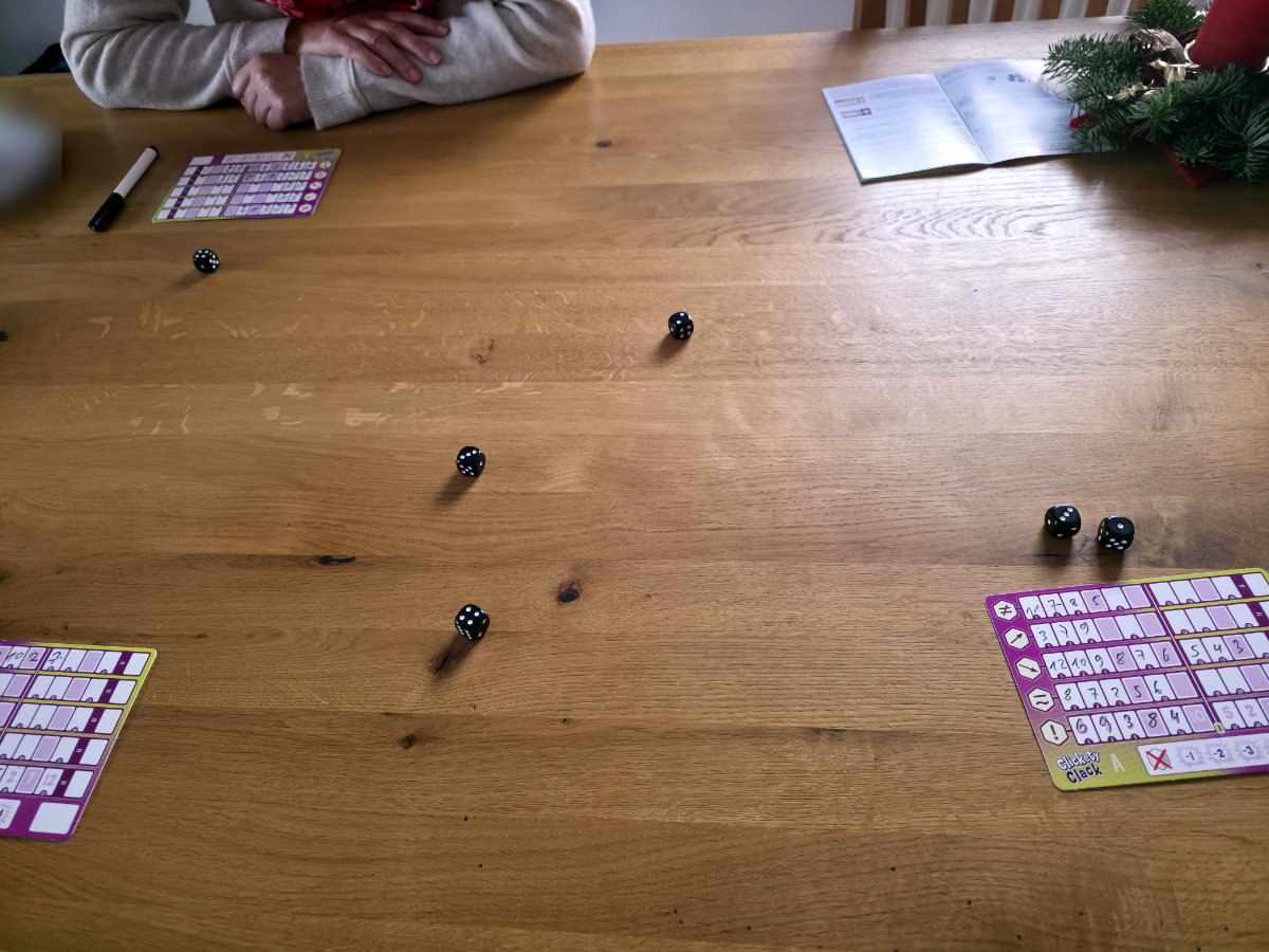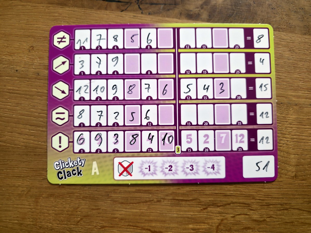 Der Ablauf ist schnell erklärt. In jeder Runde werden Würfel geworfen, die Auslage präsentiert die möglichen Werte und die Spieler entscheiden, welchen Würfel sie nehmen und mit welchem sie ihn „klacken“, um die Summe auf ihrer Tafel zu notieren. Das sorgt für kleine taktische Entscheidungen – nehme ich lieber eine sichere Zahl, die gerade passt, oder wage ich eine riskantere Kombination, die mir später mehr Optionen eröffnet?